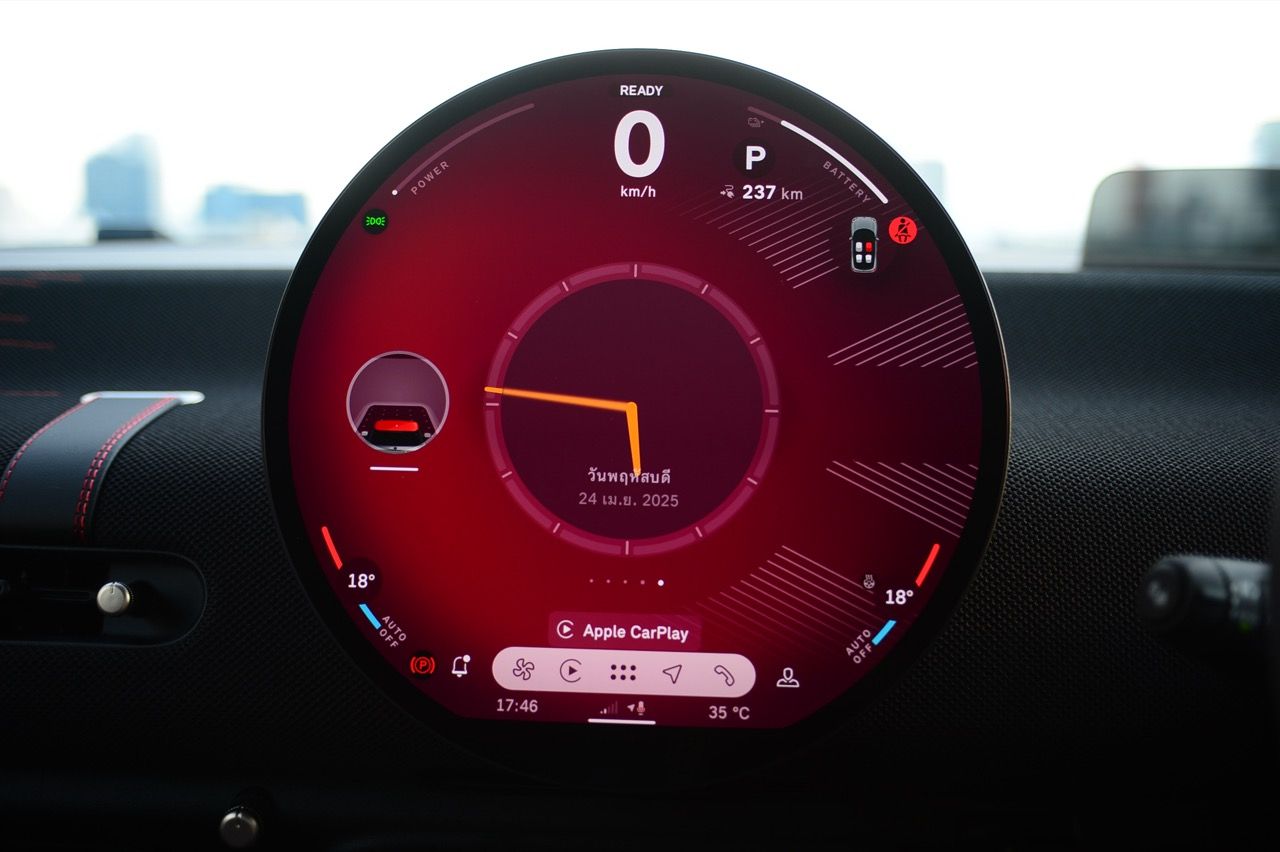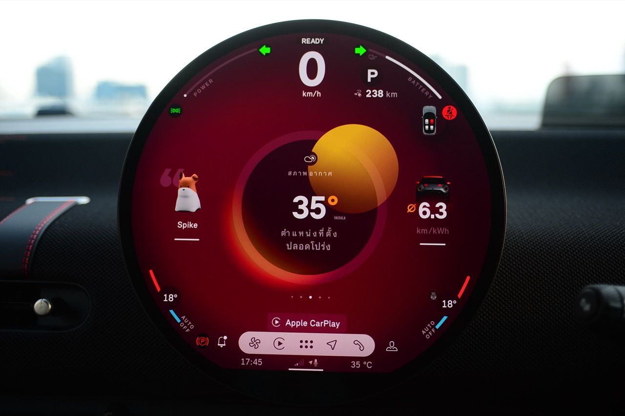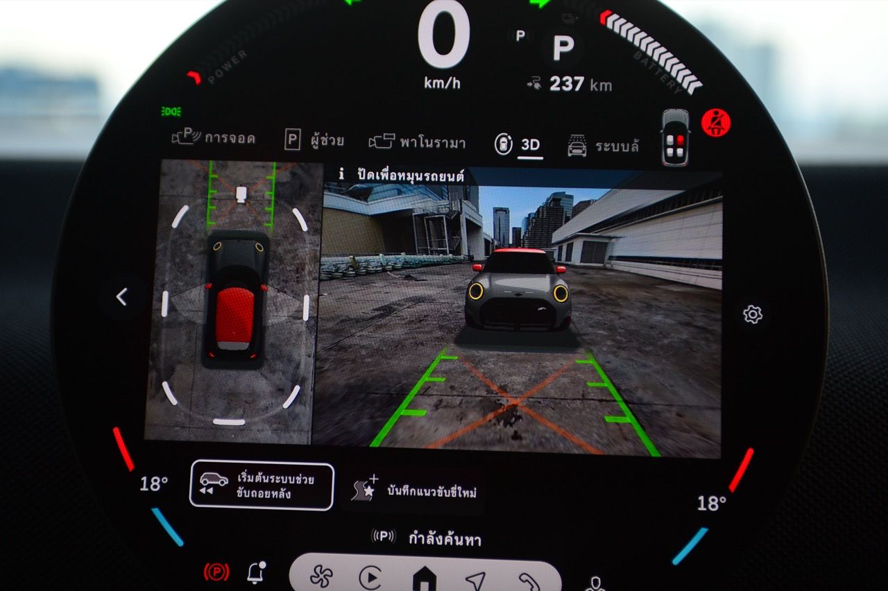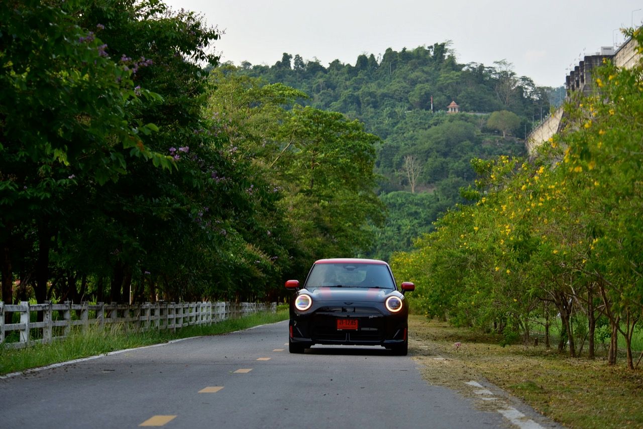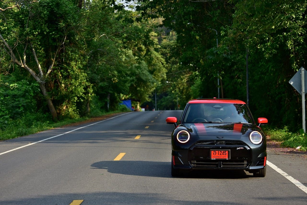 MINI John Cooper Works Electric มีโหมดขับเคลื่อนให้เลือกถึง 7 โหมด และโหมดต่างๆจะปรับแต่งแสงไฟภายในห้องโดยสารแตกต่างกันไปตามสไตล์ของแต่ละโหมด ผมใช้เส้นทางรังสิต-องค์รักษ์ มุ่งหน้าไปทางจังหวัดนครนายก ไปจนถึงชายขอบของเขาใหญ่ในฝั่งปราจีนบุรี โดยลองขับประคองความเร็วไม่มีการแวะชาร์จทั้งไปและกลับ เมื่อถนนโล่งก็ลองเปิด Adaptive Cruise Control ใช้ความเร็ว 70 กิโลเมตรต่อชั่วโมง Cooper JCW EV ที่ความเร็วต่ำกินไฟน้อยลงไปมากจากความเร็ว 100-120 กิโลเมตรต่อชั่วโมง วิ่งแค่ 70 กิโลเมตรต่อชั่วโมงดูจะขัดแย้งกับความเป็น JCW แต่ไม่อยากมีปัญหาขากลับเรื่องไฟไม่พอ เพราะแบตเตอรี่ไม่ได้ใหญ่โตอะไร ลองขับแบบเมามันกระชากพรวดปรากฏว่ากระแสไฟในแบตหล่นวูบจนต้องกลับมาขับแบบหวานเย็นเพราะระยะทางไปกลับเฉียดๆ 250 กิโลเมตร หากซัดแบบไม่ลืมหูลืมตาน่าจะไม่รอดไฟหมดก่อนกลับถึงบ้านแน่ๆ