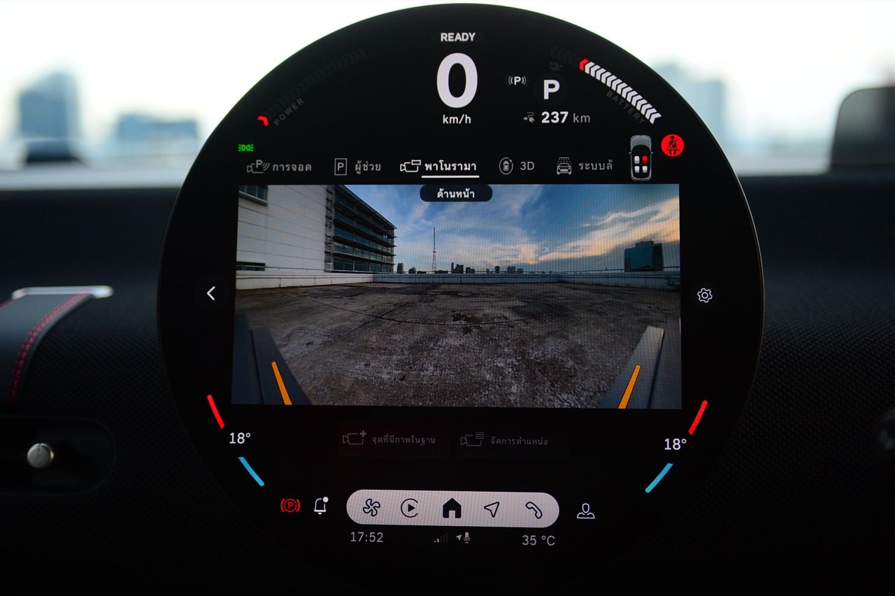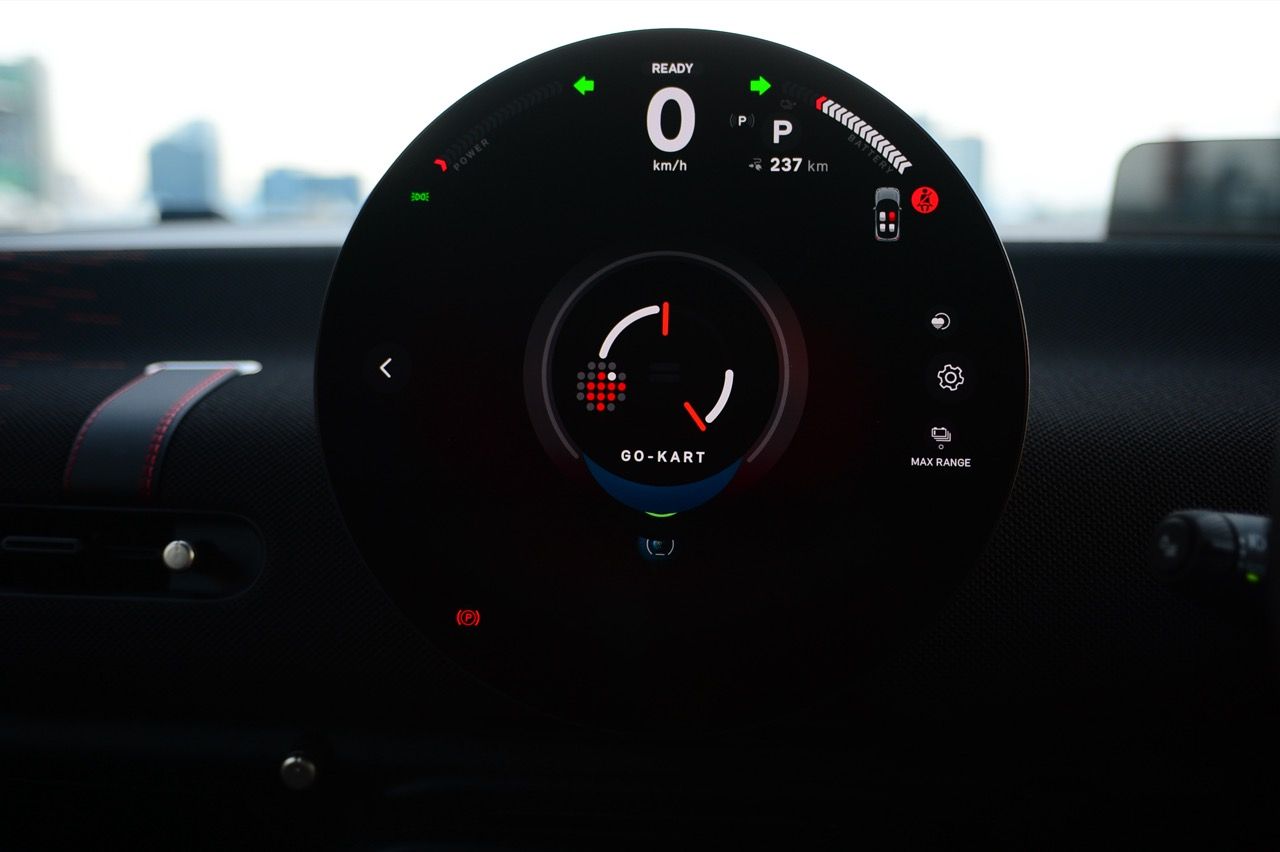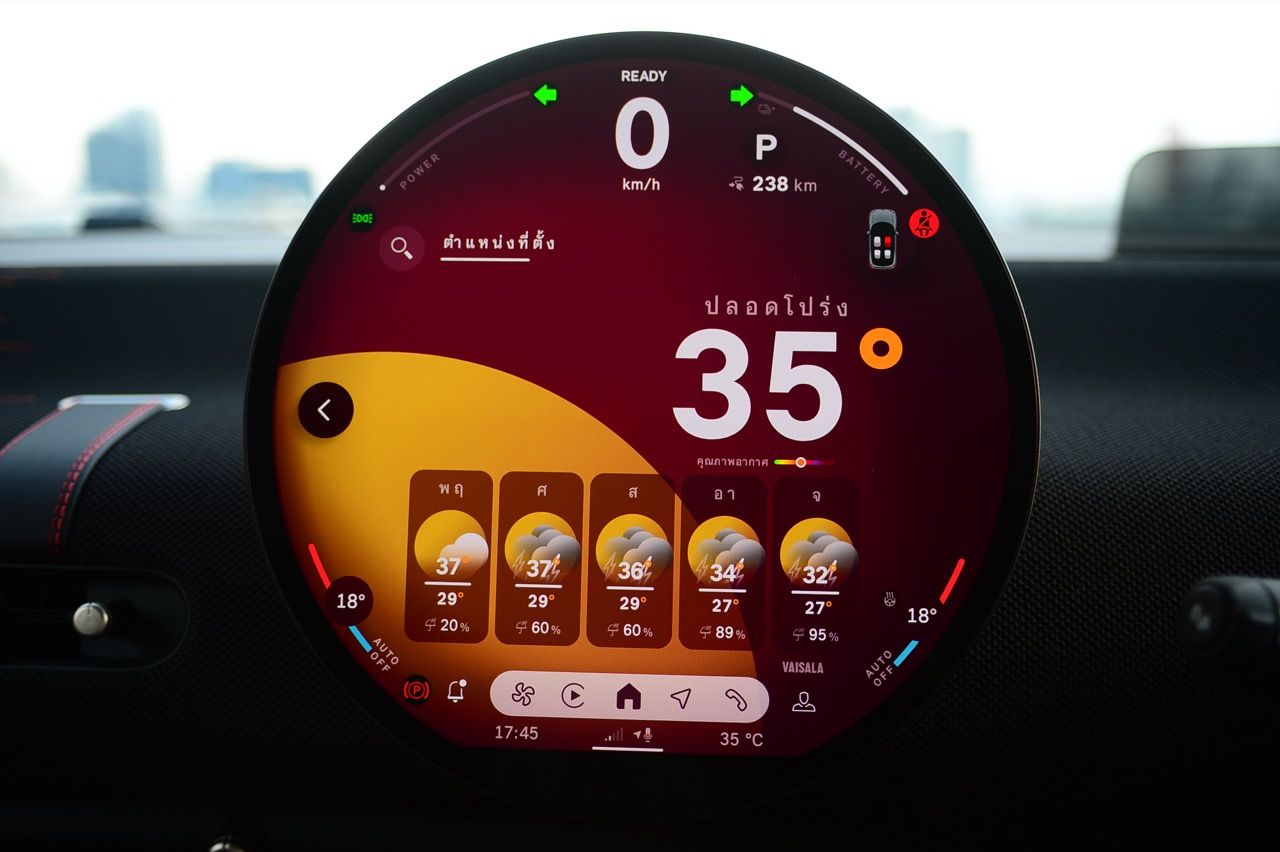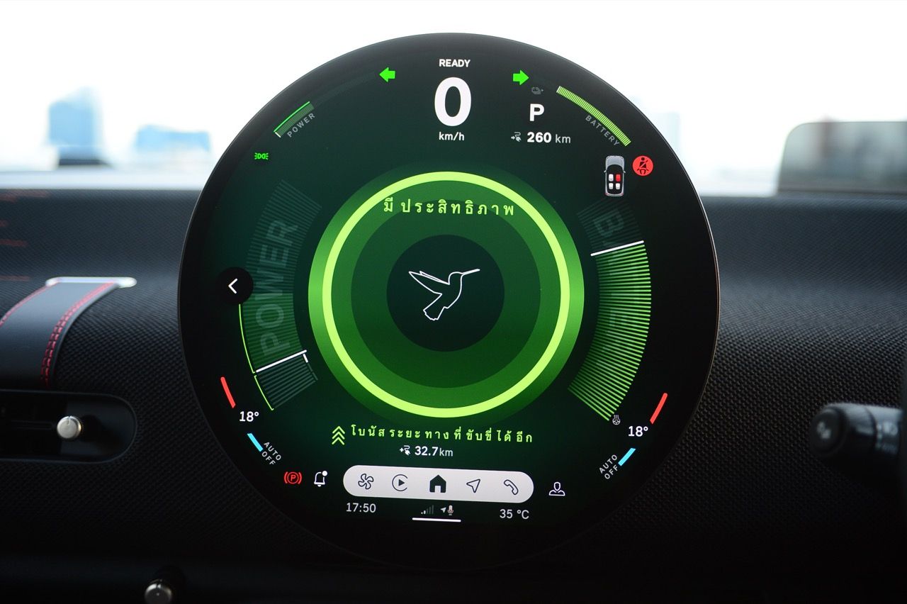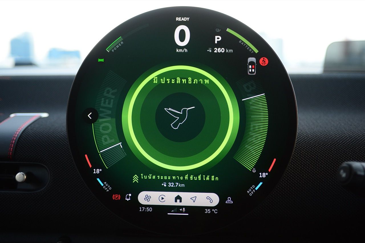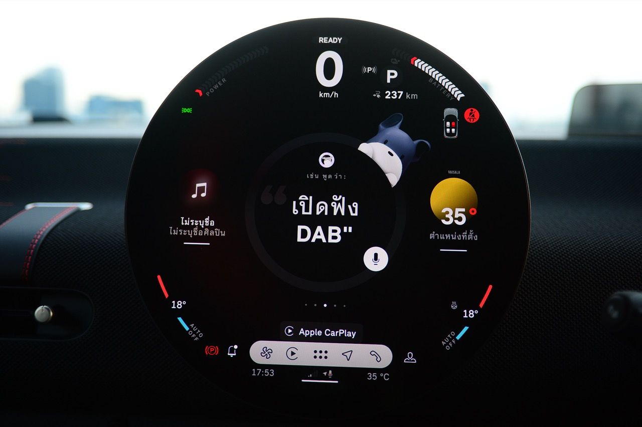 MINI John Cooper Works Electric มีโหมดขับเคลื่อนให้เลือกถึง 7 โหมด และโหมดต่างๆจะปรับแต่งแสงไฟภายในห้องโดยสารแตกต่างกันไปตามสไตล์ของแต่ละโหมด ผมใช้เส้นทางรังสิต-องค์รักษ์ มุ่งหน้าไปทางจังหวัดนครนายก ไปจนถึงชายขอบของเขาใหญ่ในฝั่งปราจีนบุรี โดยลองขับประคองความเร็วไม่มีการแวะชาร์จทั้งไปและกลับ เมื่อถนนโล่งก็ลองเปิด Adaptive Cruise Control ใช้ความเร็ว 70 กิโลเมตรต่อชั่วโมง Cooper JCW EV ที่ความเร็วต่ำกินไฟน้อยลงไปมากจากความเร็ว 100-120 กิโลเมตรต่อชั่วโมง วิ่งแค่ 70 กิโลเมตรต่อชั่วโมงดูจะขัดแย้งกับความเป็น JCW แต่ไม่อยากมีปัญหาขากลับเรื่องไฟไม่พอ เพราะแบตเตอรี่ไม่ได้ใหญ่โตอะไร ลองขับแบบเมามันกระชากพรวดปรากฏว่ากระแสไฟในแบตหล่นวูบจนต้องกลับมาขับแบบหวานเย็นเพราะระยะทางไปกลับเฉียดๆ 250 กิโลเมตร หากซัดแบบไม่ลืมหูลืมตาน่าจะไม่รอดไฟหมดก่อนกลับถึงบ้านแน่ๆ