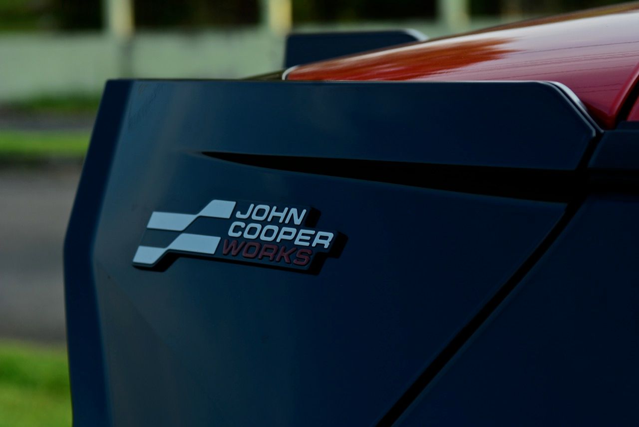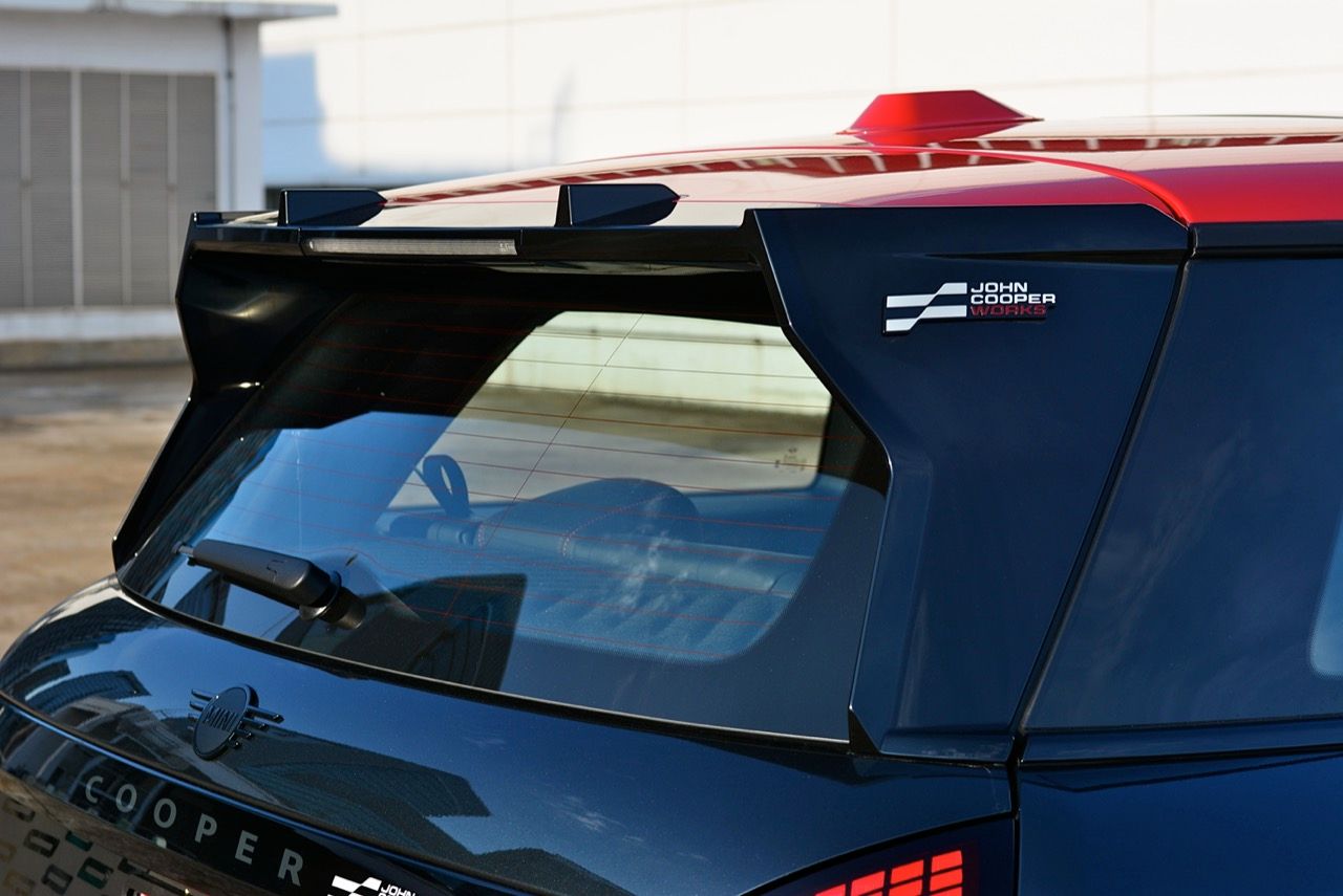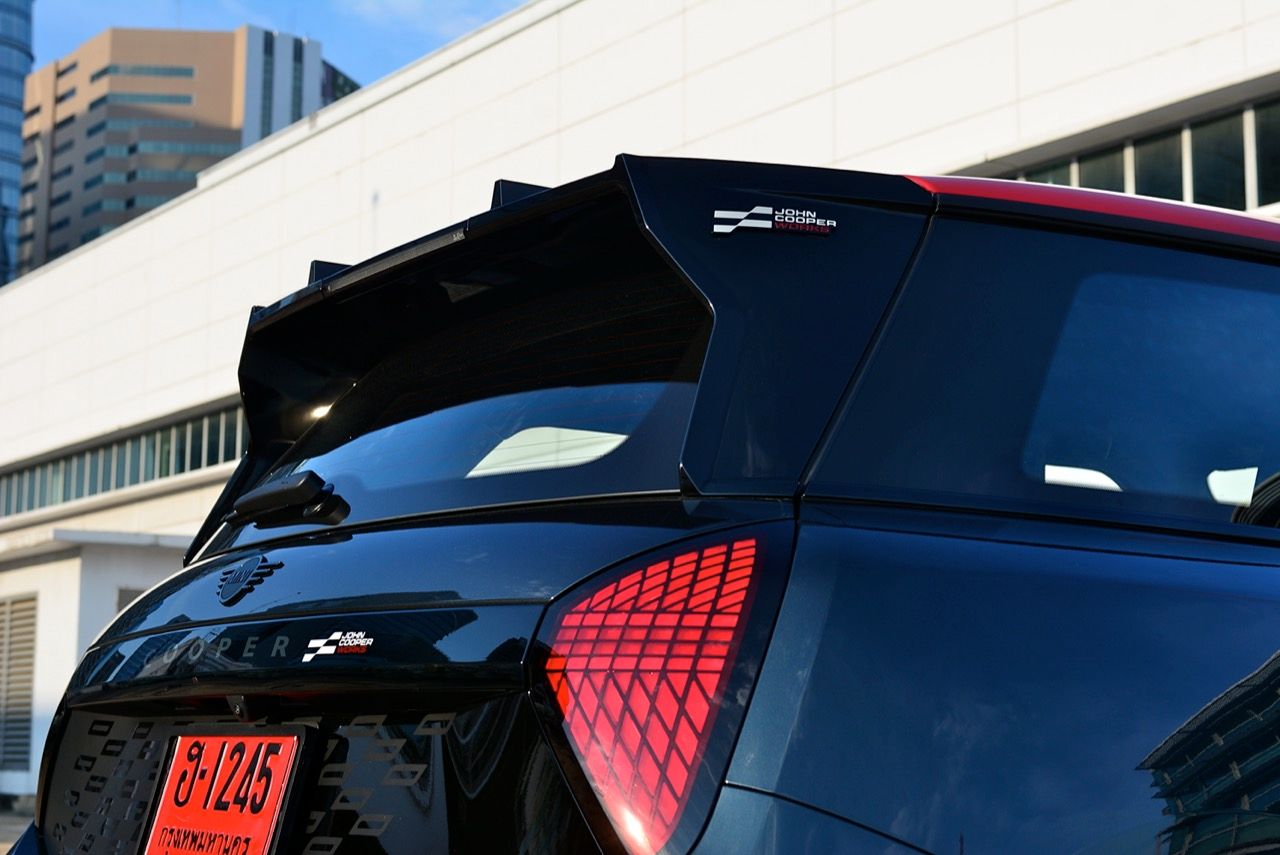 มีการเพิ่มรายละเอียดใหม่เพื่อให้แตกต่างจาก Cooper SE ทั่วไป ชุดแต่ง JCW พร้อมสเกิร์ตข้างสีดำ แอโรเบลดบนเสา C สปอยเลอร์หลังขนาดใหญ่ ขอบสีดำเงาและแผ่นสะท้อนแสงแนวตั้งสีแดงที่มุมทั้งสี่ ลวดลายธงตาหมากรุกบริเวณรอบป้ายทะเบียนด้านหลัง ทั้งหมด เป็นรายละเอียดที่สวยงาม ล้ออัลลอยด์ John Cooper Works ขนาด 18 นิ้ว ลายใหม่เน้นลู่ลม ซ่อนคาลิปเปอร์เบรกสีแดง พร้อมโลโก้ JCW เป็นอุปกรณ์มาตรฐาน ยางสปอร์ตประสิทธิภาพสูง Michelin Pilot Sport 5 225/40ZR1892Y มันยังมาพร้อมหลังคาและฝาครอบกระจกมองข้างสีแดง การเลือกไล่เฉดสีแดงกับดำเก๋ไก๋ตามสไตล์ของ John Cooper Works ที่อยู่ภายใต้ร่มเงาของ BMW Group