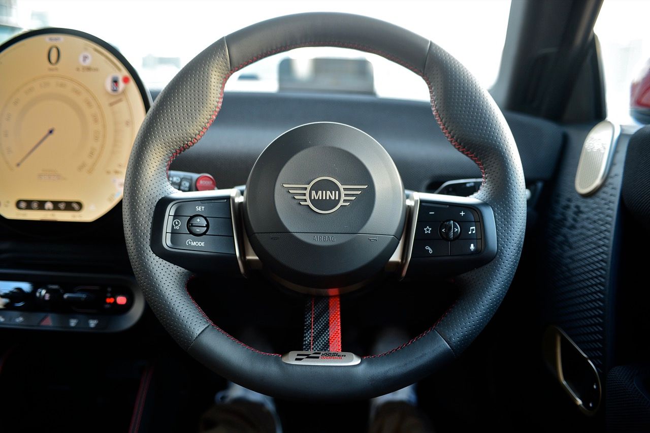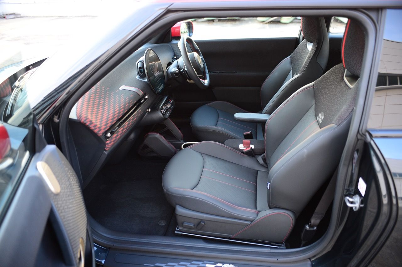 ห้องโดยสารโทนสีแดง-ดำ เอกลักษณ์ของ MINI JCW พวงมาลัยสปอร์ต JCW สีดำที่ประดับด้วยตะเข็บสีแดงและหุ้มผ้าที่ตำแหน่ง 6 นาฬิกาเพื่อให้จับถนัดมือ เบาะสปอร์ต JCW ให้การรองรับที่มั่นคงระหว่างการขับขี่แบบสุดตัว ตกแต่งด้วยตะเข็บสีแดง ตัดกับหนังเทียมสีดำเช่นเดียวกับผิวหน้า ของคอนโซล นอกจากนี้ ระบบ MINI Experience Modes ในรุ่นนี้ ยังมีโหมด Go-Kart ที่เพิ่มเข้ามาสำหรับรถยนต์ ตระกูล JCW โดยเฉพาะเพื่อเติมกลิ่นอายของมอเตอร์สปอร์ตให้เข้มข้นยิ่งขึ้น โดยโหมดนี้จะตั้งค่าพวงมาลัย ให้ไวมากขึ้น คันเร่งตอบสนองเร็วขึ้น และแสดงข้อมูลเพิ่มเติมบนหน้าจอ OLED ทรงกลมด้านหน้า ทั้งแรงบิด กำลังเครื่องยนต์ และแรง G แบบเรียลไทม์