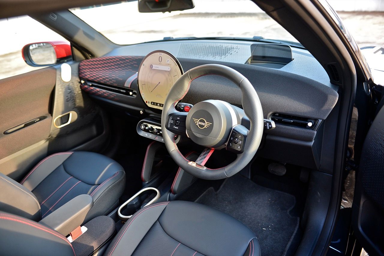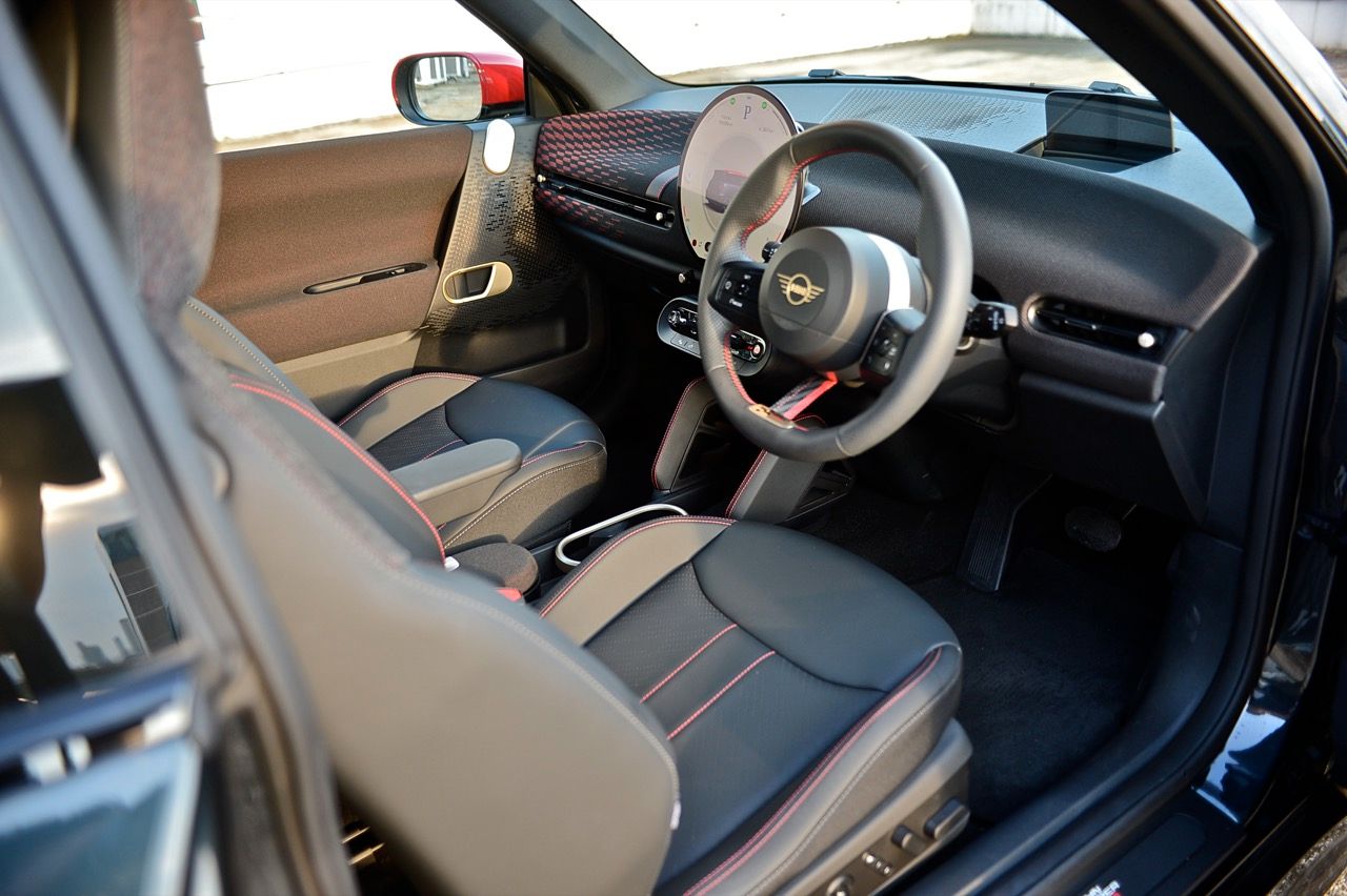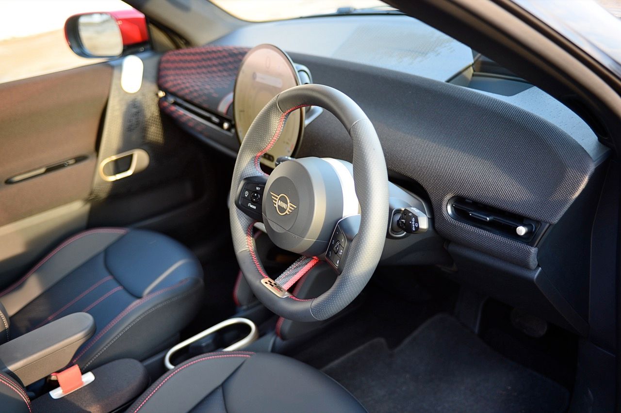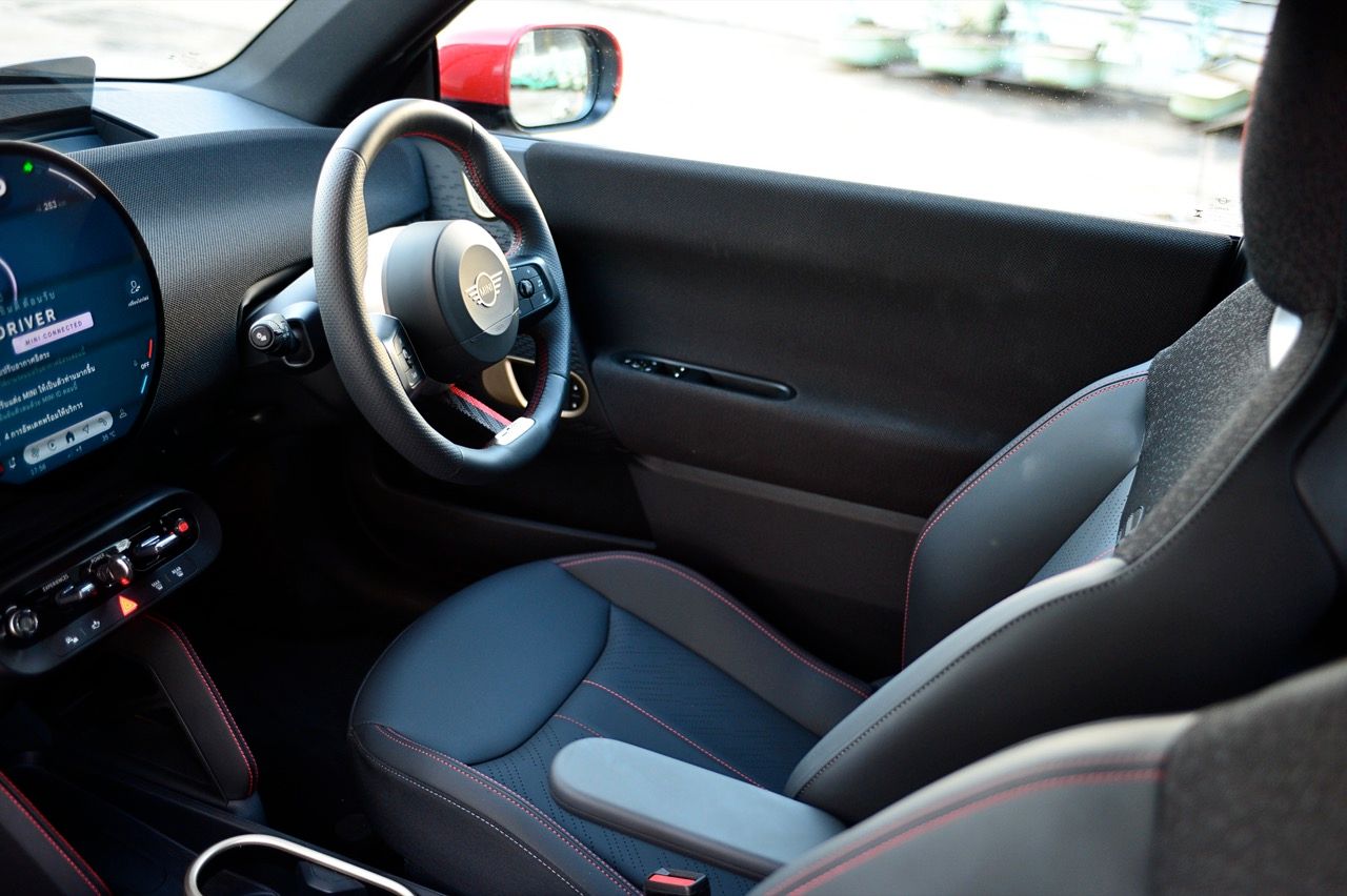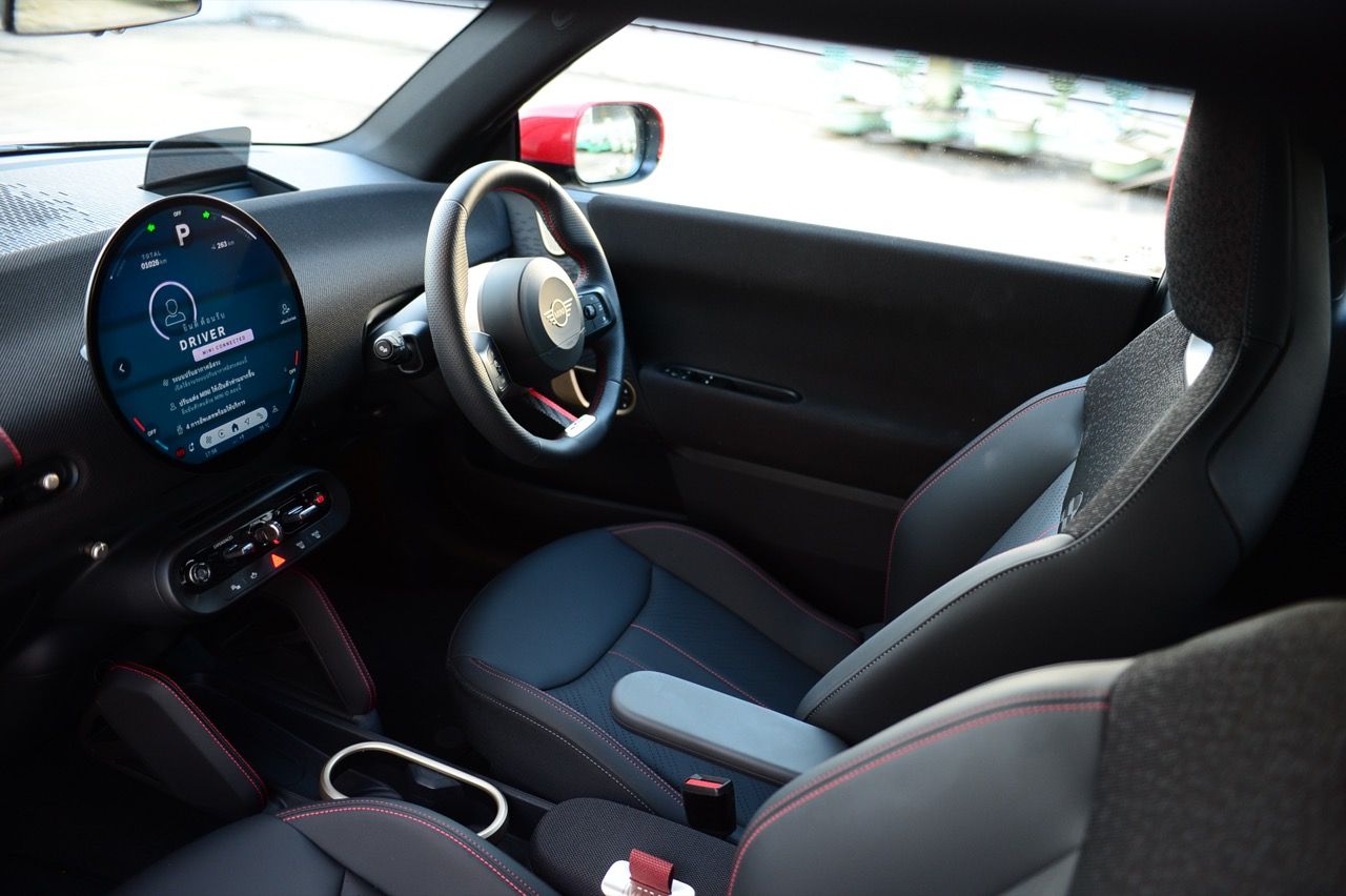ภายในเบาะนั่งตกแต่งด้วยหนังสังเคราะห์ มีผ้าถักด้วยใยสังเคราะห์ที่เป็นมิตรกับธรรมชาติ แบบเดียวกับที่พบใน Cooper E ตกแต่งบนแผงหน้าปัดและบานประตู หน้าจอ OLED แบบวงกลมขนาด 9.4 นิ้วตรงกลางแผงหน้าปัดซึ่งให้การควบคุมอินโฟเทนเมนต์ ซึ่งก็เหมือนกับสิ่งที่คุณจะได้รับใน Cooper E ซึ่งเราชอบหน้าจอสัมผัสที่ตอบสนองได้ดี แต่เค้าโครงอาจจะทำให้สับสนได้ และเราชอบระบบควบคุมแบบกายภาพสำหรับเครื่องปรับอากาศมากกว่าภายใน มีจอแสดงผลข้อมูลความบันเทิง OLED แบบวงกลมสุดเท่บนแดชบอร์ดแบบเรียบง่ายพร้อมสวิตช์ทางกายภาพเพียงไม่กี่ตัว เบาะนั่งแบบสปอร์ตหุ้มด้วยหนังเทียมพร้อมผ้าทอที่ไหล่ ลวดลายการถักทอแบบเดียวกันยังทอดยาวไปตามความกว้างของแผงหน้าปัดและแผงประตู เพิ่มความน่ารักจัดจ้านด้วยการใช้สีแดงเพิ่มเติมอีกสองสามจุด โดยเฉพาะที่พวงมาลัย ไฟส่องสว่างรอบห้องโดยสารแบบใหม่ที่แผงหลังคาก็ยังทำให้รถดูทันสมัยขึ้นอีกตะหาก