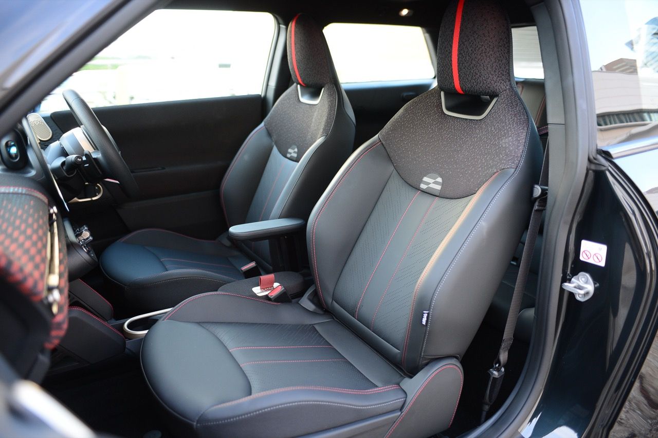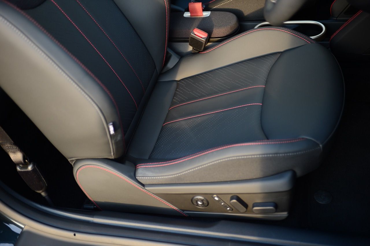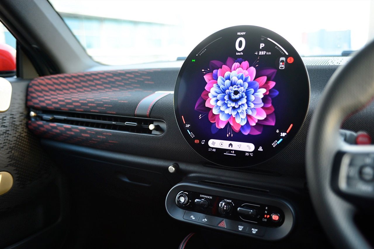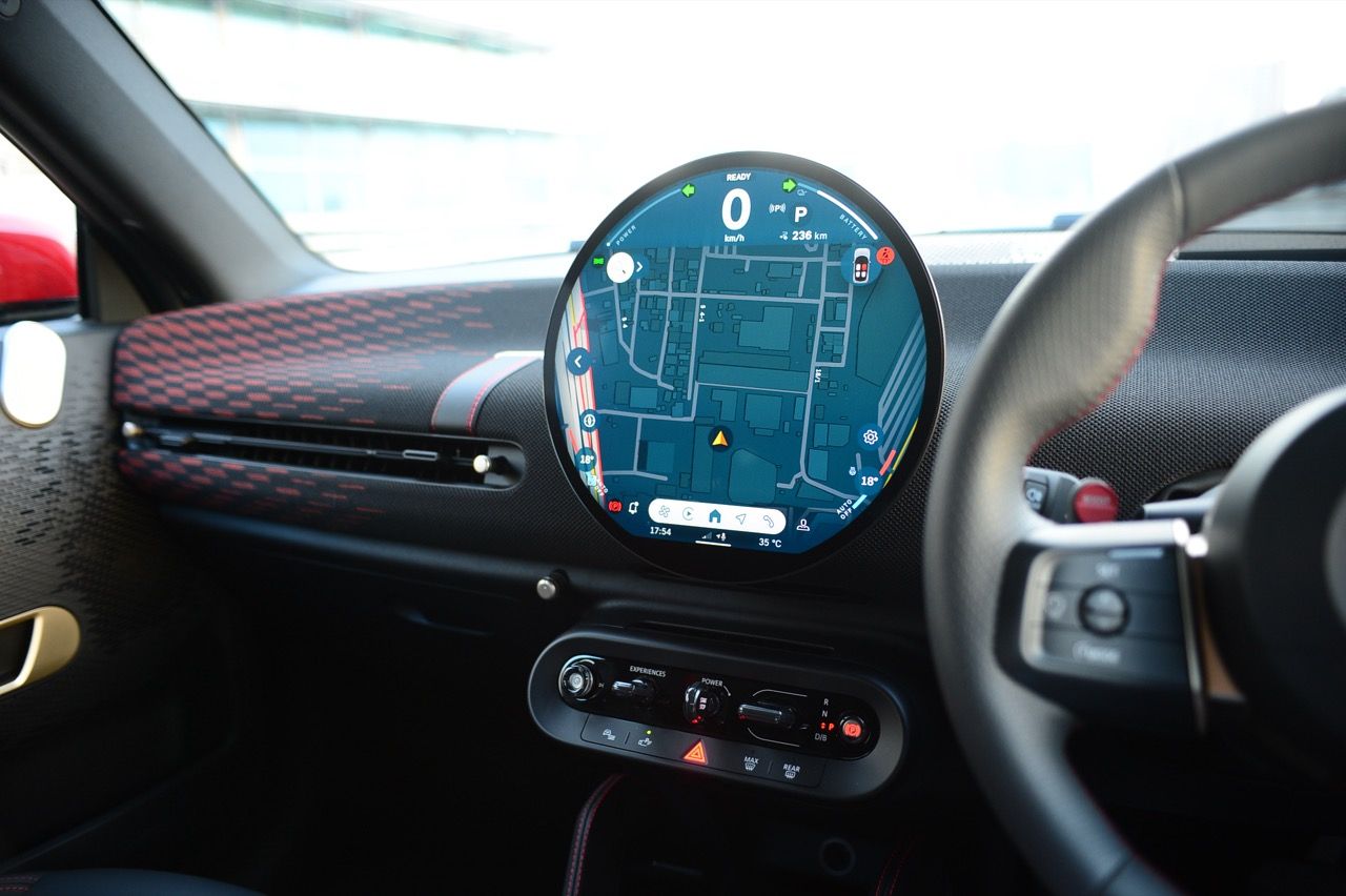 ภายในเบาะนั่งตกแต่งด้วยหนังสังเคราะห์ มีผ้าถักด้วยใยสังเคราะห์ที่เป็นมิตรกับธรรมชาติ แบบเดียวกับที่พบใน Cooper E ตกแต่งบนแผงหน้าปัดและบานประตู หน้าจอ OLED แบบวงกลมขนาด 9.4 นิ้วตรงกลางแผงหน้าปัดซึ่งให้การควบคุมอินโฟเทนเมนต์ ซึ่งก็เหมือนกับสิ่งที่คุณจะได้รับใน Cooper E ซึ่งเราชอบหน้าจอสัมผัสที่ตอบสนองได้ดี แต่เค้าโครงอาจจะทำให้สับสนได้ และเราชอบระบบควบคุมแบบกายภาพสำหรับเครื่องปรับอากาศมากกว่าภายใน มีจอแสดงผลข้อมูลความบันเทิง OLED แบบวงกลมสุดเท่บนแดชบอร์ดแบบเรียบง่ายพร้อมสวิตช์ทางกายภาพเพียงไม่กี่ตัว เบาะนั่งแบบสปอร์ตหุ้มด้วยหนังเทียมพร้อมผ้าทอที่ไหล่ ลวดลายการถักทอแบบเดียวกันยังทอดยาวไปตามความกว้างของแผงหน้าปัดและแผงประตู เพิ่มความน่ารักจัดจ้านด้วยการใช้สีแดงเพิ่มเติมอีกสองสามจุด โดยเฉพาะที่พวงมาลัย ไฟส่องสว่างรอบห้องโดยสารแบบใหม่ที่แผงหลังคาก็ยังทำให้รถดูทันสมัยขึ้นอีกตะหาก