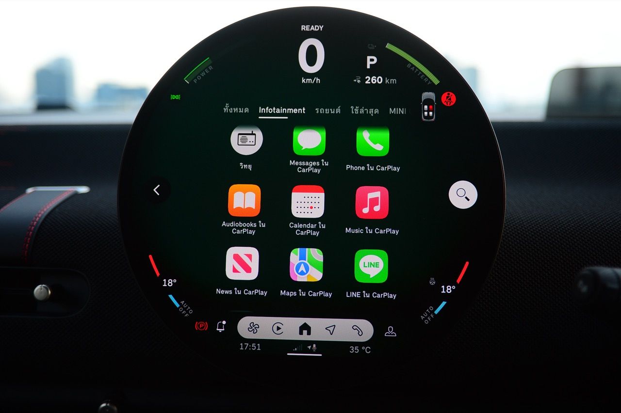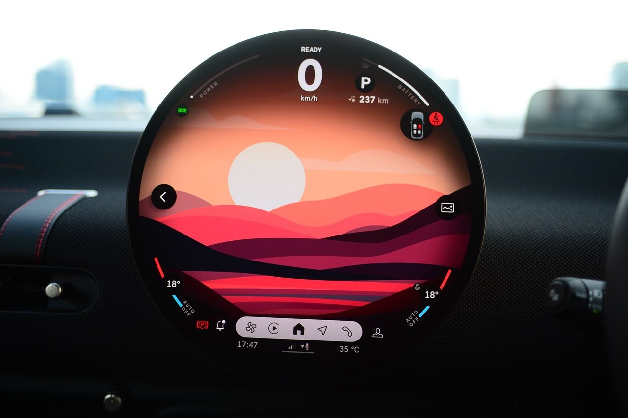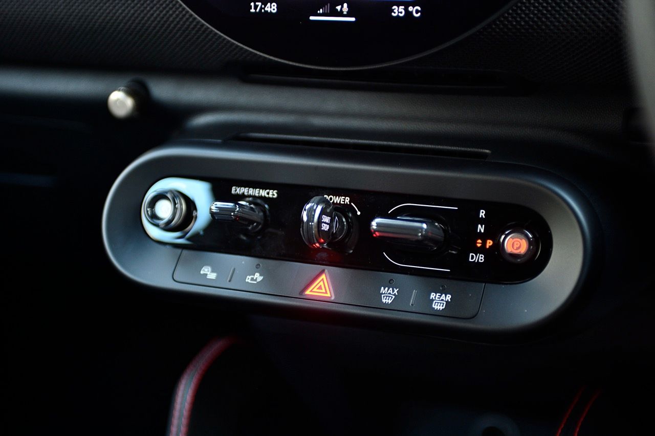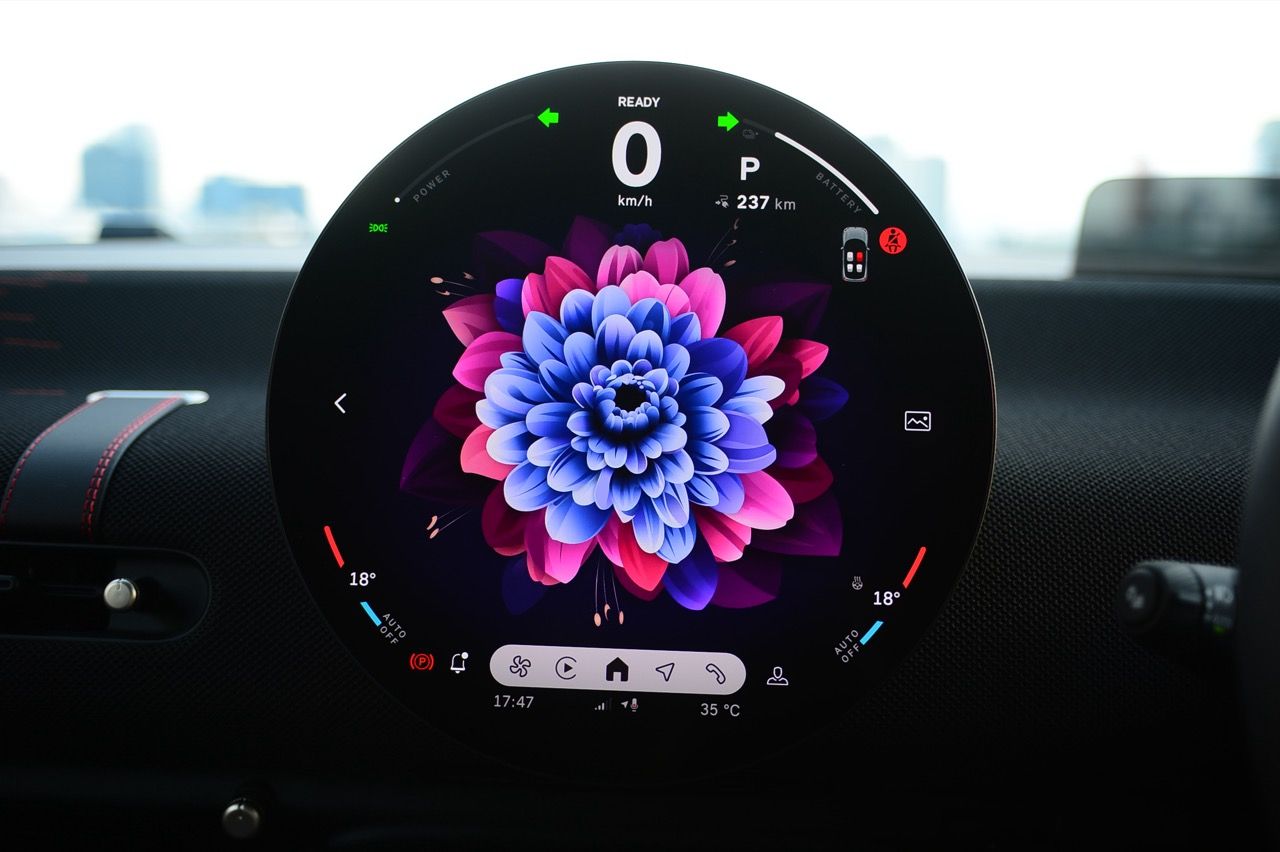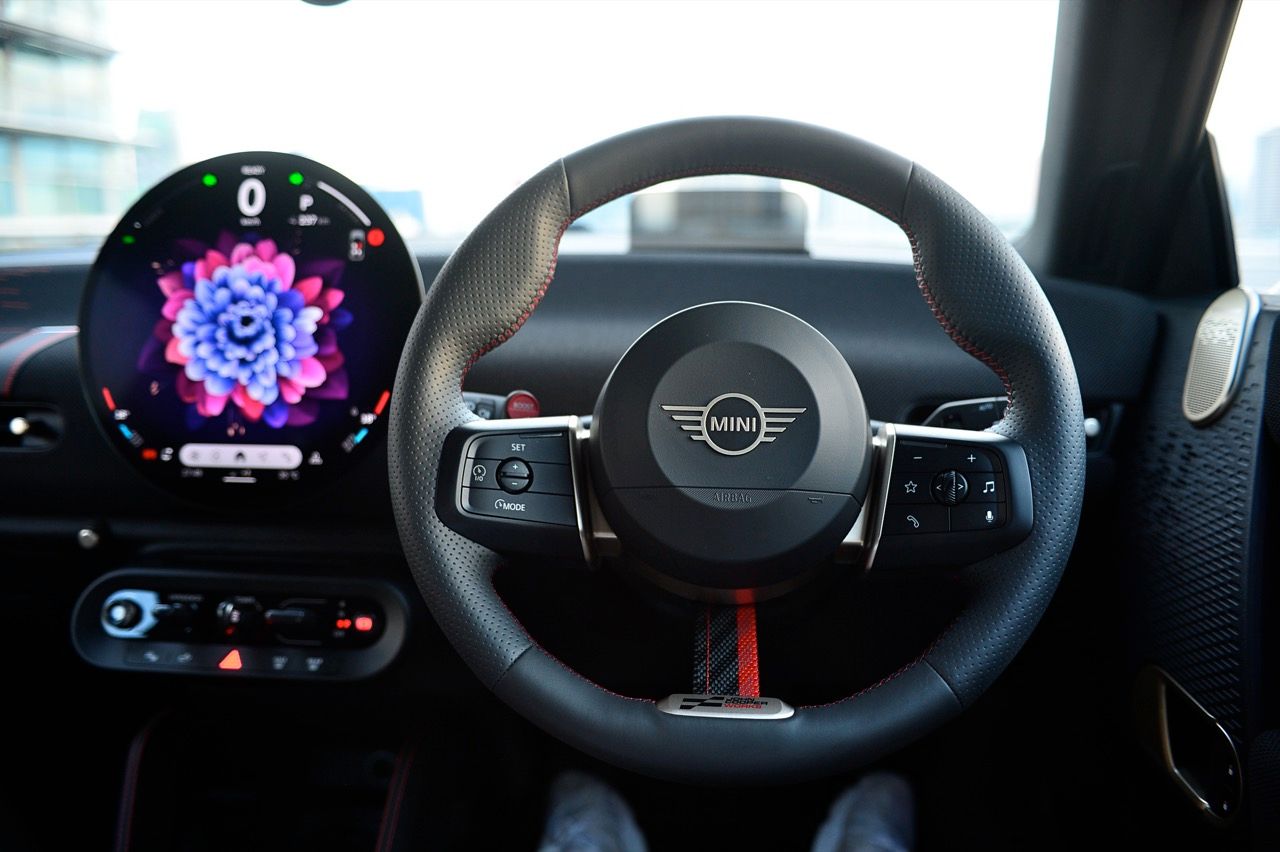 ภายในเบาะนั่งตกแต่งด้วยหนังสังเคราะห์ มีผ้าถักด้วยใยสังเคราะห์ที่เป็นมิตรกับธรรมชาติ แบบเดียวกับที่พบใน Cooper E ตกแต่งบนแผงหน้าปัดและบานประตู หน้าจอ OLED แบบวงกลมขนาด 9.4 นิ้วตรงกลางแผงหน้าปัดซึ่งให้การควบคุมอินโฟเทนเมนต์ ซึ่งก็เหมือนกับสิ่งที่คุณจะได้รับใน Cooper E ซึ่งเราชอบหน้าจอสัมผัสที่ตอบสนองได้ดี แต่เค้าโครงอาจจะทำให้สับสนได้ และเราชอบระบบควบคุมแบบกายภาพสำหรับเครื่องปรับอากาศมากกว่าภายใน มีจอแสดงผลข้อมูลความบันเทิง OLED แบบวงกลมสุดเท่บนแดชบอร์ดแบบเรียบง่ายพร้อมสวิตช์ทางกายภาพเพียงไม่กี่ตัว เบาะนั่งแบบสปอร์ตหุ้มด้วยหนังเทียมพร้อมผ้าทอที่ไหล่ ลวดลายการถักทอแบบเดียวกันยังทอดยาวไปตามความกว้างของแผงหน้าปัดและแผงประตู เพิ่มความน่ารักจัดจ้านด้วยการใช้สีแดงเพิ่มเติมอีกสองสามจุด โดยเฉพาะที่พวงมาลัย ไฟส่องสว่างรอบห้องโดยสารแบบใหม่ที่แผงหลังคาก็ยังทำให้รถดูทันสมัยขึ้นอีกตะหาก