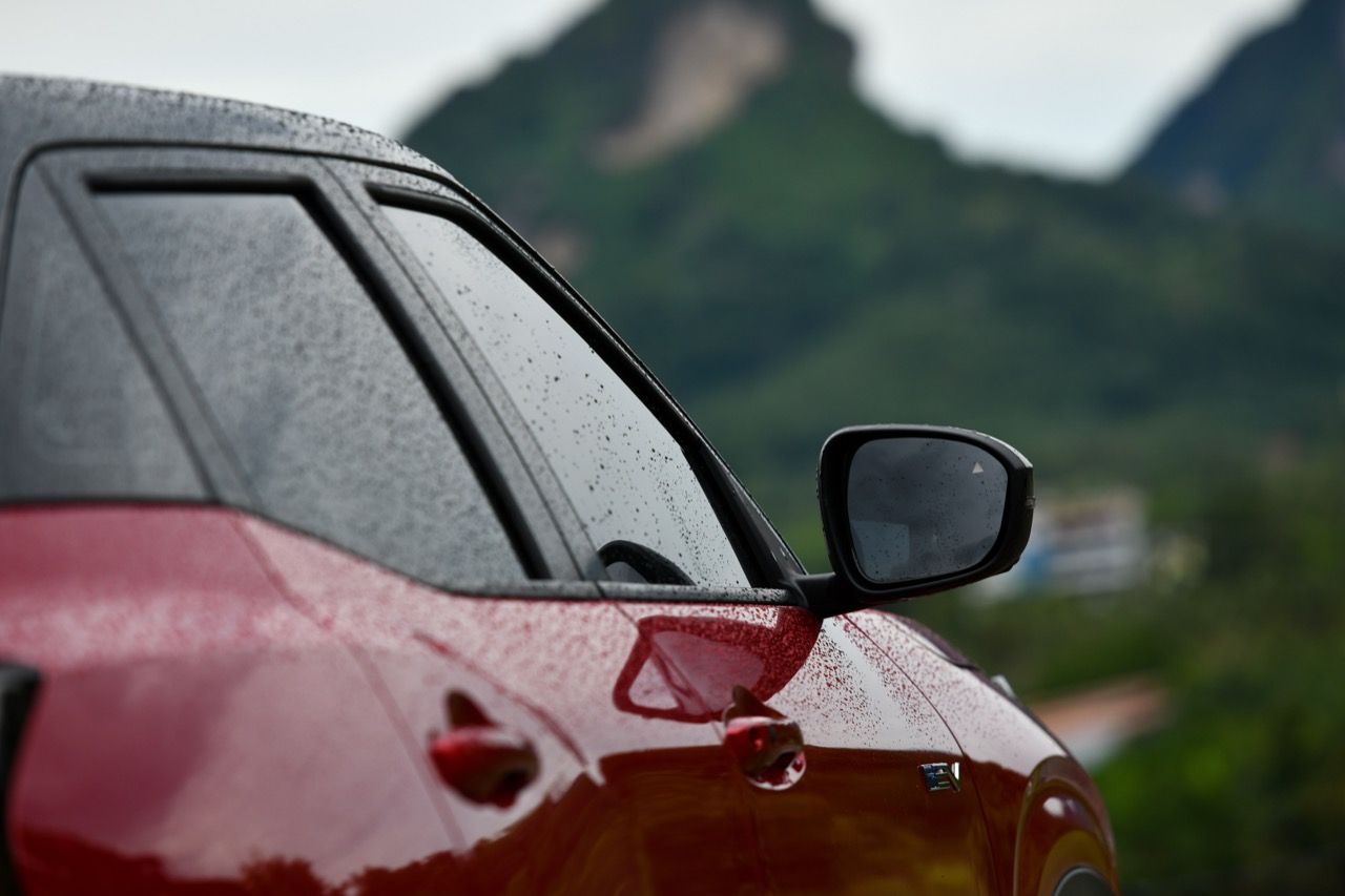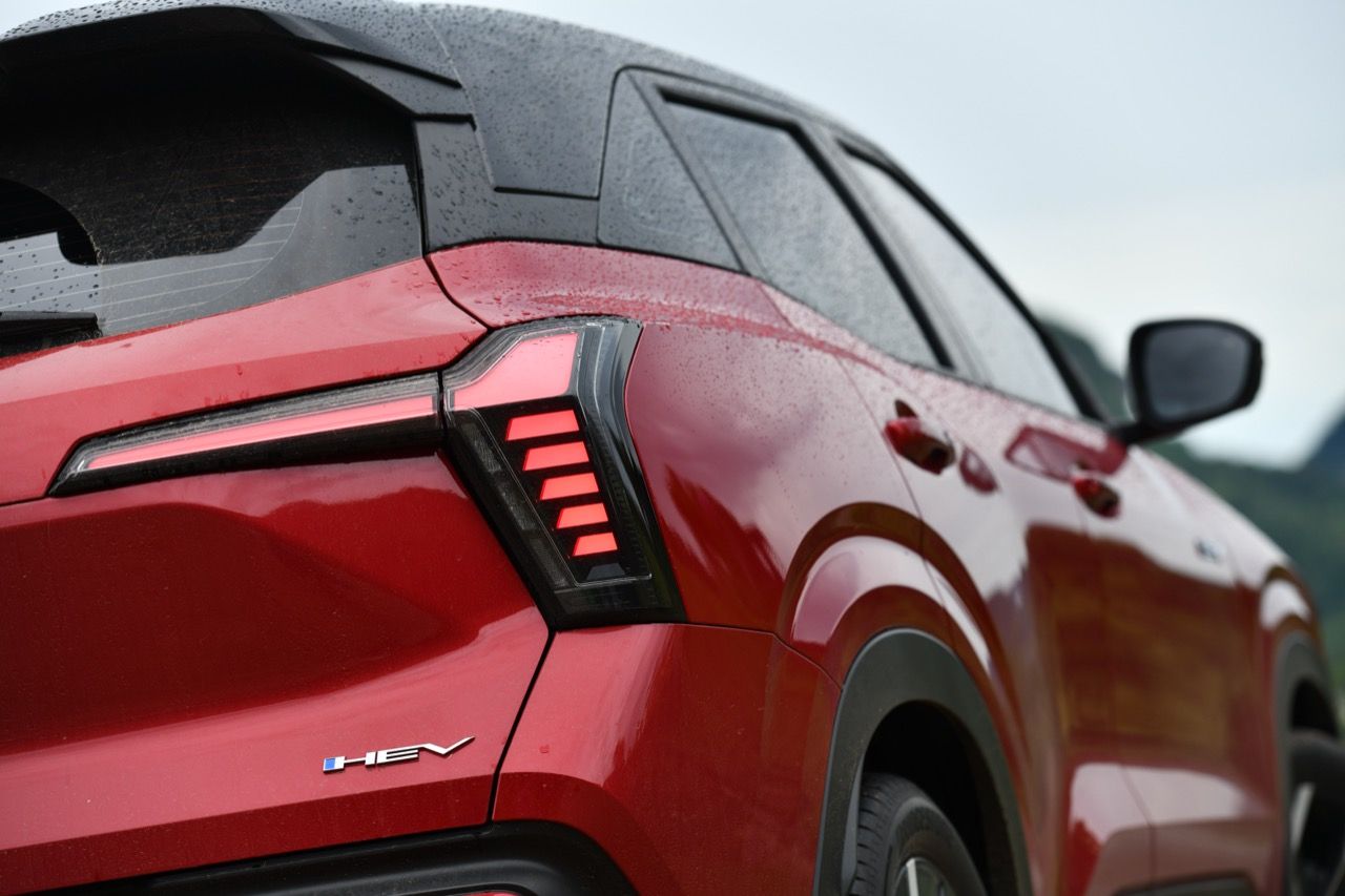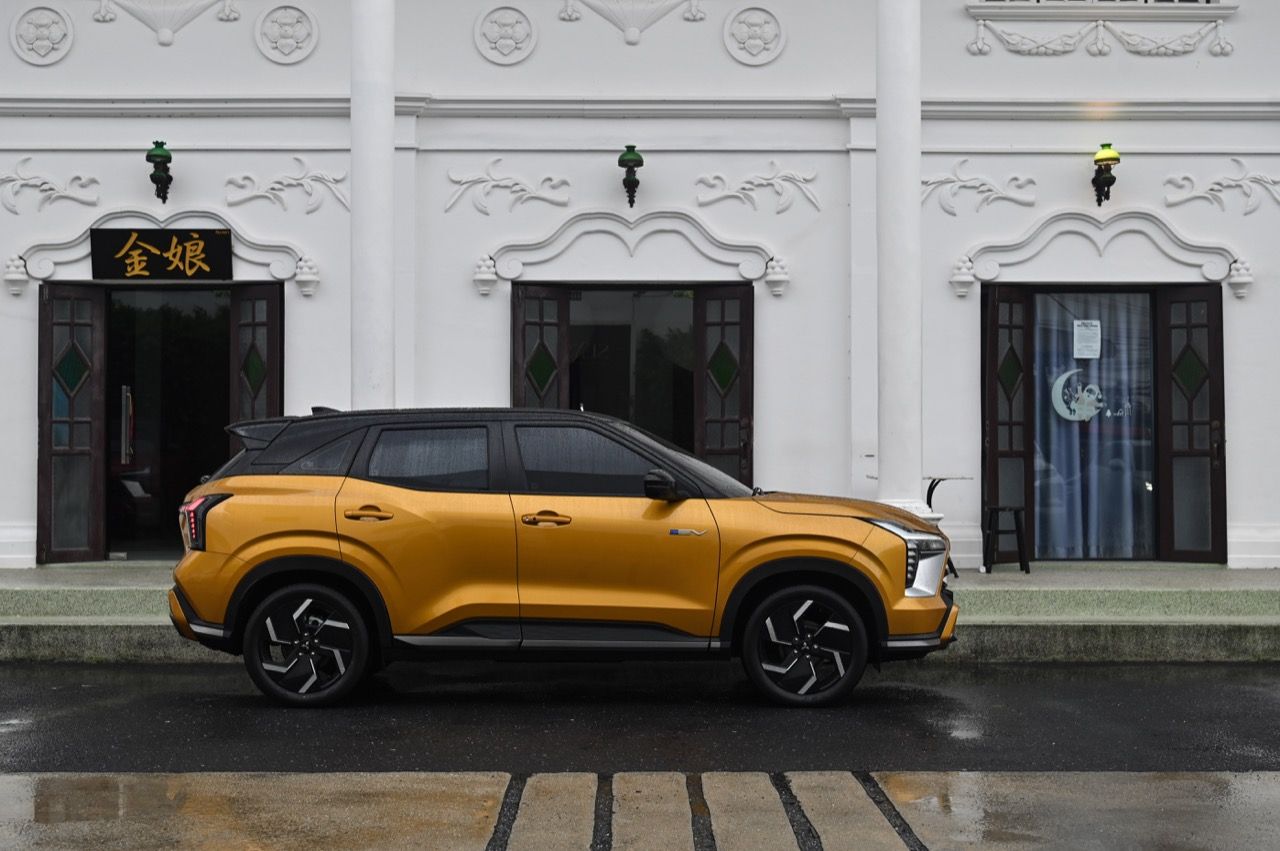ซุ้มล้อด้วยพลาสติกกันกระแทกสีดำ บังโคลนหน้า-หลังที่ยกขอบให้นูนขึ้นมา เส้นด้านข้างของตัวรถอยู่ชายล่างของบานประตู เชื่อมโยงกับพลาสติกกันกระแทกที่ติดตั้งอยู่บริเวณส่วนล่างของประตูทั้งหน้า-หลัง มือจับที่เปิดประตูสีเดียวกับตัวถัง เสาอากาศครีบปลาฉลาม สัญลักษณ์ Hybrid EV ที่ส่วนบนของบานประตูหน้า ล้ออัลลอยลายกงจักรสีดำสลับเงิน ขนาดขอบ 18 นิ้ว ยาง bridgestone alenza ไซล์ 225/50R18 95V มิติตัวถัง ยาว 4,390 มิลลิเมตร กว้าง 1,810 มิลลิเมตร สูง 1,660 มิลลิเมตร ความยาวฐานล้อ 2,650 มิลลิเมตร นำ้หนัก 1,245 กิโลกรัม ความสูงจากพื้นถึงใต้ท้องรถ 183 มิลลิเมตร ความจุถังเชื้อเพลิง 42 ลิตร ตัวเลขความสูงจากพื้นถึงใต้ท้องรถไม่ได้มากมายอะไรตามสไตล์ครอสโอเวอร์ที่ไม่สูงเท่าเอสยูวี แต่พอลุยทางดินโคลนแล้วไปได้เพราะโหมดขับเคลื่อนคอยจัดการกับการทรงตัวของรถและแรงบิดที่เหมาะสม พอเอาตัวรอดในสถานการณ์ที่ยากลำบากได้ก็ทำให้รู้สึกประหลาดใจอยู่เหมือนกัน