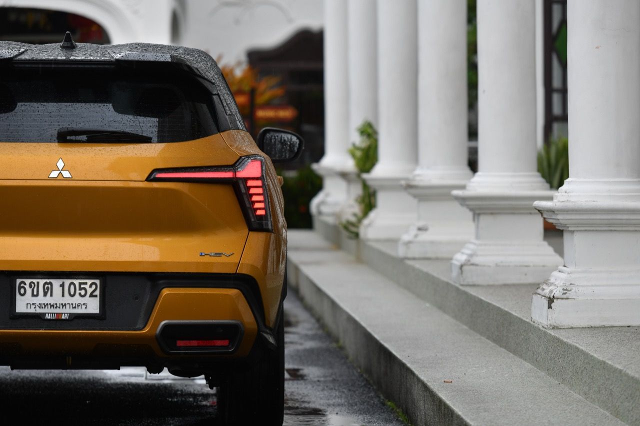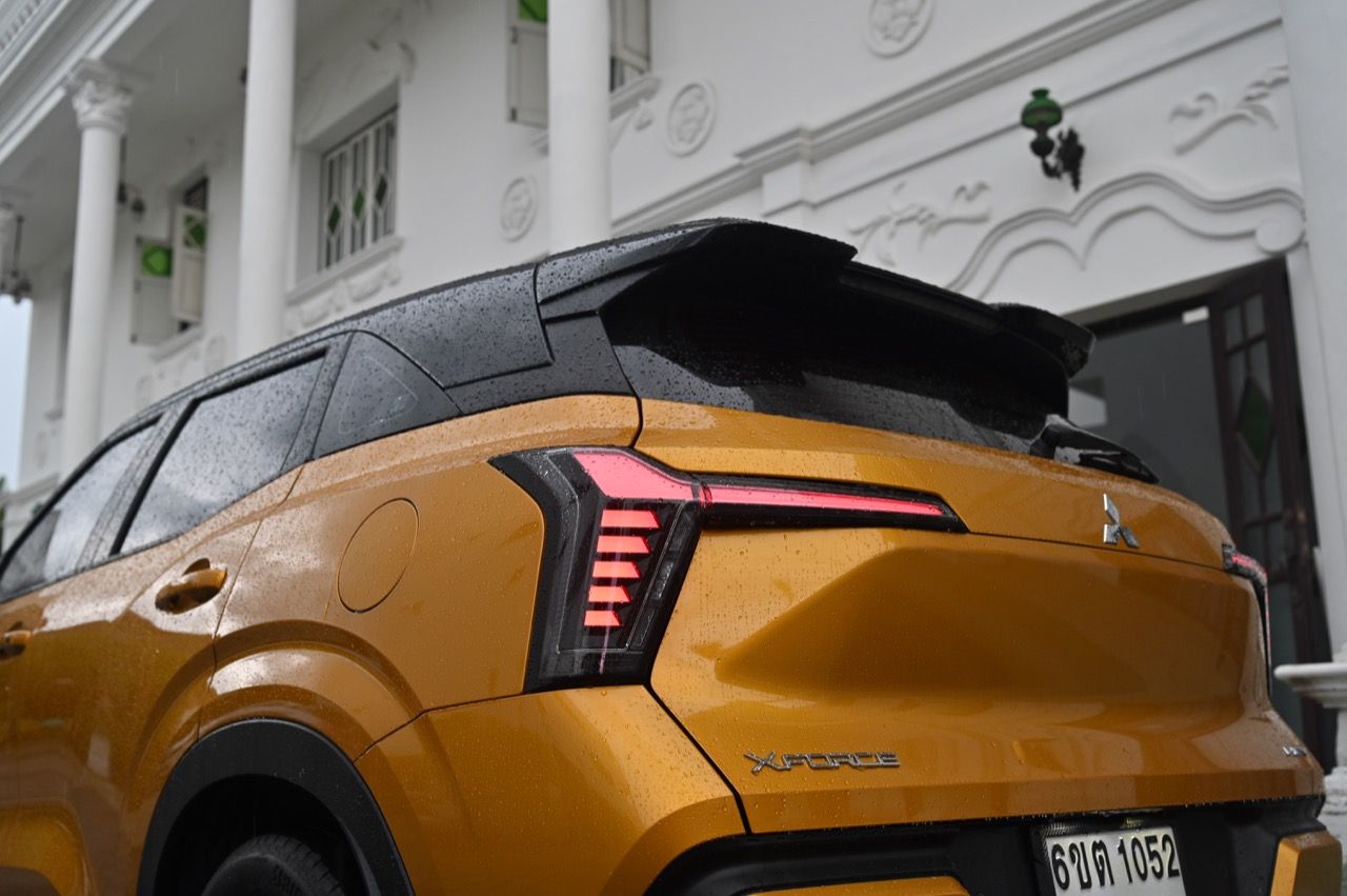 บั้นท้ายคือจุดที่ลงตัว ออกแบบได้อย่างสวยงาม ไฟท้ายสีเทาใส หลอด LED มีดีไซน์ขอบตวัดลงด้านล่างที่แปลกตา ฝาท้ายรุ่นสูงสุด มาพร้อมระบบไฟฟ้า + เซนเซอร์ กันชนหลังออกแบบสอดรับกับทรงของฝาท้าย เพื่อเพิ่มมิติความคมชัดและลึกของทั้งฝาท้ายและกันชนที่เชื่อมต่อกัน ไม่มีส่วนไหนที่ดูขาด หรือเกิน สำหรับรูปลักษณ์ภายนอกของ Mitsubishi Xforce โดยเฉพาะองศาความลาดเอียงของเสาหน้า กับเสาท้ายขนาดใหญ่บนสีตัวถังแบบทูโทนที่ทำให้รถดูทันสมัยมากยิ่งขึ้น พื้นที่เก็บสัมภาระใต้ฝาท้ายมีพอเพียง ถ้าพับเบาะหลังก็จะเพิ่มขึ้นอีกเพียบ