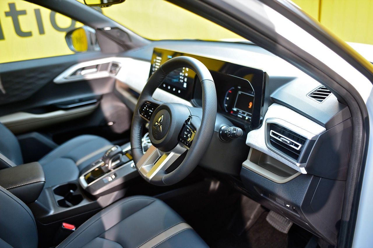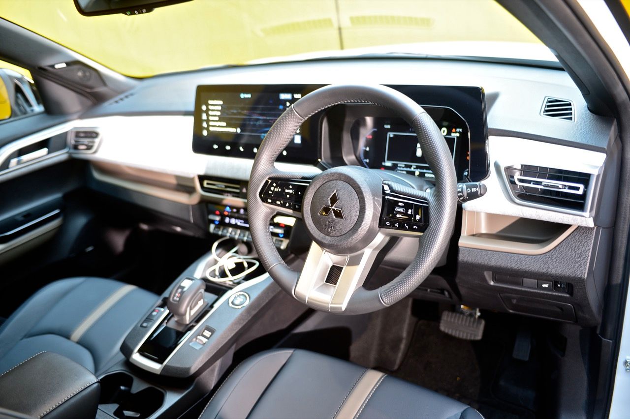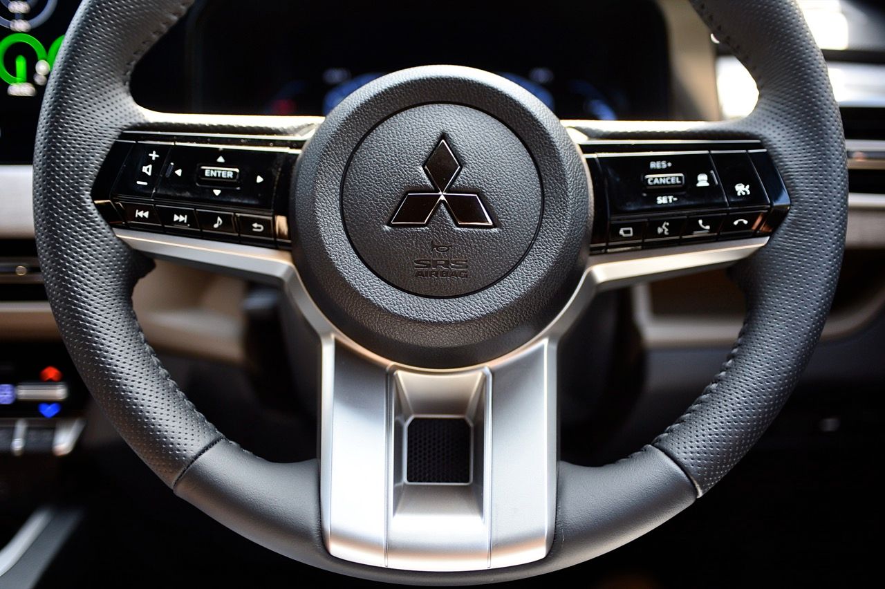 พวงมาลัยทรงสามก้านแบบใหม่ของ Mitsubishi Motor หุ้มหนังรอบวงเพิ่มความกระชับ พวงมาลัยมีขนาดกำลังพอดี มีหน้าตาคล้ายๆกับพวงมาลัยของ Xpender ก้านวง มีสวิชท์สั่งงานต่างๆ ติดตั้งอยู่เต็มไปหมด ก้านวงด้านขวา เป็นสวิชท์สั่งงานของระบบ Adaptive Cruise Control ส่วนด้านซ้ายใช้ควบคุมและปรับตั้งจอภาพมาตรวัด ปุ่มควบคุมระดับเสียงของลำโพง ปุ่มรับหรือวางสายโทรศัพท์ ปุ่มเลือกฟังก์ชันของระบบอินโฟเทนเมนท์