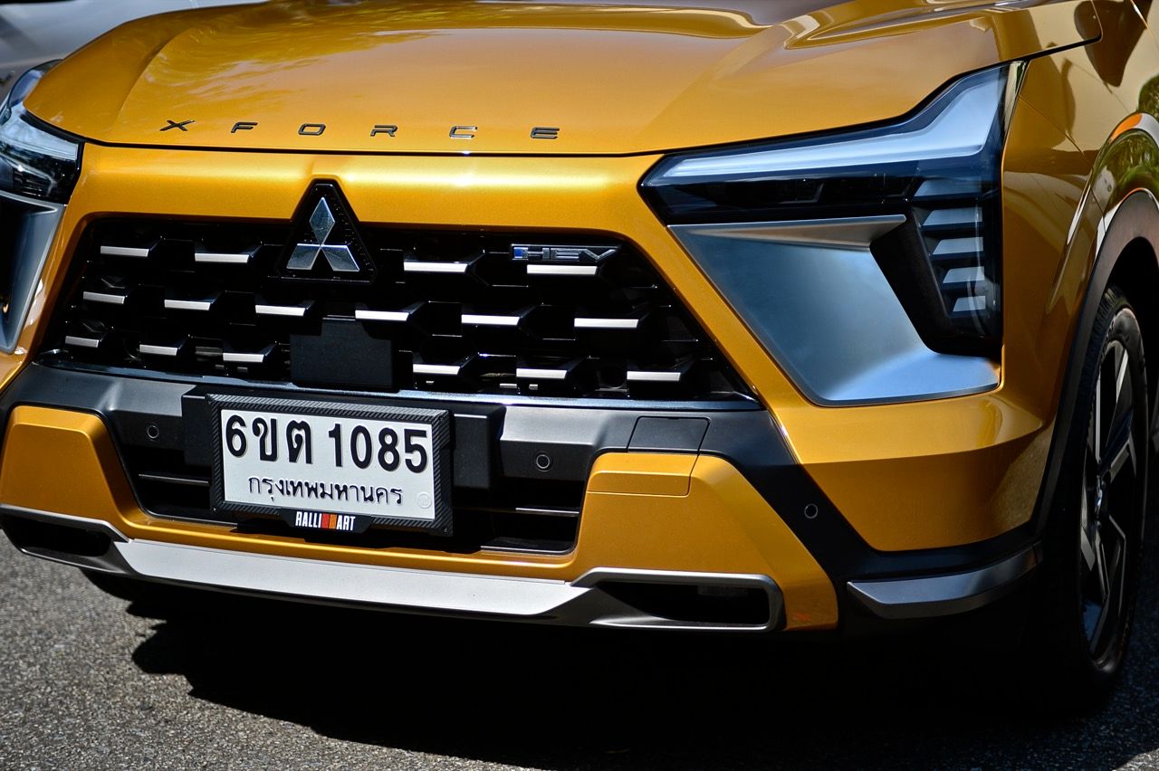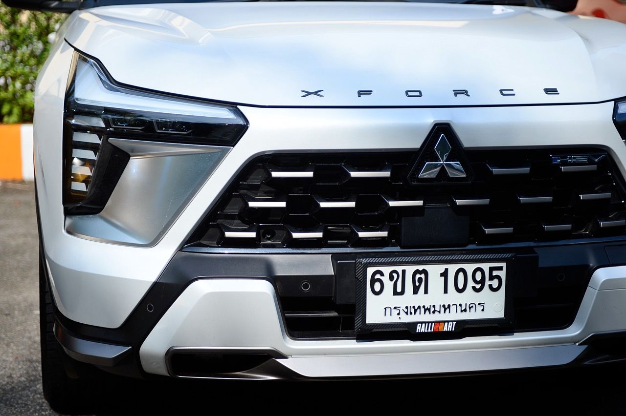 หน้าตาของ Xforce เห็นกันมาหลายเดือนแล้วตั้งแต่ตอนเปิดตัว Mitsubishi ใช้การออกแบบที่โฉบเฉี่ยวทันสมัย คล้ายรถครอสโอเวอร์ของฝั่งยุโรปมากกว่าจะเป็นรถญี่ปุ่น กระจังมีรูปทรงที่กลมกลืนและเชื่อมโยงกันชนหน้า ไฟหน้า LED ไฟหรี่กลางวัน LED Daytime Runninglight ชุดกระจังพลาสติกสีดำ ตัดขอบสี่เหลี่ยมด้วยโครเมี่ยมสีเงิน กันชนหน้าเล่นเหลี่ยมมุมกับกระจังเพื่อสร้างมิติของความลึก! ไฟตัดหมอก LED ติดตั้งอยู่ที่ชายล่างบริเวณมุมทั้งสองข้างของกันชน ขอบฝากระโปรงหน้ามีตัวอักษร Xforce