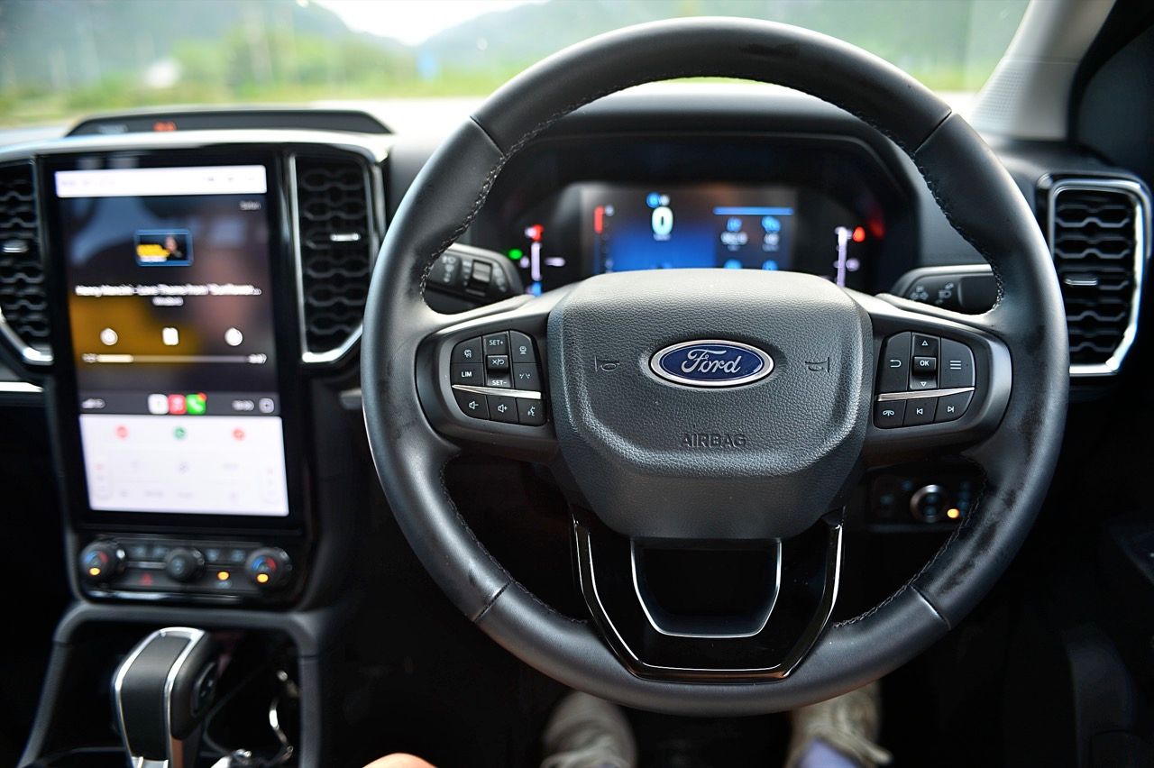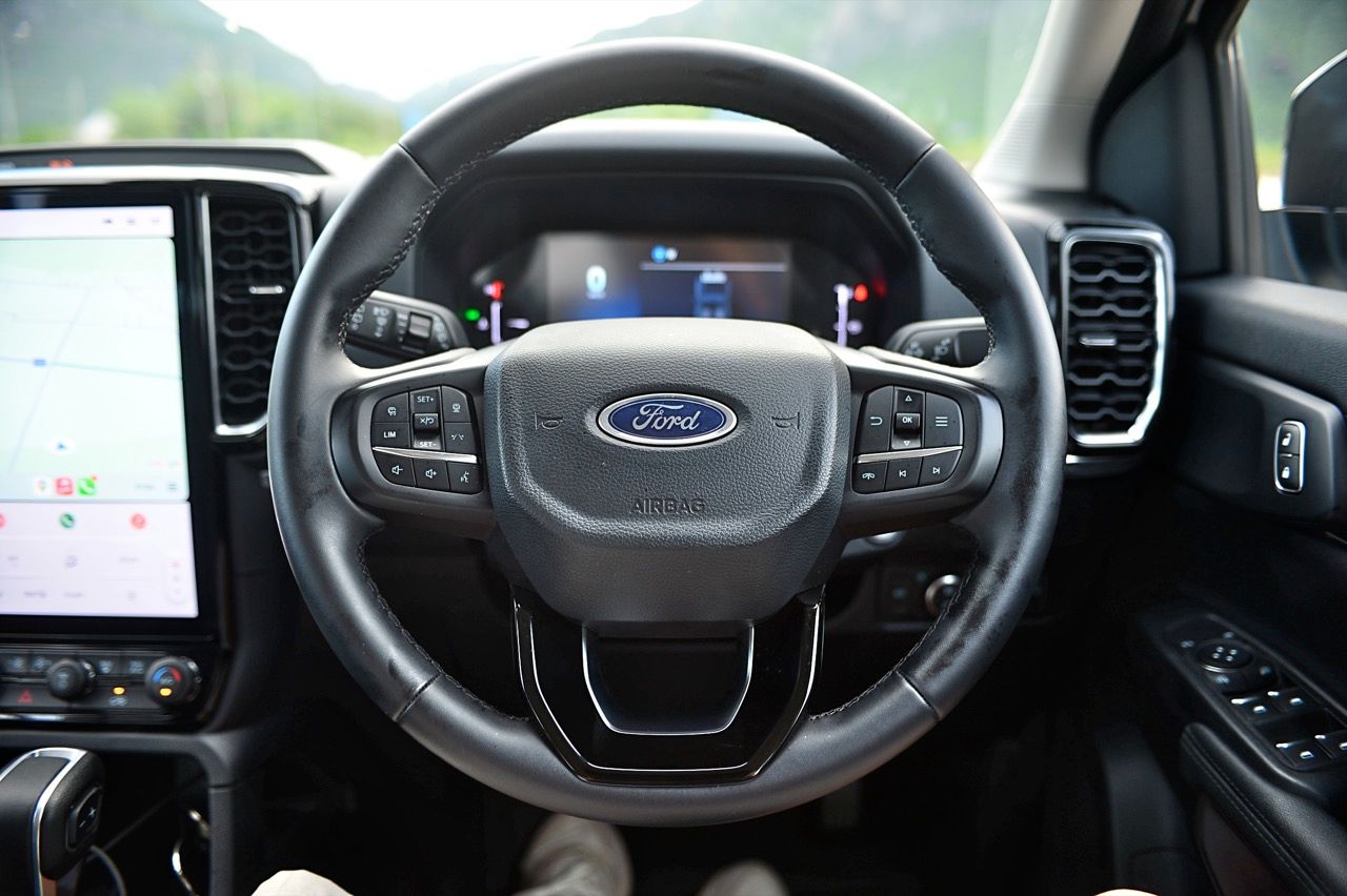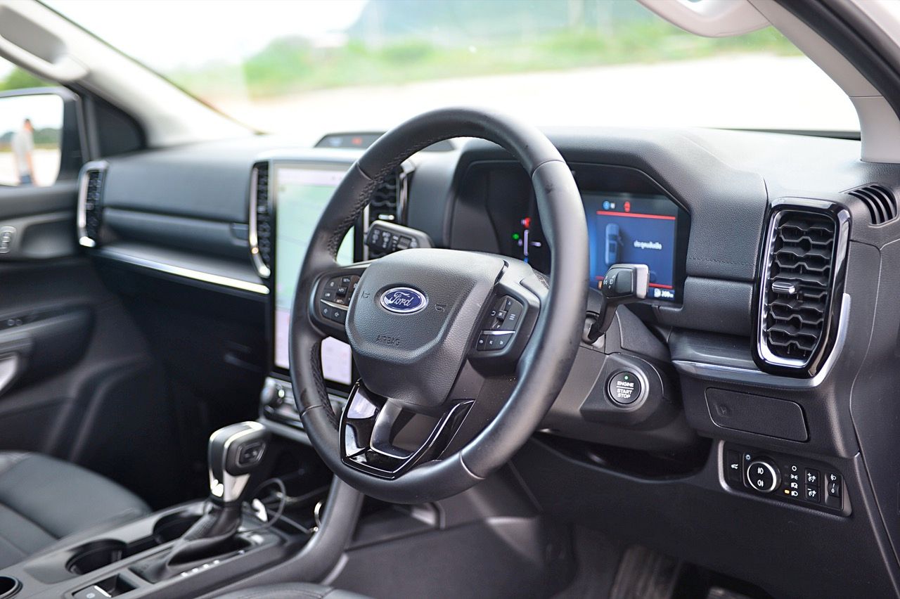 พวงมาลัยแบบ 4 ก้าน ไม่มีแป้น Paddle Shift มาให้! แต่ใช้การกดปุ่มข้างคันเกียร์แทน พวงมาลัยหุ้มหนังตกแต่งด้วยพลาสติกสีดำเงา มีสวิตช์สั่งงานมัลติฟังก์ชันมาให้ พวงมาลัยมีขนาดพอดีออกแบบให้จับได้ถนัดมือ ปรับตั้งได้ 4 ทิศทางทั้งใกล้-ไกลและสูง-ต่ำ สวิตช์มัลติฟังก์ชันใช้สำหรับการปรับตั้งค่าต่างๆ เช่น ระบบปรับตั้งความเร็วอัตโนมัติ Cruise control สวิตช์เลือกดูข้อมูลการขับขี่ผ่านจอ Multi information display ที่ด้านขวาและซ้าย ปรับความดังของลำโพง ปุ่มรับหรือวางสายโทรศัพท์ในระบบบลูทูธ ปุ่มระบบสั่งงานด้วยเสียง ห้องโดยสารของ Ford Everest Sport นั้นคล้ายคลึงกับรุ่น Platinum ความกว้างของห้องโดยสาร (เมื่อเทียบกับรุ่นก่อนหน้า) และความใส่ใจในรายละเอียด ทำให้ห้องโดยสารของ Everest เป็นพื้นที่น่าใช้งาน มีพื้นที่มากกว่า Fortuner และ MU-X เล็กน้อย ส่วนรายการคุณสมบัติการใช้งานต่างๆ ของรถ PPV ทั้งสามรุ่นนั้น สูสีหนีกันไม่ออกอยู่ที่ความชอบของคนซื้อที่จะต้องลองขับ เพราะดีหมดทั้งสามตัว รวมถึงรถที่ขายไม่ดีอย่าง Terra ก็ยังไม่เป็นรองกับพระเอกพระรองทั้งสามหน่อ สำหรับคุณสมบัติด้านความปลอดภัยเชิงรุกและระบบอินโฟเทนเมนต์ทำได้ดี