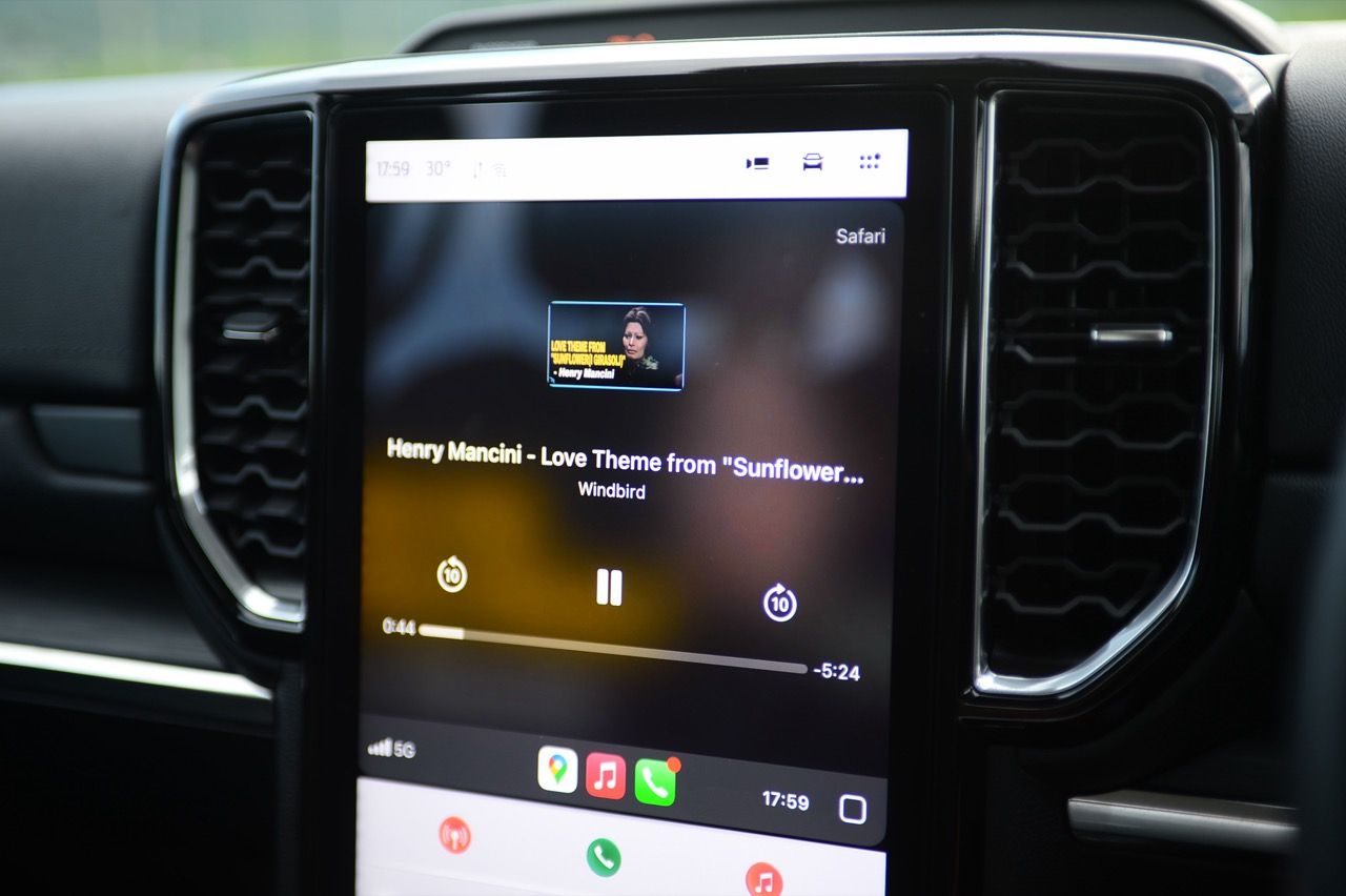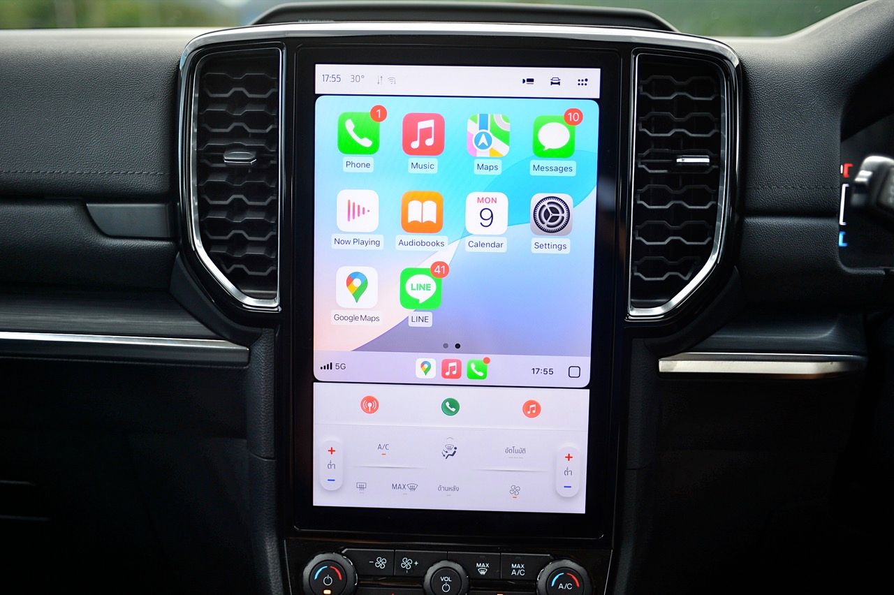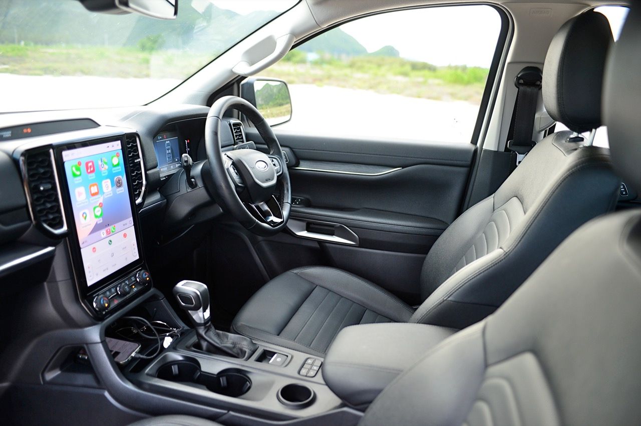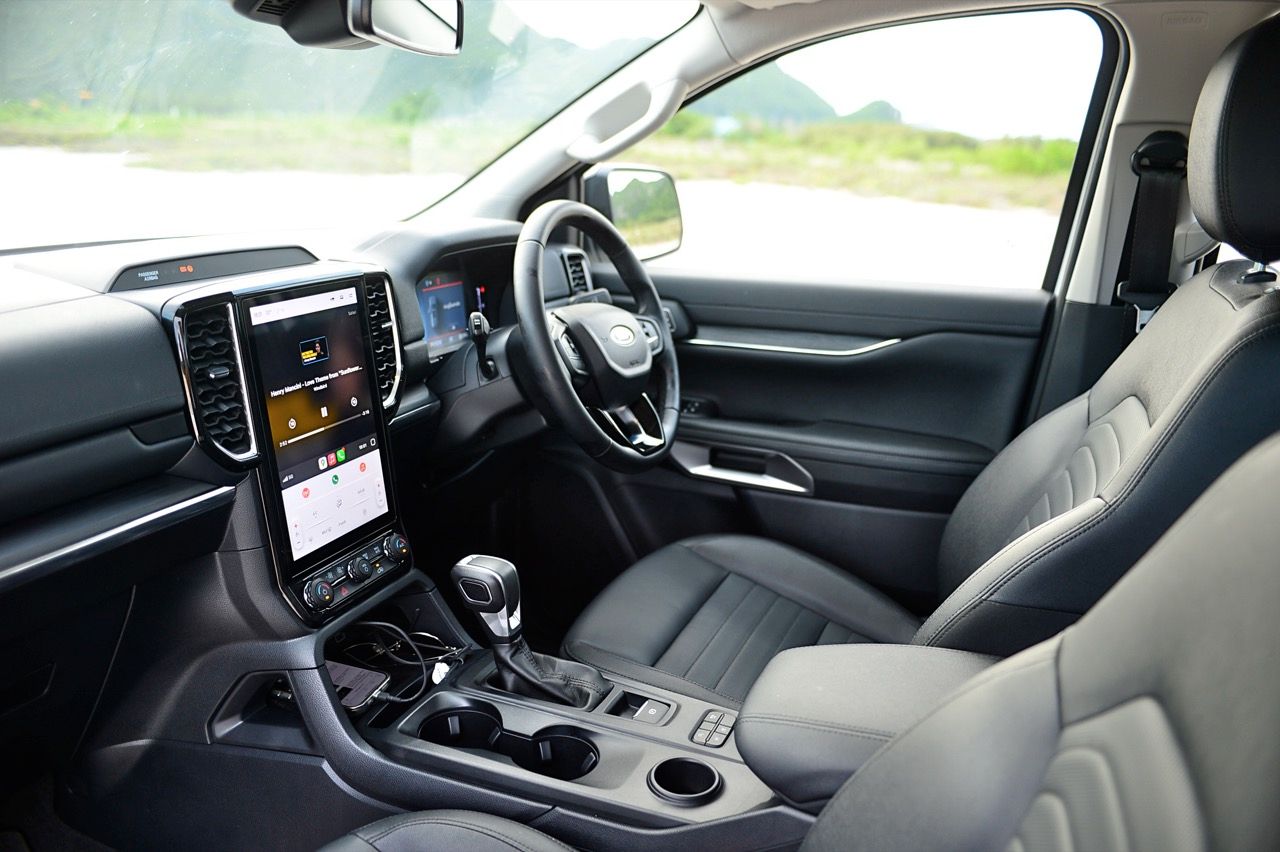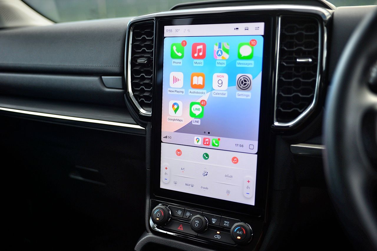 พื้นที่เหนือศีรษะในแถวที่ 1 และ 2 ของ Everest Sport นั้นเหนือกว่ารุ่น Platinum อย่างเห็นได้ชัด (เพิ่มขึ้น 4 ซม. ถือว่าไม่น้อยเลยทีเดียว) Ford Everest Sport มาพร้อมเทคโนโลยีล้ำสมัย หน้าจอมอนิเตอร์ของระบบอินโฟเทนเมนท์และการปรับตั้งค่าต่างๆ เป็นจอภาพแนวตั้งขนาด 10 นิ้ว สั่งงานด้วยระบบสัมผัส ออกแบบซอฟแวร์ควบคุมการทำงานให้เข้าถึงฟีเจอร์ต่างๆได้อย่างรวดเร็ว (บางทีก็ช้าอยู่เหมือนกัน) เช่น Apple CarPlay แบบไร้สายและ Android Auto แบบมีสาย ระบบเสียง 8 ลำโพงไม่ถึงกับเจ๋งแต่ก็ดีกว่าเดิมมาก เสียงที่ขับผ่านลำโพงไม่ได้สมบูรณ์แบบอย่างที่ผมชอบแต่ก็ยังถือว่าดีเลยเมื่อเทียบกับราคาค่าตัว แท่นชาร์จมือถือแบบไร้สายใช้งานได้จริง ไม่สร้างอุณหภูมิให้กับโทรศัพท์เคลื่อนที่ส่วนบุคคลราคาแพง พอร์ตชาร์จ USB มากมายก่ายกองสำหรับผู้โดยสารทุกคน