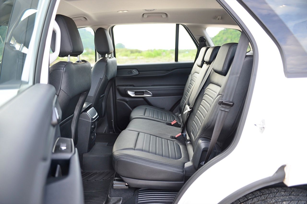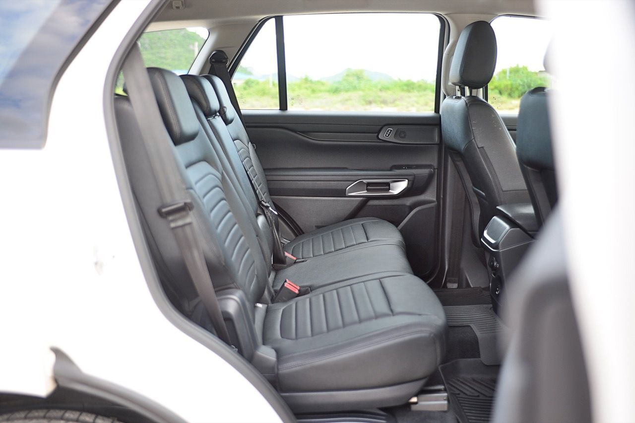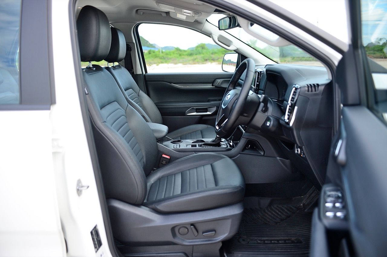 นอกจากแนวทางตกแต่งสีดำทั้งภายนอกและภายในแล้ว ก็ยังยากที่จะสังเกตเห็นความแตกต่างที่ชัดเจนระหว่าง Platinum และ Sport ที่น่าสนใจคือ Sport สูงกว่า Platinum นิดเดียว ซึ่งทำให้ได้มุมเข้า/ออกที่ดีขึ้นนิดหน่อย ภายในห้องโดยสารของ Everest Sport นั้นดูเหมือนชิ้นส่วนต่างๆจะอุดมไปด้วยพลาสติกและหนังเทียม ส่วนใหญ่แล้วจะมีสีดำเป็นสีหลัก แต่กลับดูหรูหราและไม่ดูแย่จนเกินไป สาเหตุหลักมาจากหน้าจอสัมผัสแบบแท็บเล็ตขนาด 10 นิ้วที่อยู่ตรงกลางแผงหน้าปัด รวมถึงแผงหน้าปัดดิจิทัลขนาด 8 นิ้ว (ซึ่งแน่นอนว่าเล็กกว่ารุ่น Platinum ที่มีขนาด 12 นิ้ว) เบาะนั่งด้านหน้าปรับด้วยไฟฟ้า (รวมถึงที่รองรับส่วนหลัง) ไม่มีระบบทำความร้อน/ความเย็น เบาะแถวที่ 2 มีพื้นที่พอสมควร นั่งสบายใช้ได้ ที่สำคัญกว่านั้นก็คือ เบาะแถวที่ 3 ไม่มีฟังก์ชันพับอัตโนมัติ เบาะนั่งเป็นหนังสังเคราะห์ เนื้อเบาะแตกต่างจากเบาะหนังพรีเมียมในรุ่นเรือธง