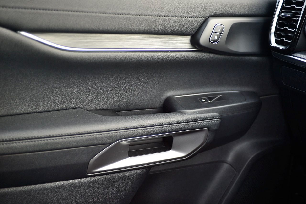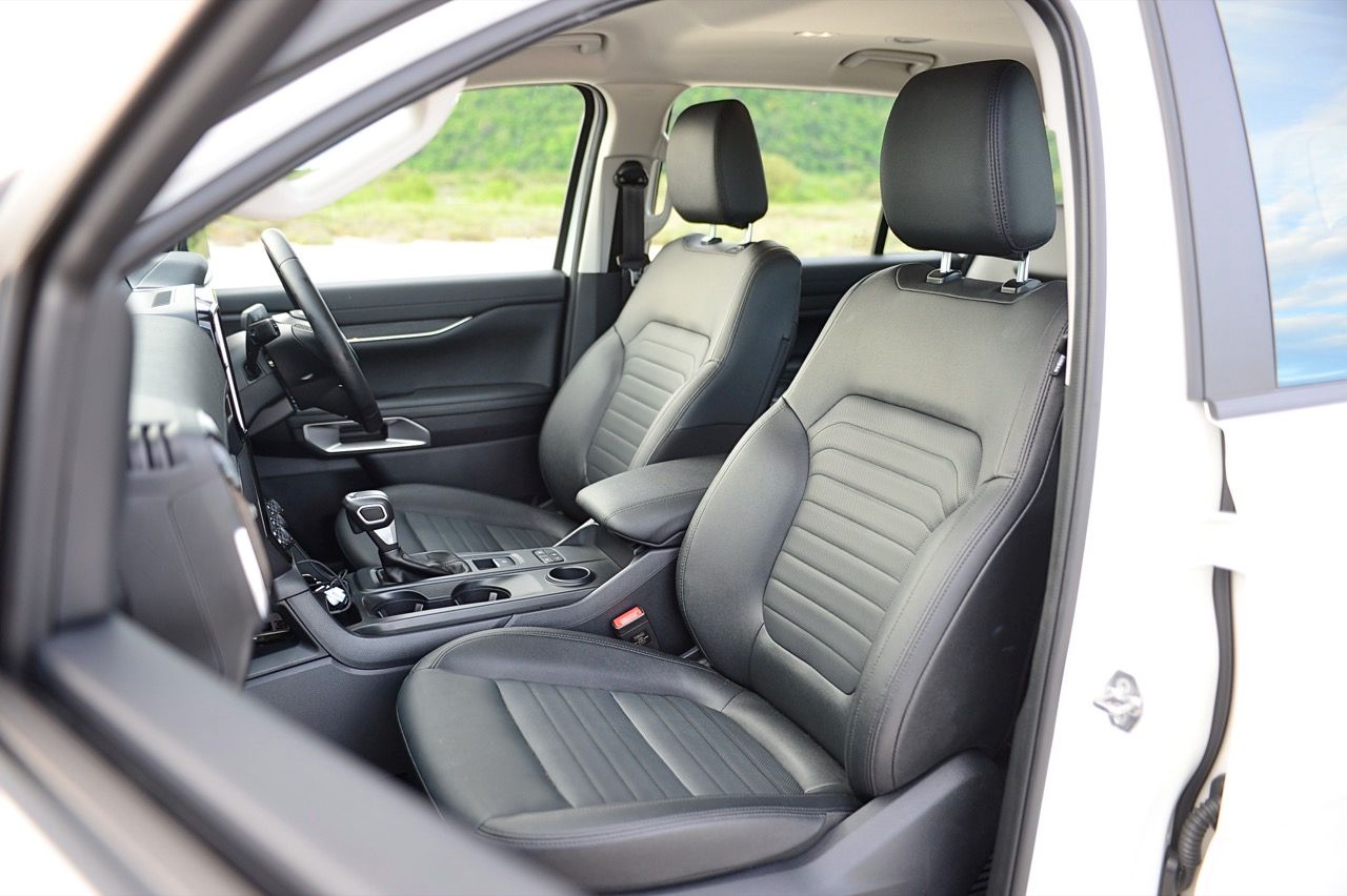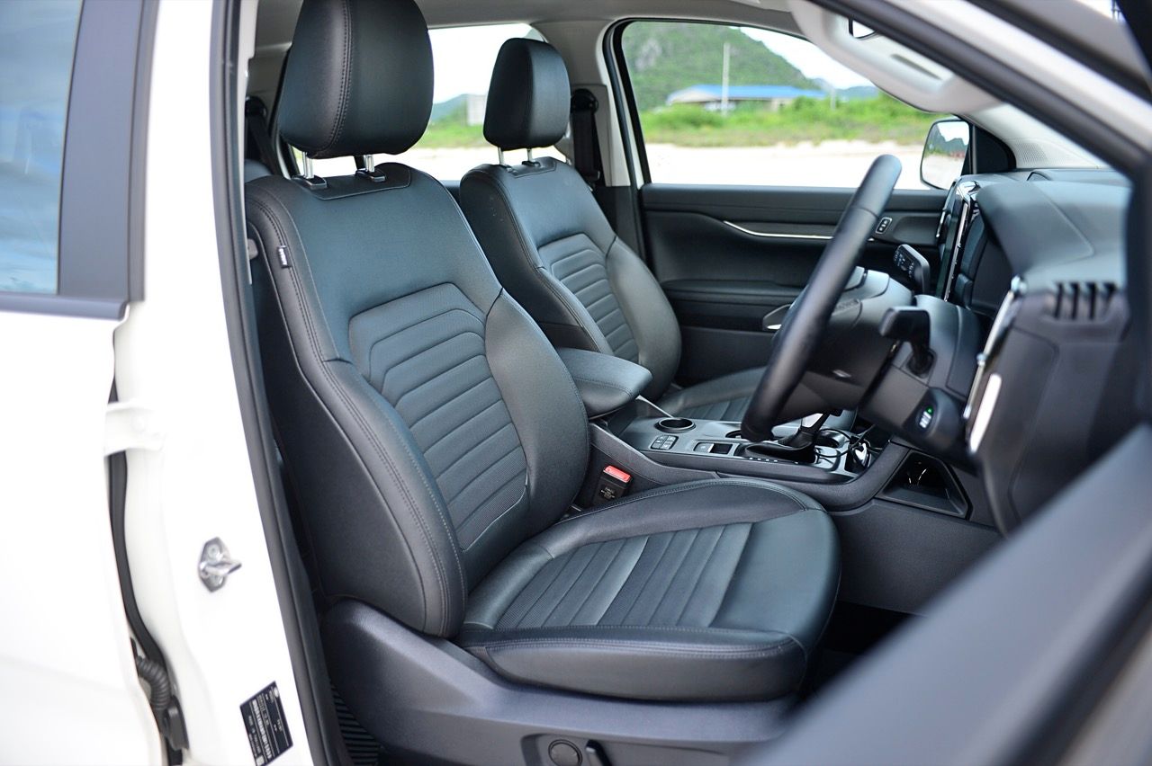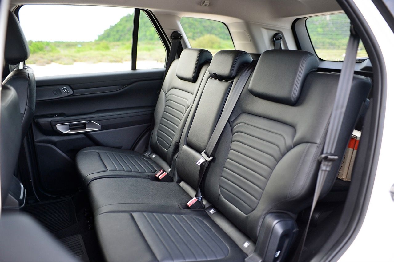นอกจากแนวทางตกแต่งสีดำทั้งภายนอกและภายในแล้ว ก็ยังยากที่จะสังเกตเห็นความแตกต่างที่ชัดเจนระหว่าง Platinum และ Sport ที่น่าสนใจคือ Sport สูงกว่า Platinum นิดเดียว ซึ่งทำให้ได้มุมเข้า/ออกที่ดีขึ้นนิดหน่อย ภายในห้องโดยสารของ Everest Sport นั้นดูเหมือนชิ้นส่วนต่างๆจะอุดมไปด้วยพลาสติกและหนังเทียม ส่วนใหญ่แล้วจะมีสีดำเป็นสีหลัก แต่กลับดูหรูหราและไม่ดูแย่จนเกินไป สาเหตุหลักมาจากหน้าจอสัมผัสแบบแท็บเล็ตขนาด 10 นิ้วที่อยู่ตรงกลางแผงหน้าปัด รวมถึงแผงหน้าปัดดิจิทัลขนาด 8 นิ้ว (ซึ่งแน่นอนว่าเล็กกว่ารุ่น Platinum ที่มีขนาด 12 นิ้ว) เบาะนั่งด้านหน้าปรับด้วยไฟฟ้า (รวมถึงที่รองรับส่วนหลัง) ไม่มีระบบทำความร้อน/ความเย็น เบาะแถวที่ 2 มีพื้นที่พอสมควร นั่งสบายใช้ได้ ที่สำคัญกว่านั้นก็คือ เบาะแถวที่ 3 ไม่มีฟังก์ชันพับอัตโนมัติ เบาะนั่งเป็นหนังสังเคราะห์ เนื้อเบาะแตกต่างจากเบาะหนังพรีเมียมในรุ่นเรือธง