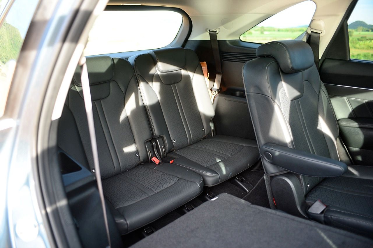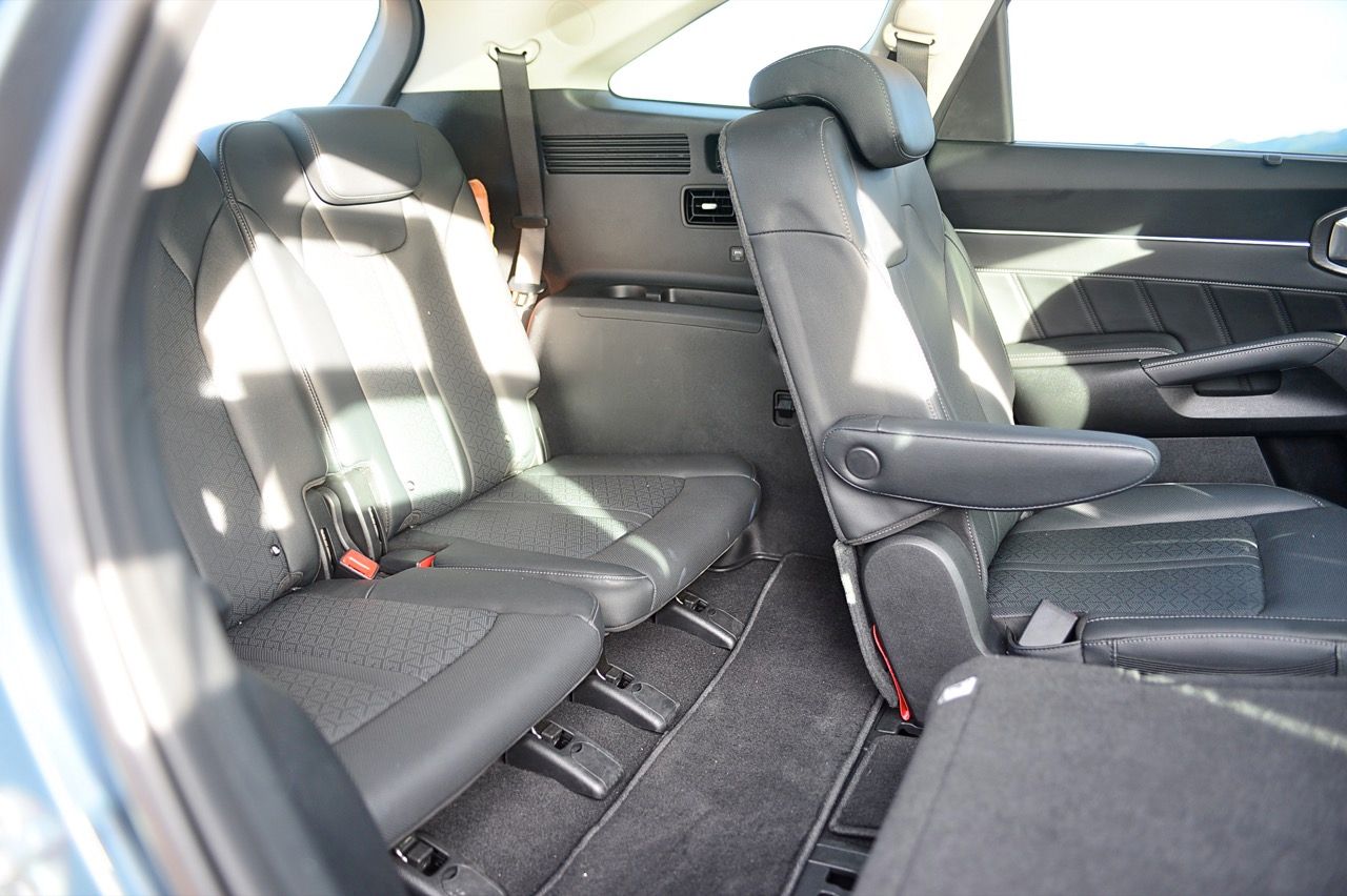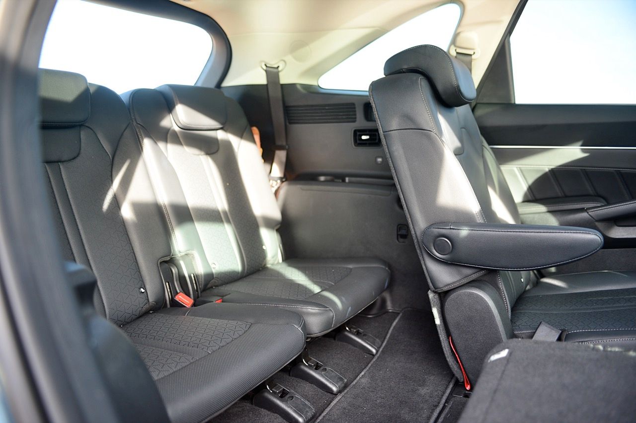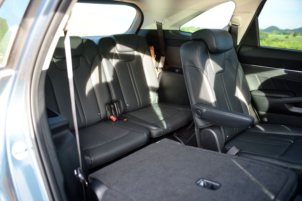 เบาะผู้โดยสารแถวกลางมีที่วางแขนตรงกลางแบบพับได้ พร้อมที่วางแก้วน้ำเพิ่มเติมบนแผงประตู ที่เก็บของเพิ่มเติม แถวสองไม่มีระบบปรับอากาศ แต่มีช่องระบายอากาศแบบปรับทิศทางได้ จุดยึดเบาะนั่งเด็ก ISOFIX ที่เบาะนั่งริมหน้าต่าง มีจุดยึดสายรัดด้านบนอีกสามจุดด้านหลัง เบาะแถวสามแค่พอใช้ได้ แต่อาจไม่มีพื้นที่มากเท่าที่ควร (ถ้าต้องการพื้นที่เยอะๆ Kia Carnival ตอบโจทย์มากกว่า เบาะหลังแถวสาม เหมาะสำหรับเด็กเล็กหรือเบาะนั่งฉุกเฉิน เบาะแถวสองสามารถพับเก็บแบบ One-Touch ได้ เพื่อเปิดพื้นที่ เข้า-ออก จากเบาะแถวสาม
