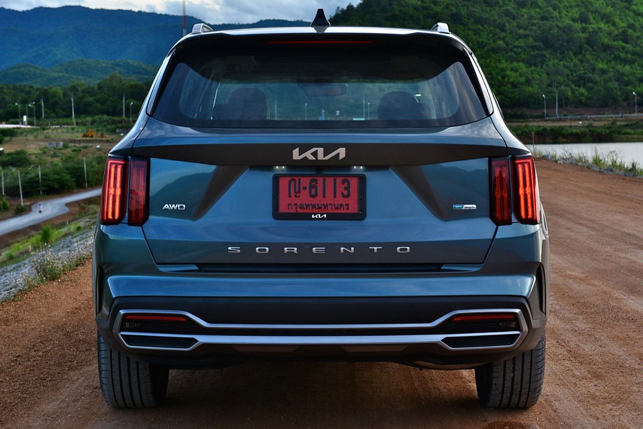 บั้นท้ายออกแบบในสไตล์ที่แตกต่างและก็เหมือนกับรถยนต์ไฟฟ้าจีนบางแบรนด์ที่ใช้ดีไซน์ไฟท้ายแนวตั้ง ฝาท้ายไฟฟ้ามาพร้อมเซนเซอร์ ขอบล่างของฝาท้าย แปะชื่อรุ่น Sorent อย่างชัดเจน ตามด้วยตัวอักษร AWD ขับเคลื่อนสี่ล้อและ ECO Plug in ไฟเบรกดวงที่สามอยู่ในกรอบของสปอยเลอร์หลัง รวมถึงการออกแบบใบปัดน้ำฝนด้านหลังที่ซ่อนอยู่ในสปอยเลอร์หลังอย่างแนบเนียน เป็นอีกจุดที่ทำออกมาได้ดี