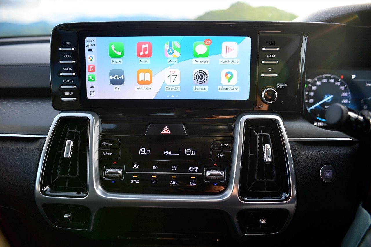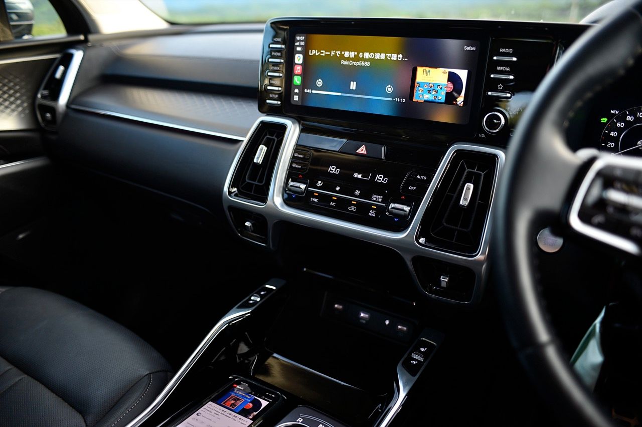 ภายในห้องโดยสารที่ค่อนข้างแปลกตาจากแนวทางการออกแบบของรถยนต์จากเกาหลีที่มีสไตล์เป็นของตัวเองโดยไม่ได้ลอกเลียนแบบใคร Sorento PHEV มาพร้อมความละลานตา ด้วยมาตรวัดดิจิทัลขนาด 12.3 นิ้ว หน้าจอสัมผัสอินโฟเทนเมนต์ขนาด 10.3 นิ้ว เชื่อมต่อ Apple CarPlay, Android Auto พร้อมระบบนำทางในตัว แท่นชาร์จไร้สาย พอร์ต USB สำหรับผู้โดยสารทุกตำแหน่ง พอร์ตชาร์จ USB สองพอร์ตที่ด้านข้างของเบาะนั่งแถวที่ 1 และพอร์ตชาร์จที่ 3 รองรับผู้โดยสารแถวที่ 3 ระบบเสียงพรีเมียมจาก Bose ติดตั้งลำโพงคุณภาพสูง 12 ตำแหน่งรอบห้องโดยสาร