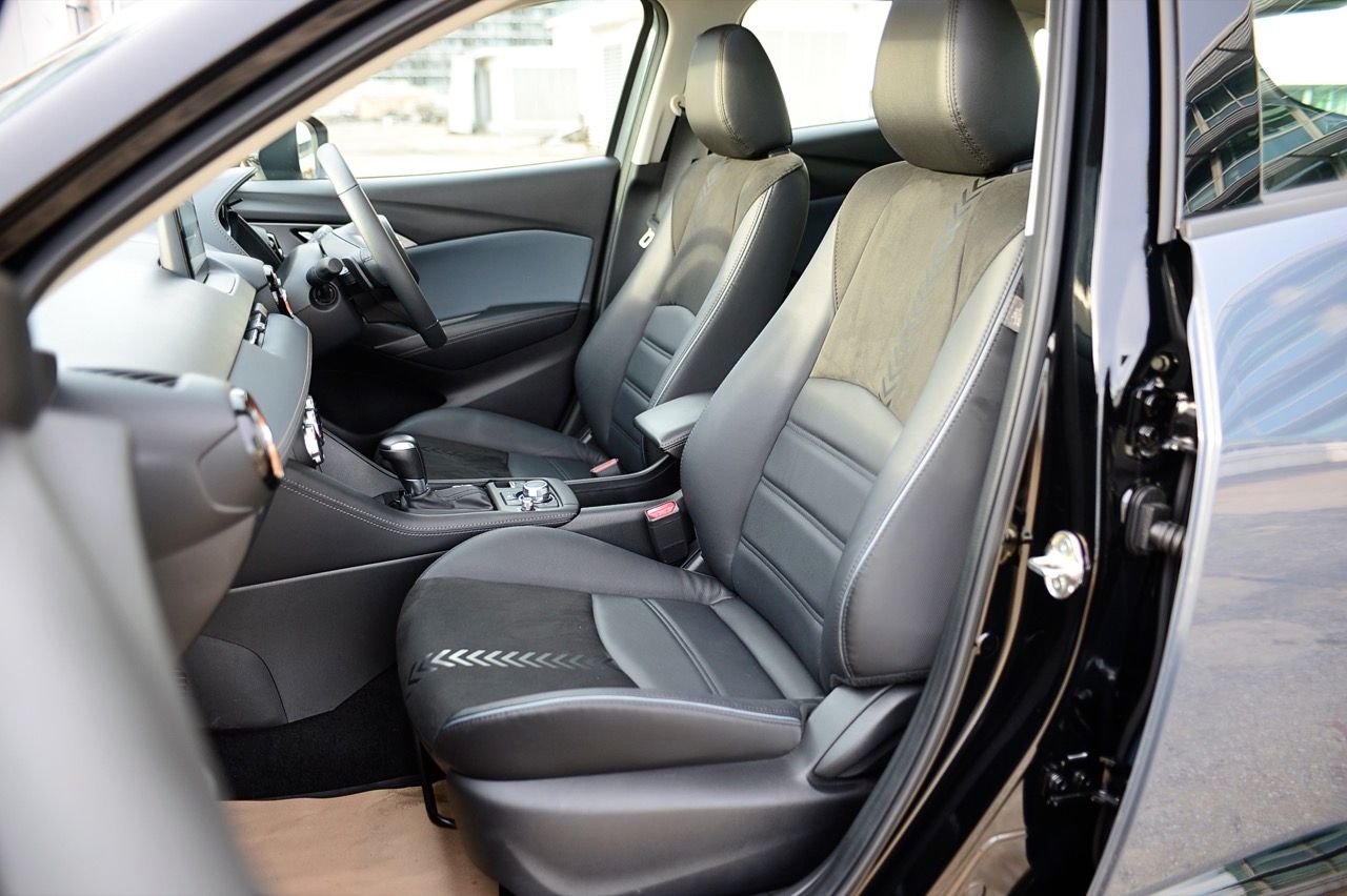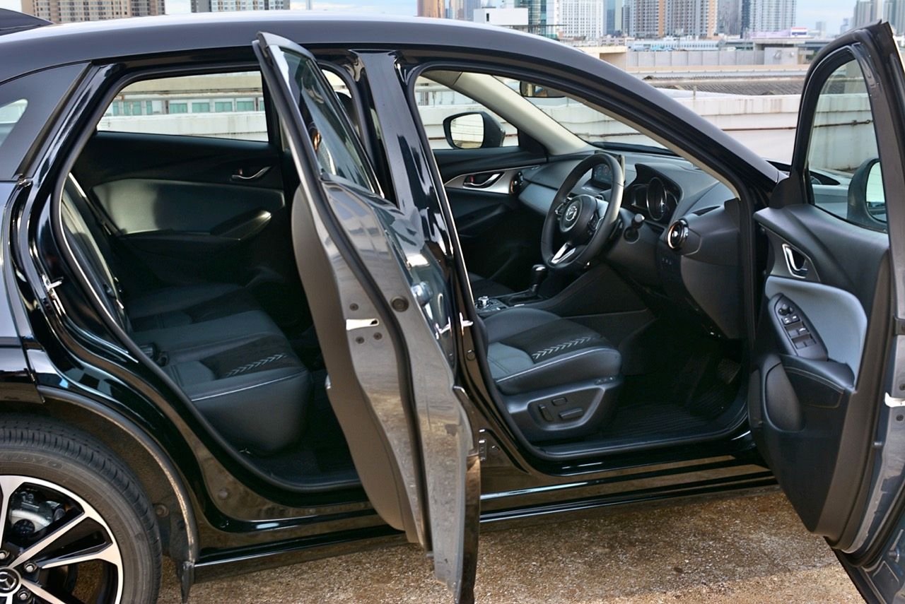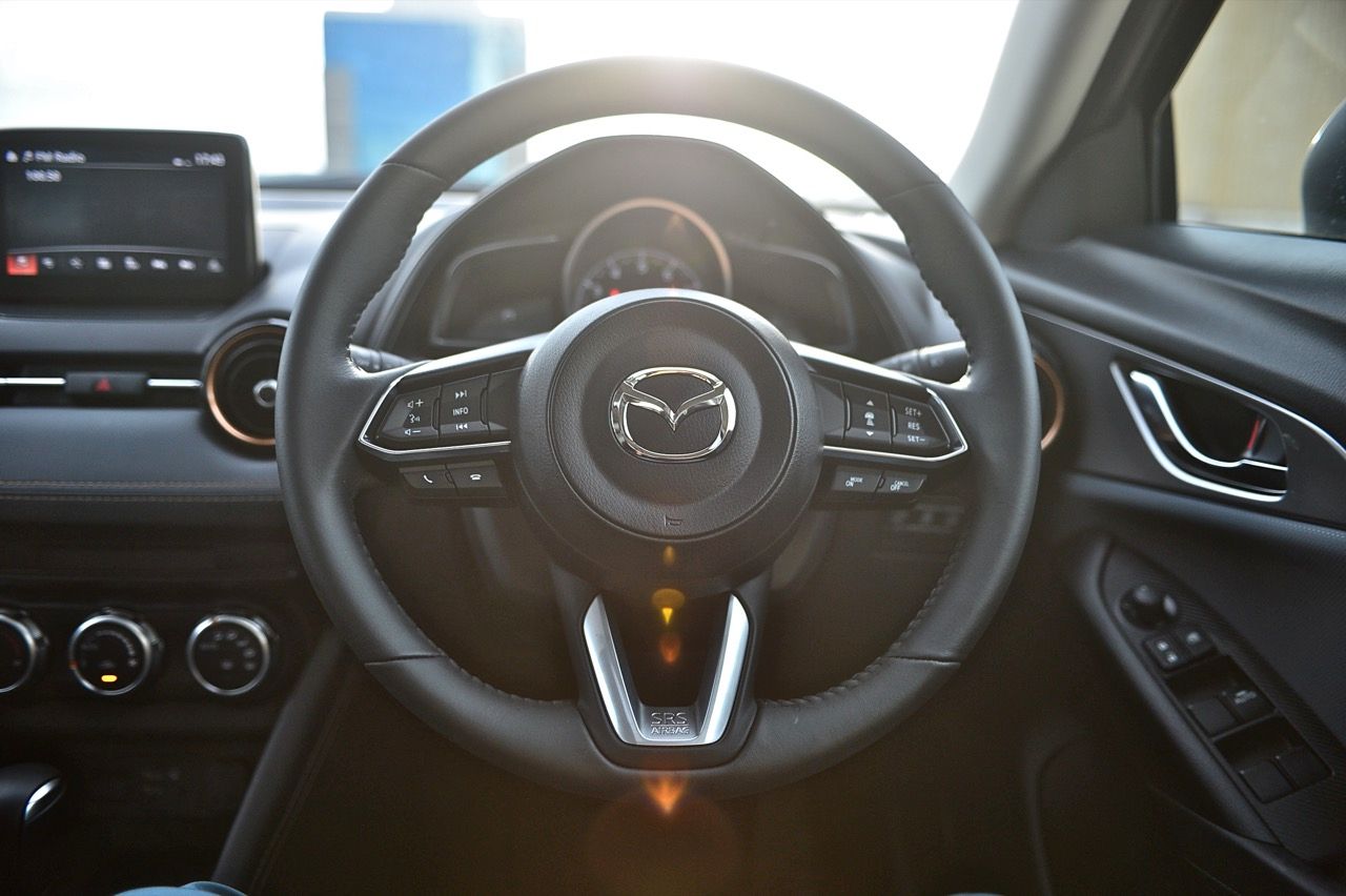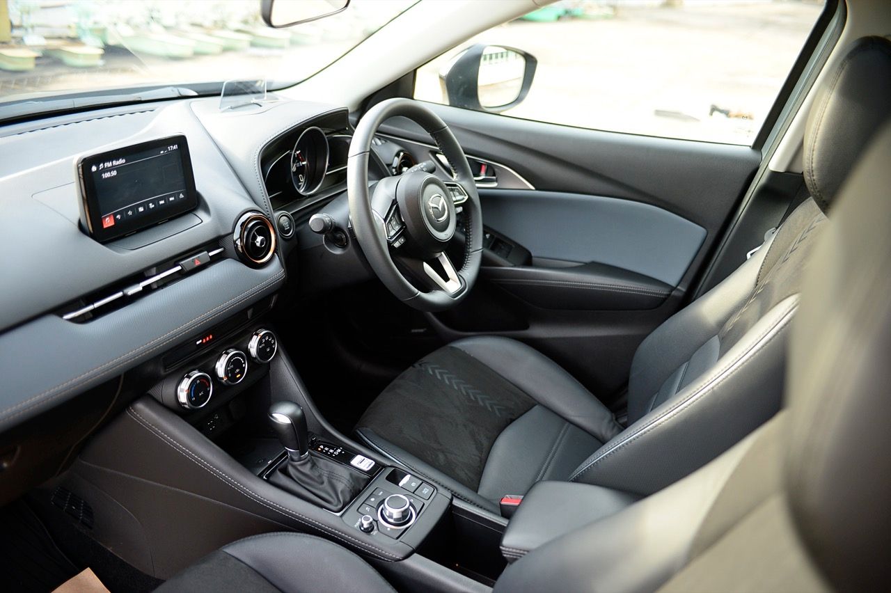 การแชร์ชิ้นส่วนภายในร่วมกับ Mazda 2 เพื่อลดต้นทุน แดชบอร์ด คอนโซล ช่องแอร์ งานพลาสติกและหนัง ยังสื่อให้เห็นถึงความตั้งใจในการออกแบบ CX-3 2.0 SIGNATURE ใส่ใจในรายละเอียดแบบลงลึก เบาะโดยสารตัดเย็บอย่างประณีต เบาะหนังของรุ่นท็อปยังมีการแยกใช้วัสดุหนังสองแบบเพื่อเพิ่มเติมความหรูหราให้กับห้องโดยสาร พวงมาลัยแบบสามก้าน พร้อมสวิตช์ควบคุมการทำงานของระบบต่างๆ หุ้มด้วยหนังแท้พร้อมรอบวงที่ออกแบบมาเป็นพิเศษ ขนาดของพวงมาลัยนั้นไม่ใหญ่หรือเล็กจนเกินไป รุ่นสูงสุดของ Mazda CX-3 SkyActiv-G 2.0. มีพวงมาลัยแบบสปอร์ตติดตั้งแป้นเปลี่ยนเกียร์ Paddle Shift ซึ่งนับเป็นอีกหนึ่งรุ่นที่มีอุปกรณ์ช่วยขับที่มีความครบและใช้งานง่าย