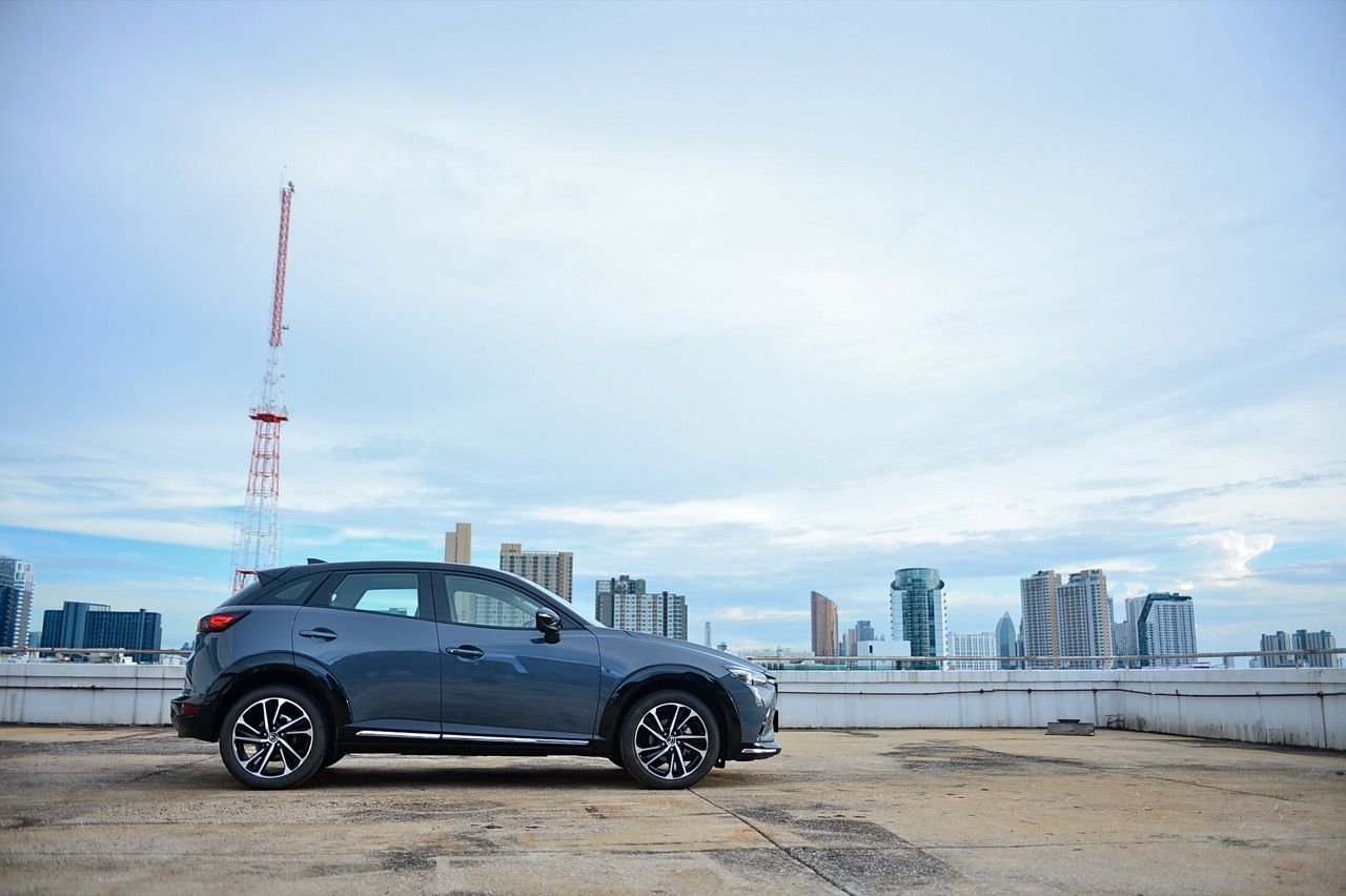 Mazda CX-3 มีความกว้าง 1,766 มิลลิเมตร ยาว 4,275 มิลลิเมตร และสูงแบบครอสโอเวอร์ที่ 1,535 มิลลิเมตร ตัวเลขดังกล่าวจะเห็นได้ว่า CX-3 ถูกปรับยืดให้มีสัดส่วนของตัวถังกว้างและสูงกว่า Mazda 2 อยู่พอสมควร ระยะห่างฐานล้อหน้า-หลัง 2,570 มิลลิเมตร น้อยกว่า CX-5 ผู้พี่อยู่ถึง 130 มิลลิเมตร ระยะห่างระหว่างใต้ท้องรถถึงพื้น 155 มิลลิเมตร ช่วยให้การลุยเล็กๆ พอหอมปากหอมคอเหนือกว่ารถเก๋งเล็กทั่วไป โอเวอร์แฮงก์ที่สั้นกระชับยังทำให้การควบคุมมีความคล่องตัวไม่แตกต่างไปจาก Mazda 2 พื้นที่เก็บสัมภาระเพิ่มเข้ามามากกว่ารถเล็กในค่ายด้วยปริมาตรความจุ 350 ลิตร บนรูปแบบการใส่สัมภาระที่ยังไม่มีการพับเบาะหลัง และเมื่อพับเบาะผู้โดยสารตอนหลังลงราบกับพื้น จะมีพื้นที่ในการขนของมากถึง 1,260 ลิตร มากพอที่จะยัดจักรยาน และกระเป๋าเดินทางได้อย่างสบายๆ ล้ออัลลอยลายใหม่ ขอบ 18 นิ้ว สีเงินสลับสีดำ ห่อรัดด้วยยางนุ่มเงียบ Toyo Proxes R52A ไซส์ 215/50R18