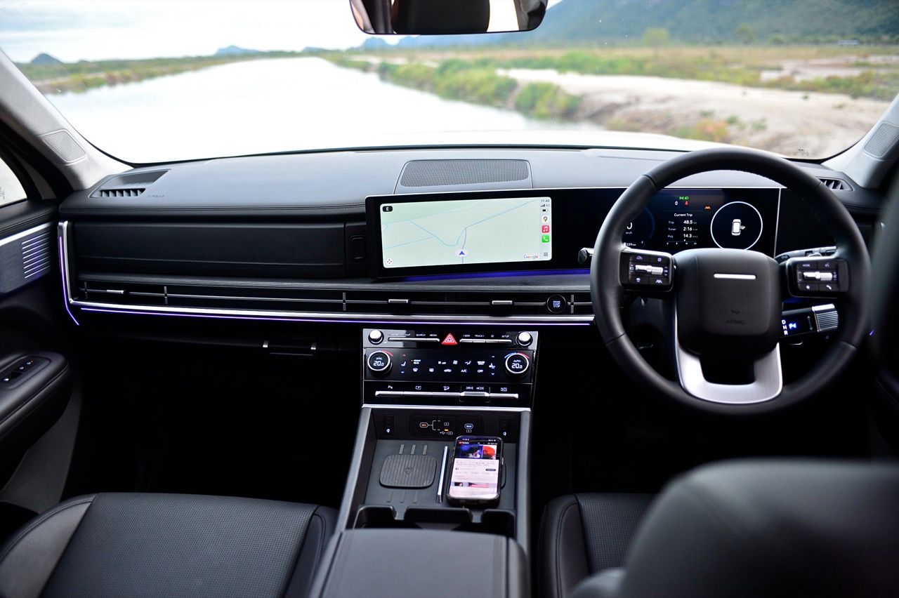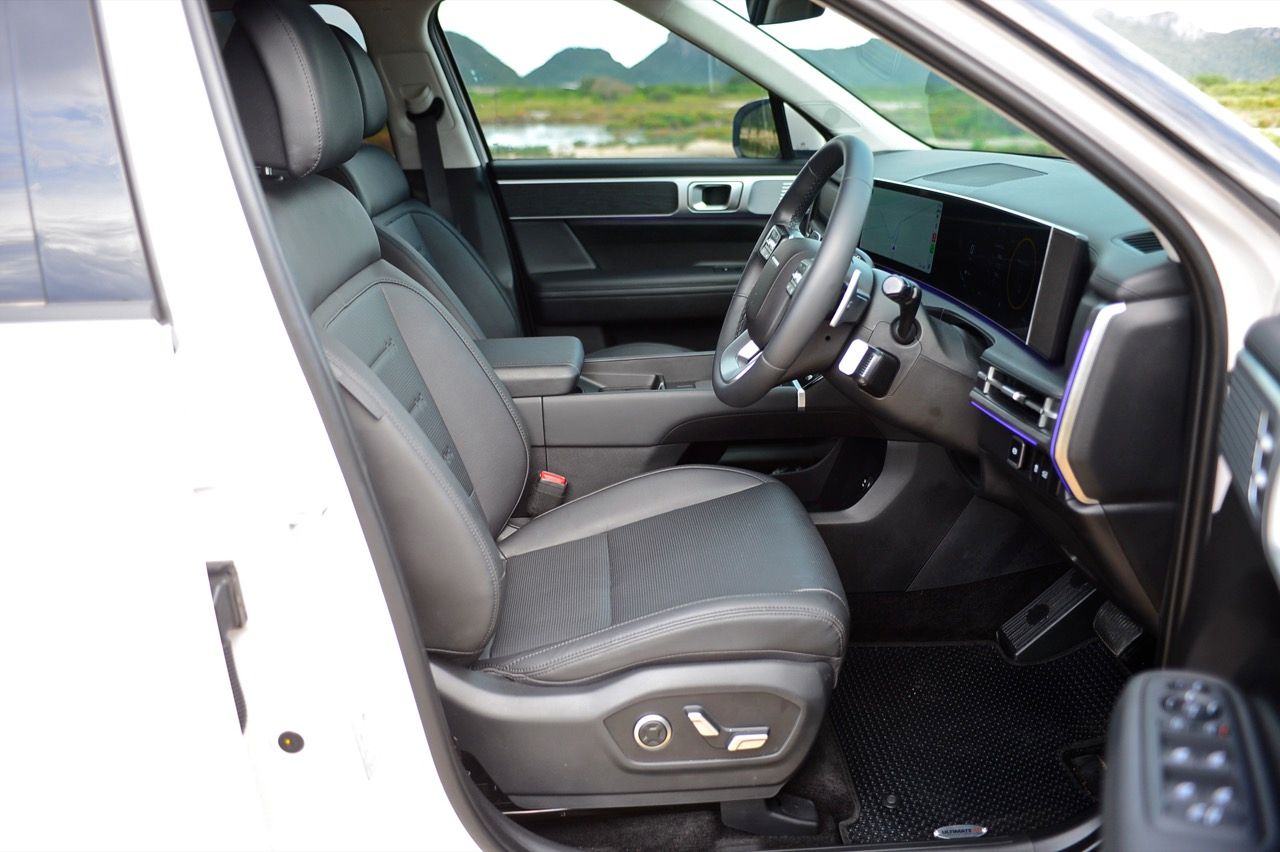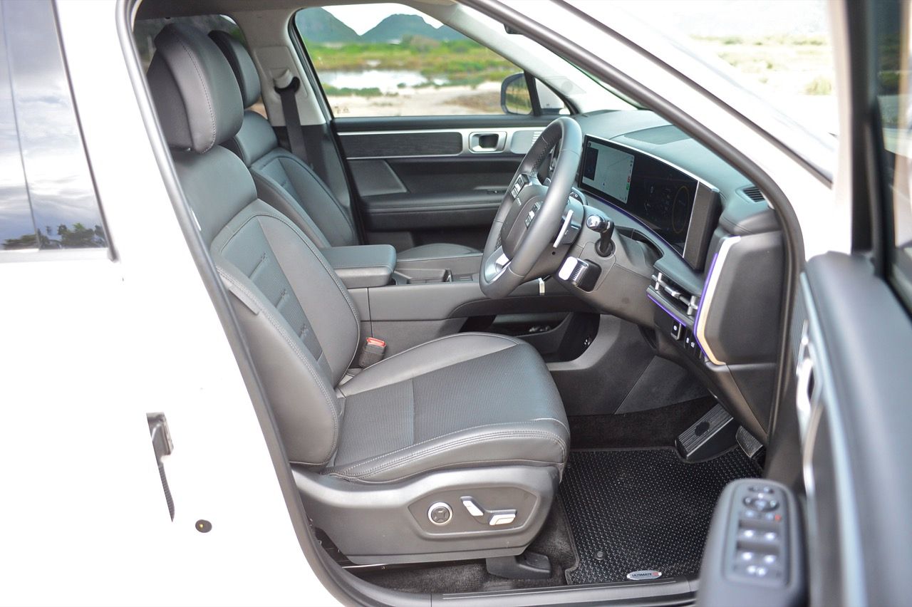 ราคา 1.74 ล้านบาทของ Hyundai Santa Fe รุ่นสูงสุดที่ขายในไทยและใช้การนำเข้าจากเวียดนามจึงไม่ใช่รถราคาประหยัด มันแพงกว่ารถไฟฟ้าจีนหรือ PPV ดีเซลอย่างเห็นได้ชัด แต่ด้วยขนาดที่ใหญ่กว่า เครื่องยนต์ไฮบริดทำงานได้อย่างยอดเยี่ยม ที่สำคัญกว่านั้น Santa Fe ให้ฟิลลิ่งการขับขี่ที่ดีพอๆ กับ Volvo XC90 หรือ BMW X3 ในบางสถานการณ์ แต่ราคาถูกกว่ามาก Hyundai ปรับแต่งช่วงล่างและสัมผัสของพวงมาลัยใน new Santa Fe ได้อย่างยอดเยี่ยม การตกแต่งภายในยังให้ความรู้สึกหรูหรามีระดับ แต่ยังคงความสะดวกสบายและใช้งานได้จริง ชุดแอร์แยกจากหน้าจอพร้อมปุ่มและสวิชท์ควบคุมที่ใช้งานง่าย ปุ่มปรับกระจกมองข้างยังมีให้ใช้งานเหมือนเดิมไม่ได้เอาไปยัดไว้ในจอ เบาะไฟฟ้าคนขับ มีตำแหน่งท่านั่งที่ดี เบาะปรับได้หลากหลาย เบาะนั่งแสนสบายเหมาะสำหรับการเดินทางไกลจากการะบายความร้อนตัวเบาะด้วยแอร์ พวงมาลัยเองก็หนาจับถนัดมือ ปุ่มกดทำจากวัสดุที่แข็งแรง การเปลี่ยนเกียร์เดินหน้า ถอยหลัง ให้ความรู้สึกนุ่ม คันเกียร์แบบก้านบิดอยู่ในตำแหน่งด้านขวาของคอพวงมาลัยเหมือนกับ Mercedes-Benz ใช้งานง่าย แต่แรกๆ ก็ต้องสร้างความคุ้นชินกันสักพัก เดี๋ยวเดียวคุณจะชอบความสะดวกของเกียร์แบบใหม่ของ Hyundai ที่มีอยู่ในแบรนด์ตราดาวมานานแล้ว