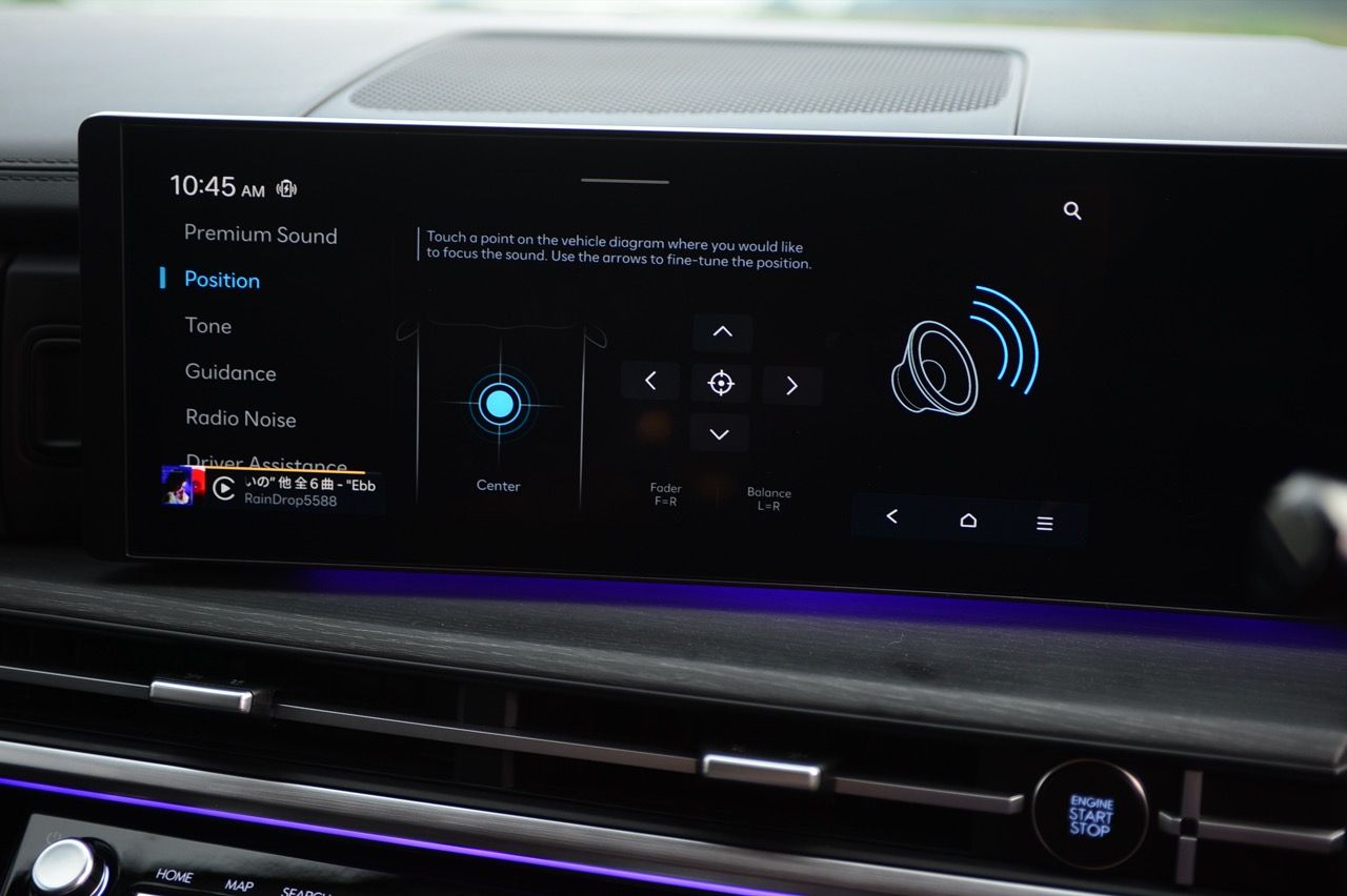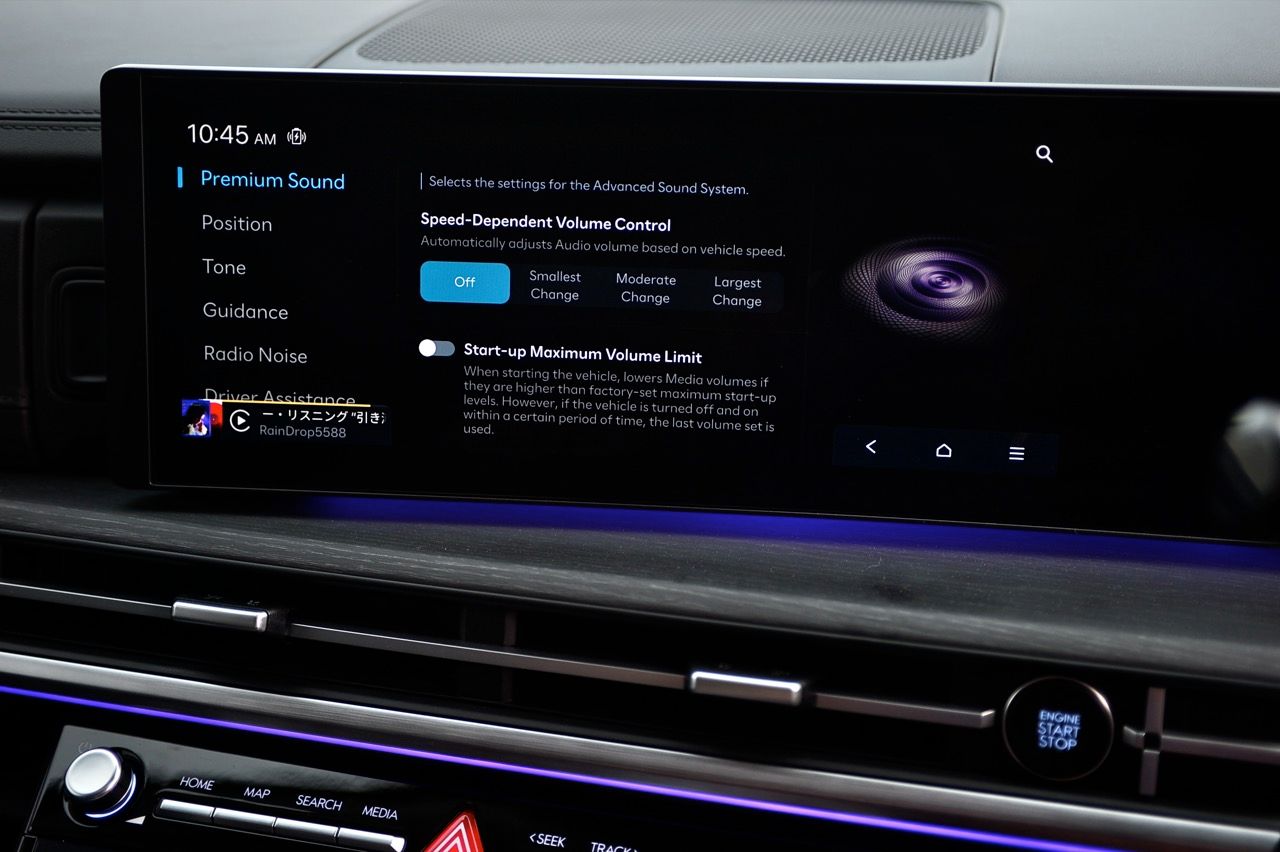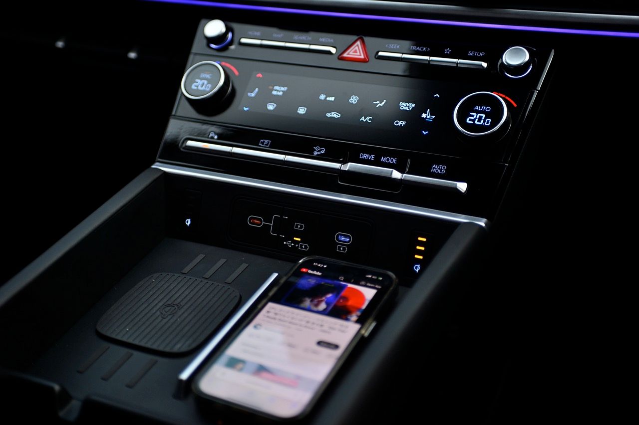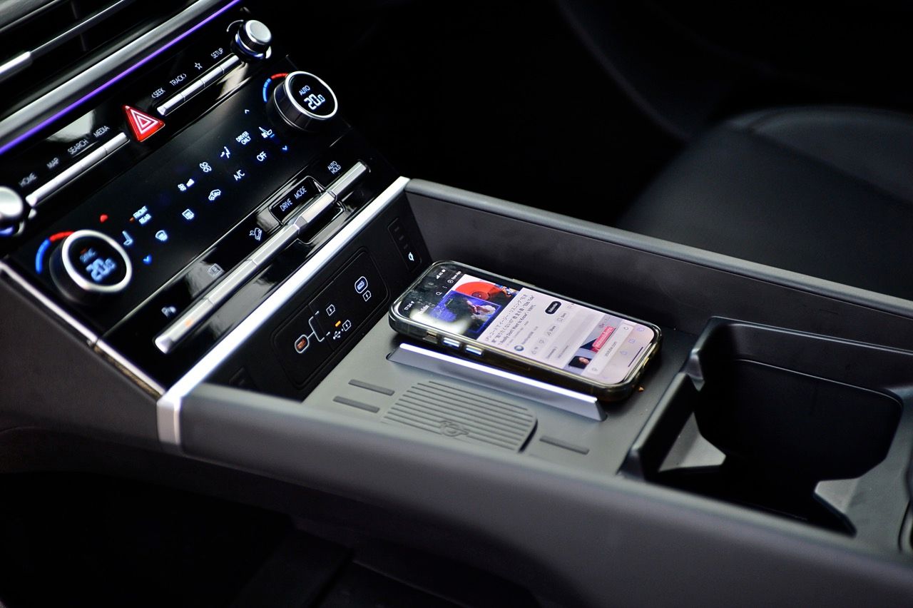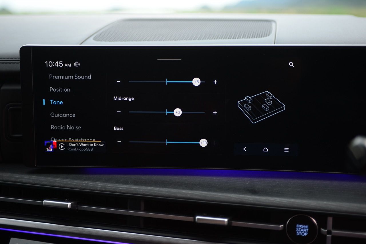 หน้าจอขนาด 12.3 นิ้วสองจอที่บรรจุแผงหน้าปัดและอินโฟเทนเมนต์ของผู้ขับขี่นั้นดูสะอาดตาและอ่านง่าย พร้อมหน้าปัดที่เรียบง่ายให้ผู้ขับขี่อ่านได้ ตัวอินโฟเทนเมนต์เองก็ไม่ได้ใช้งานง่ายนัก เนื่องจากมีเมนูมากมายและการจัดวางตัวเลือกที่ไม่สมเหตุสมผล ทำให้ประสบการณ์การใช้งานค่อนข้างยุ่งยาก อย่างไรก็ตาม คำวิจารณ์นี้สามารถเกิดขึ้นได้กับรถยนต์ฮุนไดเกือบทุกรุ่น (รวมถึง Kia และ Genesis) เนื่องจากใช้ระบบเดียวกัน ปุ่มควบคุมขนาดใหญ่ช่วยชดเชยการเข้าถึงหน้าจออินโฟเทนเมนต์ ได้อย่างรวดเร็ว พื้นที่เก็บของมีมากพอๆกับห้องใต้หลังคาเลยทีเดียว มีช่องเก็บของที่ประตูด้านหน้า ขนาดกำลังพอเหมาะ (ซึ่งใหญ่กว่าที่เห็นในภาพ) พื้นที่เก็บของขนาดใหญ่ใต้คอนโซลกลาง และช่องเก็บของที่เท้าแขนตรงกลางขนาดใหญ่ ติดตั้งที่ชาร์จโทรศัพท์ไร้สายไว้ที่คอนโซลกลาง รายละเอียดเล็กๆ น้อยๆ ทำให้ภายในห้องโดยสารมีความสะดวกสบาย ไม่ว่าจะเป็นพื้นที่เก็บของบนแผงคอนโซลด้านบนสำหรับผู้โดยสาร ช่องเก็บของใต้แท่นชาร์จไร้สาย สำหรับร้อยสายไฟในกรณีที่โทรศัพท์ไม่สามารถชาร์จแบบไร้สายได้ และช่องเก็บของที่เท้าแขนตรงกลางที่สามารถเปิดออกได้ทั้งผู้โดยสารด้านหน้าและด้านหลัง
