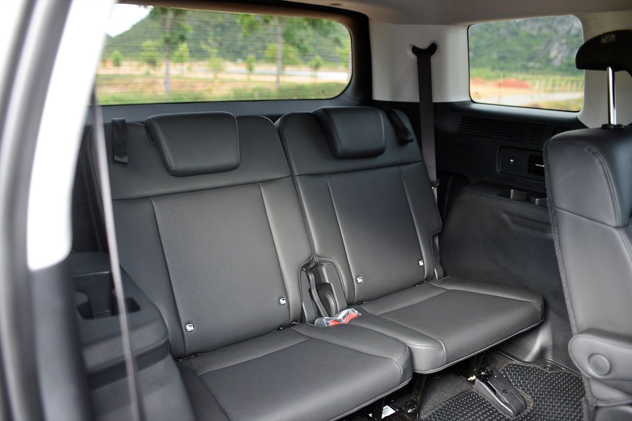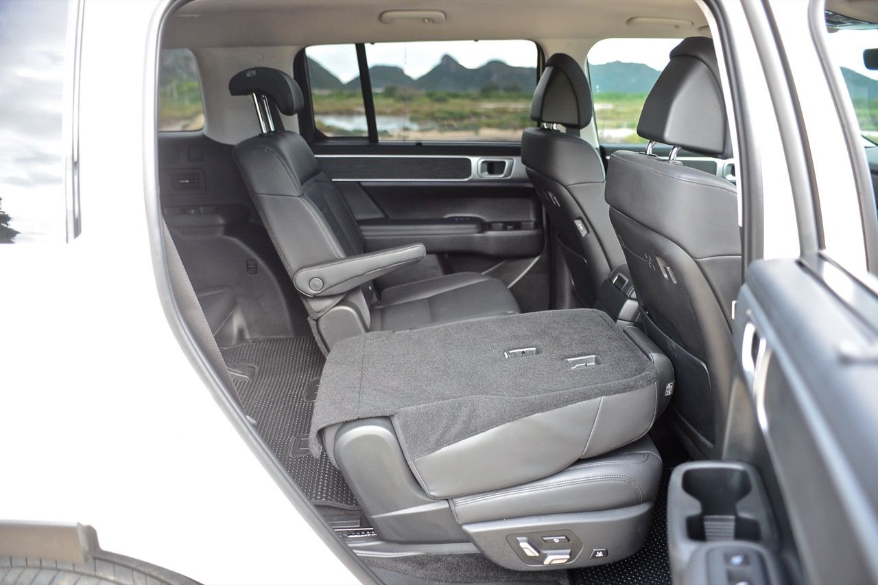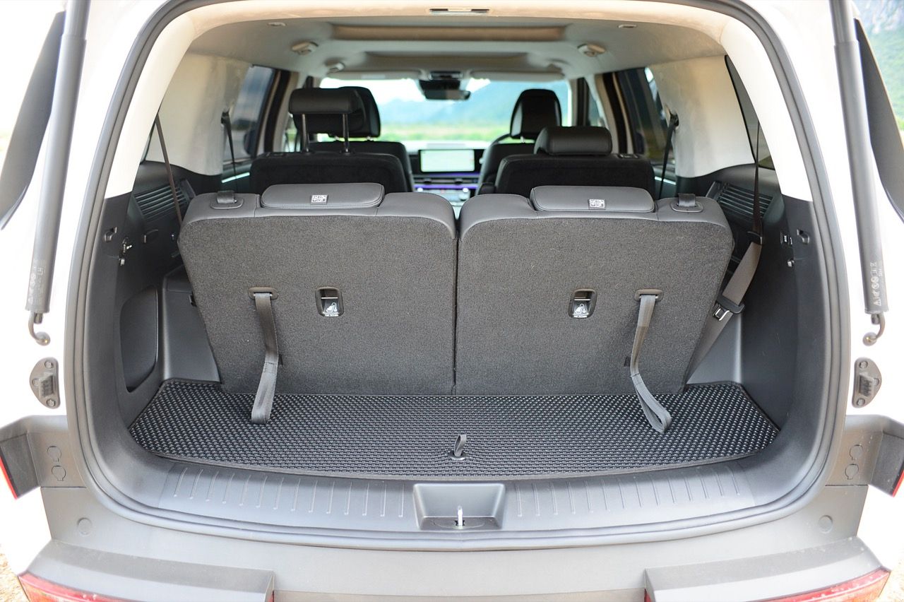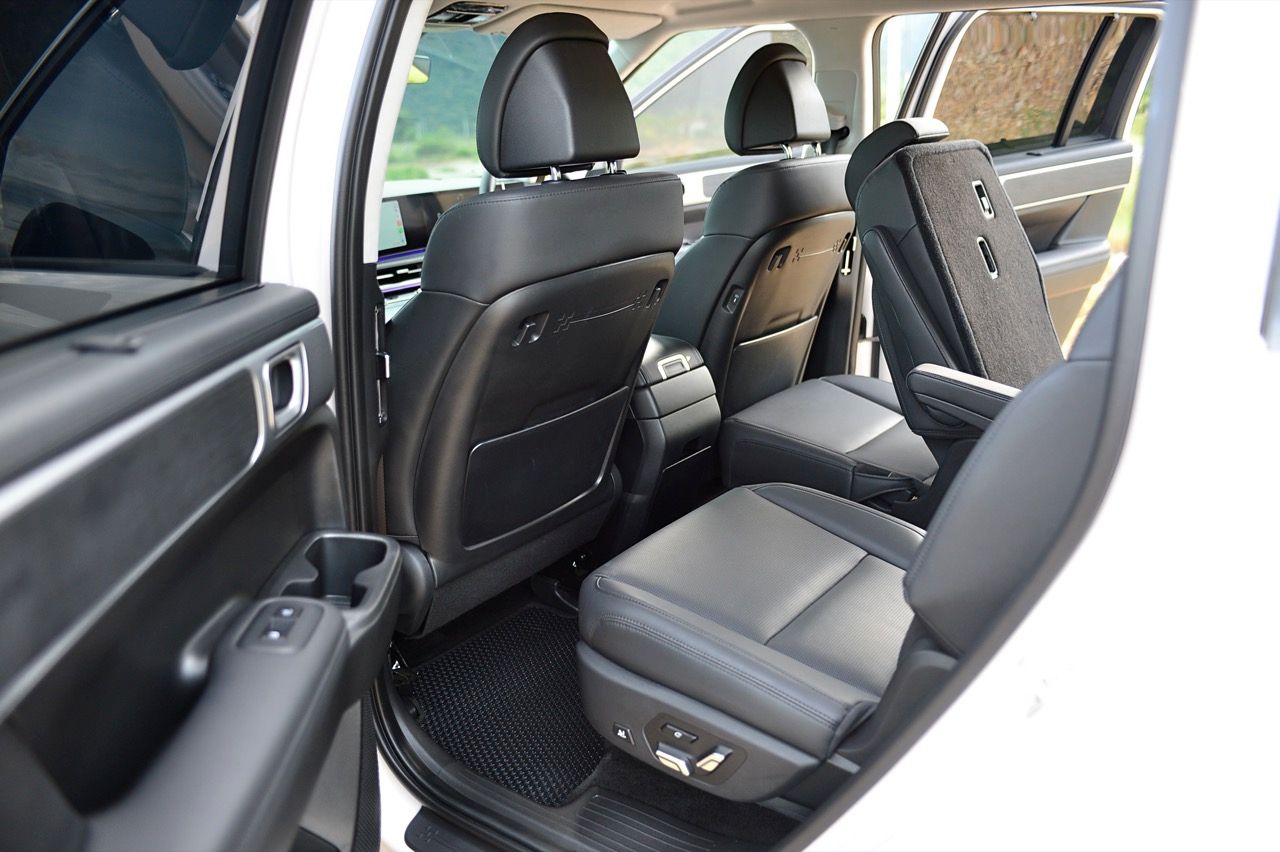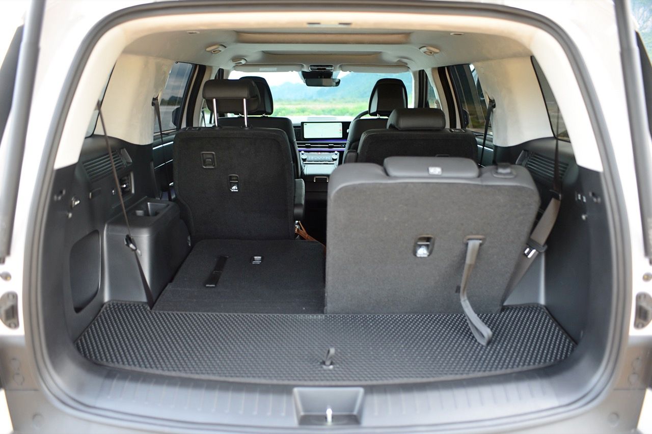 ในส่วนของพื้นที่เบาะหลัง ผู้โดยสารแถวหลังมีพื้นที่กว้างใช้ได้ เบาะหลังแบบพับแยก 60:40 เลื่อนและปรับเอนได้ มีพื้นที่สำหรับผู้ใหญ่ แม้ว่าเบาะกลางจะสูงกว่าและแคบกว่าสองเบาะด้านนอกเล็กน้อย แต่ก็ยังมีพื้นที่เพียงพอ และพื้นรถที่เรียบเสมอกันช่วยให้มีพื้นที่วางเท้าแบบไม่เมื่อยเมื่อนั่งโดยสารทางไกล ผู้โดยสารแถวหลังมีพอร์ต USB-C ติดตั้งอยู่ที่พนักพิงเบาะหน้าแต่ละข้าง สำหรับชาร์จอุปกรณ์อิเล็กทรอนิกส์ ตะขอเกี่ยวกระเป๋าสำหรับแขวนของหรือกระเป๋าถือไม่ให้หล่นจากพื้น ที่วางแก้วน้ำสองช่องในแต่ละประตู รวมถึงช่องเก็บของที่ประตูขนาดใหญ่พอสำหรับขวดน้ำ หากพับที่วางแขนตรงกลางลง ะสามารถวางแก้วน้ำเพิ่มได้อีกสองช่อง การเข้าออกจากเบาะแถวที่สามสะดวกพอสมควร กดปุ่มที่ไหล่ของเบาะแถวกลาง เบาะก็จะพับไปข้างหน้าโดยอัตโนมัติ เมื่อกลับมาถึงเบาะหลังแล้ว มีพื้นที่วางขาเพียงพอสำหรับผู้ใหญ่นั่งได้สบาย หากเลื่อนเบาะแถวกลางไปข้างหน้าเพียงหนึ่งหรือสองครั้ง ฐานเบาะนั่งตั้งไว้ค่อนข้างต่ำ ทำให้เข่าของคุณนั่งสูง ซึ่งไม่สบายนักสำหรับการเดินทางไกล เบาะผู้โดยสารแถวสามยังมีระบบควบคุมเครื่องปรับอากาศ ที่วางแก้วน้ำอีกสี่ช่อง และพอร์ต USB-C
