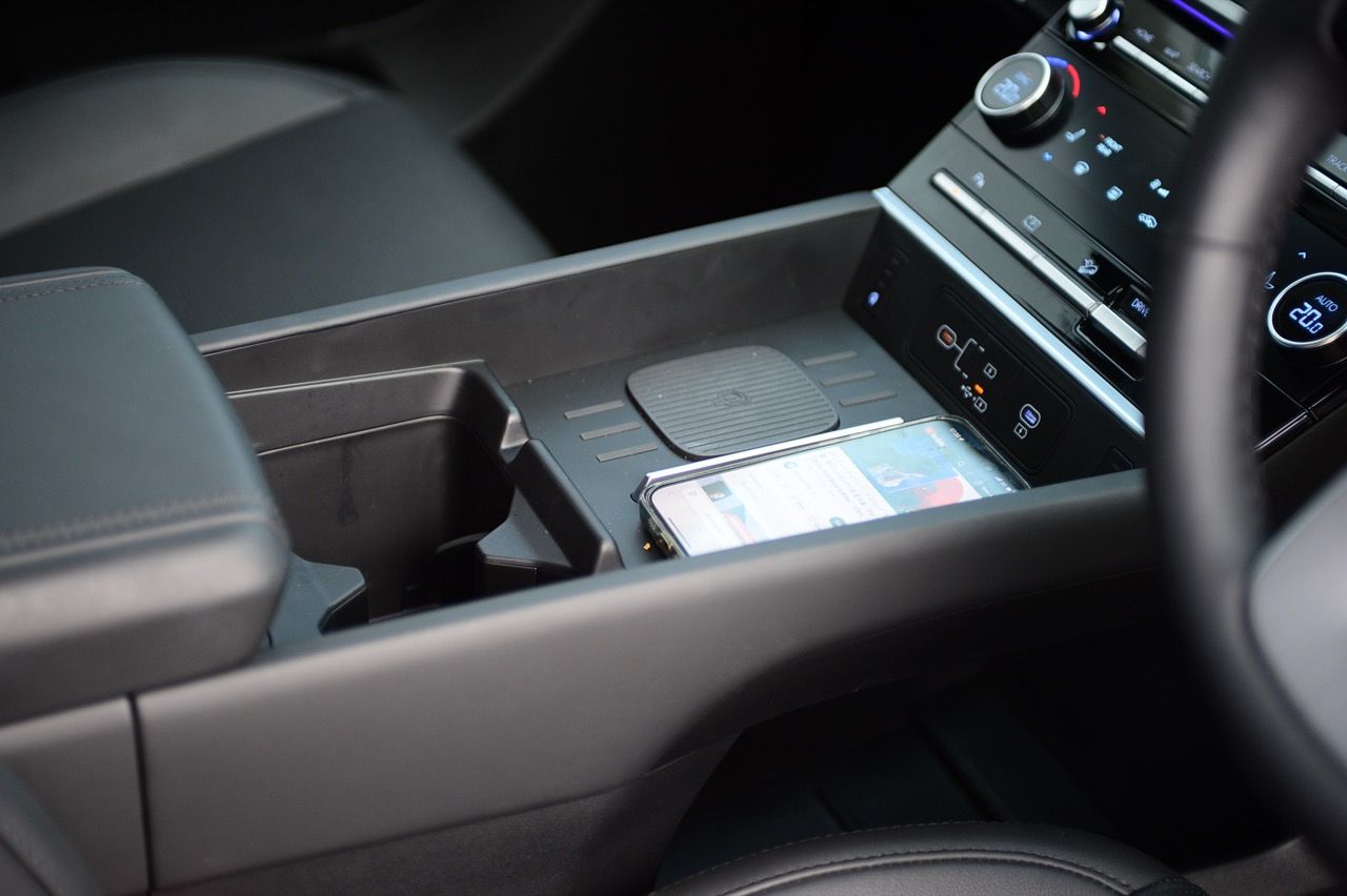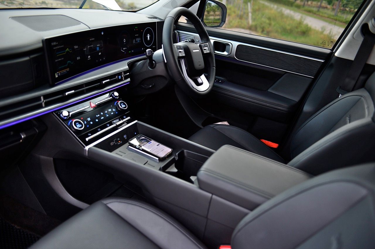 เบาะนั่งด้านหน้าของ Santa Fe มีขนาดใหญ่และสะดวกสบาย เบาะนั่งและพวงมาลัยที่ปรับได้หลากหลายสำหรับสรีระของผู้ขับ สิ่งที่ประทับใจจริงๆ คือพื้นที่เก็บของที่กว้างขวาง ไม่เพียงแต่จะมีช่องเก็บของที่ประตูขนาดใหญ่และกล่องเก็บของที่ใช้งานได้จริงเท่านั้น แต่ที่วางแก้วก็ใหญ่โตเช่นเดียวกับช่องเก็บของตรงกลาง สามารถเปิดช่องเก็บของจากแถวกลางได้อีกด้วย ซึ่งมีประโยชน์มาก กล่องเก็บของแบบตื้นๆ อีกหนึ่งช่องที่สูงกว่าแผงหน้าปัด คันเกียร์ของ Santa Fe ยื่นออกมาจากคอพวงมาลัย ทำให้มีพื้นที่ตรงกลางสำหรับสมาร์ทโฟนสองเครื่องบนที่วางยางแบบจับถนัดมือ หนึ่งในนั้นคือที่ชาร์จไร้สายเป็นอุปกรณ์มาตรฐาน และทั้งสองช่องก็ติดตั้งในรุ่นท็อป