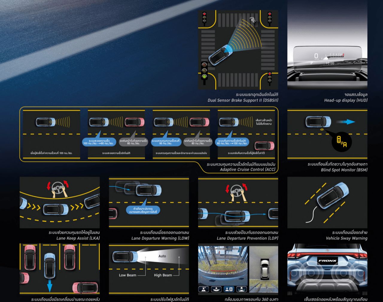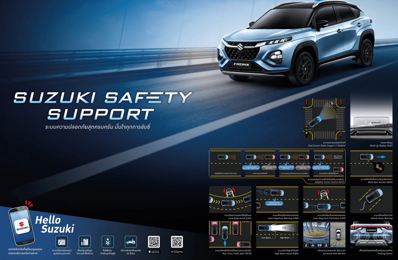 Suzuki Fronx ครอสโอเวอร์ขนาดกะทัดรัด ฐานล้อ 2520 มิลลิเมตร เป็นการทำตลาดต่อยอดจากรถอเนกประสงค์ของ Suzuki ในรุ่น XL7 ในความเป็นจริง Suzuki Fronx อยู่ในกลุ่ม BSUV เซกเมนท์นี้ มีคู่แข่งคือ Toyota Yaris Cross Nissan Kicks e-POWER, Mitsubishi X-Force และ Honda WR-V นอกจากฐานล้อที่สั้นกระชับแล้ว Fronx ยังเป็นรถที่ Suzuki ตั้งใจใส่อุปกรณ์ใหม่ๆ มาให้ใช้งาน ด้วยราคาที่พอจะรับได้ ดังนี้