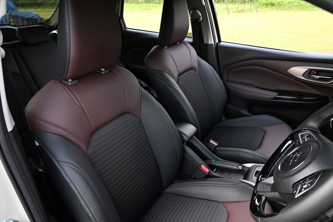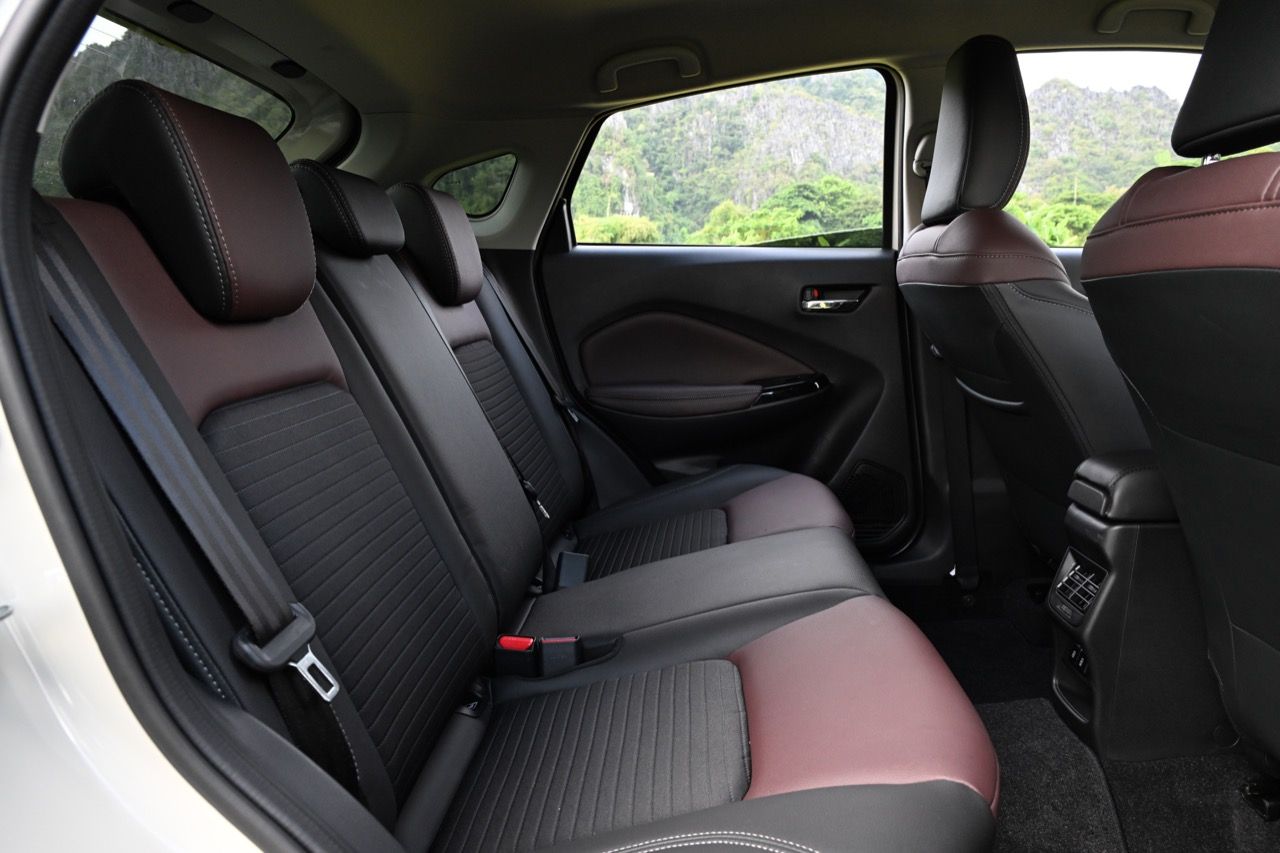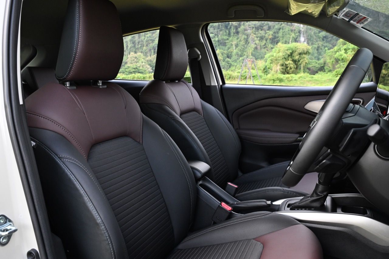 เบาะคู่หน้าปรับอัตโนมือ คือใช้มือยกหรือโยก แต่ก็สามารถปรับน่านั่งได้อย่างครอบคลุม ไม่สะดวกสบายเท่าเบาะปรับไฟฟ้าแต่ใช้งานระยะยาวถืกๆ ทนๆ เบาะหลังมีพื้นที่ไม่มากนัก นั่งสองคนตัวไม่สูงเกิน 175 เซนติเมตร ถือว่ากำลังสบาย แต่ถ้าตัวสูงกว่านั้นให้มานั่งหน้าจะดีกว่า วัสดุหุ้มเบาะนุ่มและนั่งสบายกว่า XL7 การออกแบบตัวเบาะใหม่ทั้งหน้าและหลัง หลังคาที่เทลาดไปยังส่วนท้าย ทำให้พื้นที่เหนือศีรษะของผู้โดยสารเบาะหลังมีไม่มาก ไม่เหมาะกับคนตัวสูง รวมถึงพื้นที่วางขา ด้วยความที่เป็นรถฐานล้อสั้นนั่นเอง