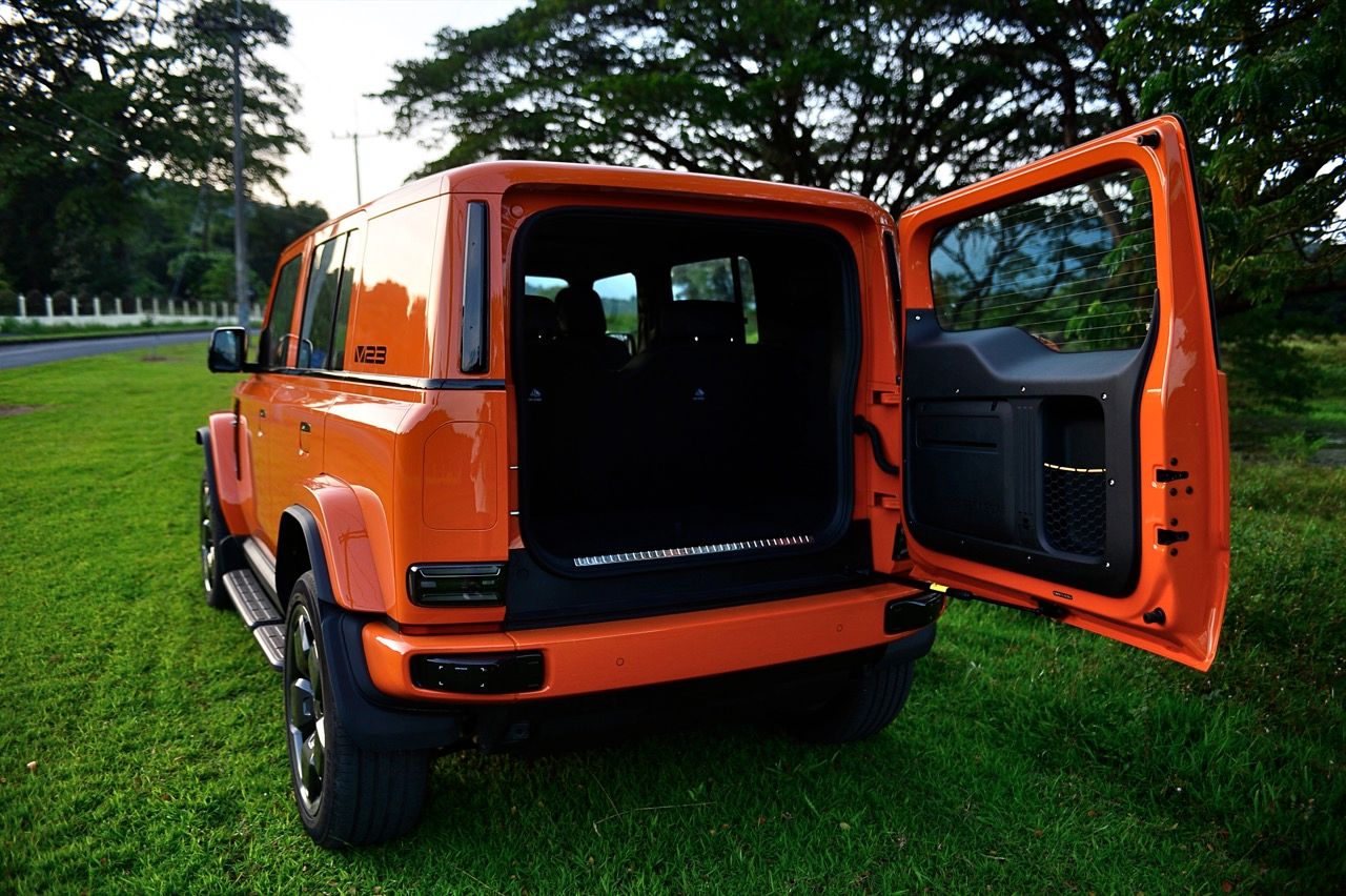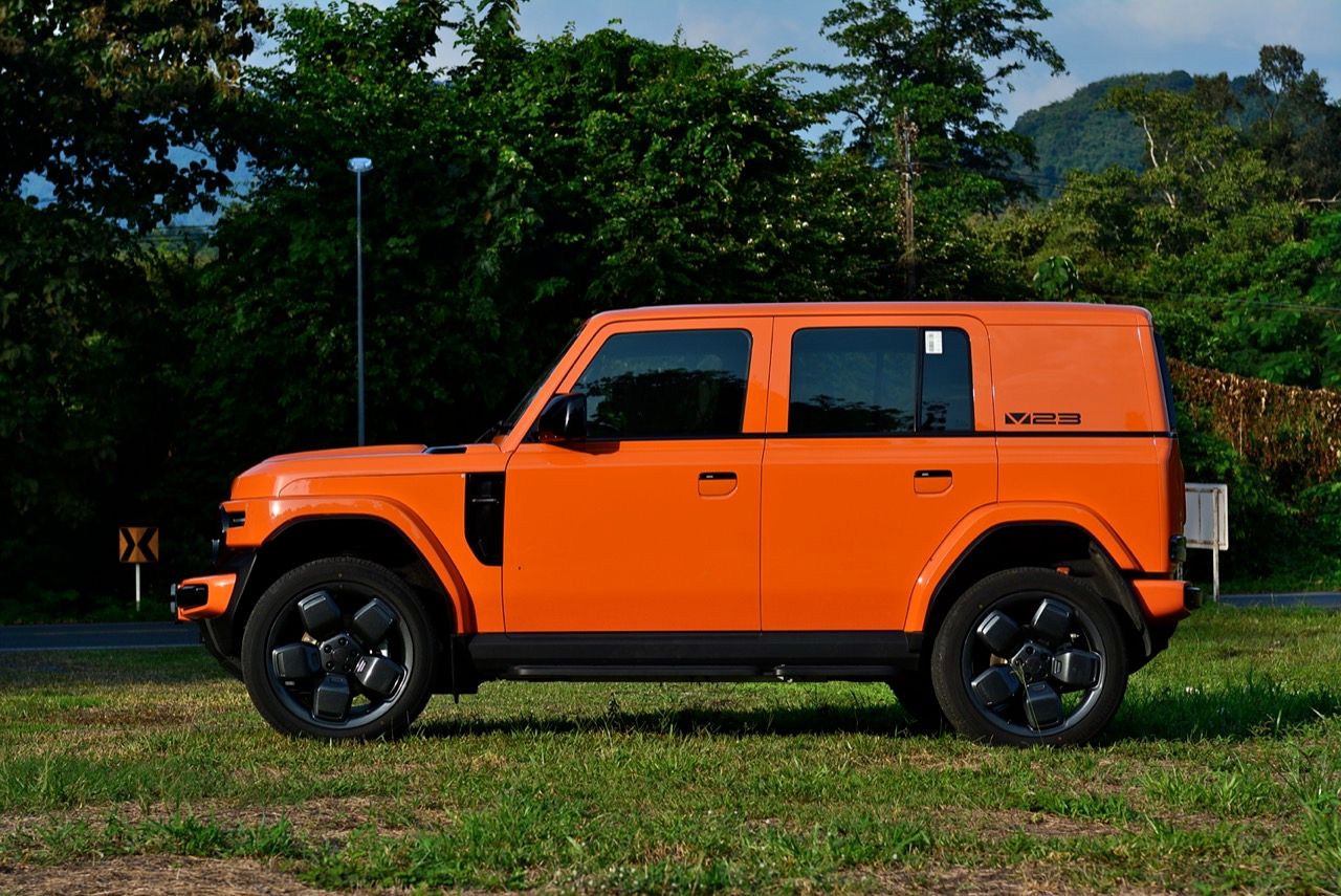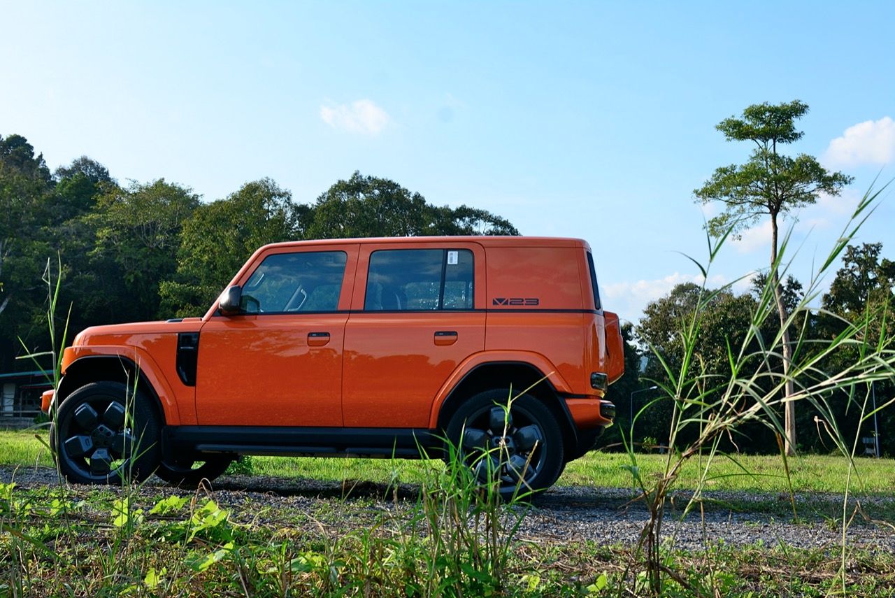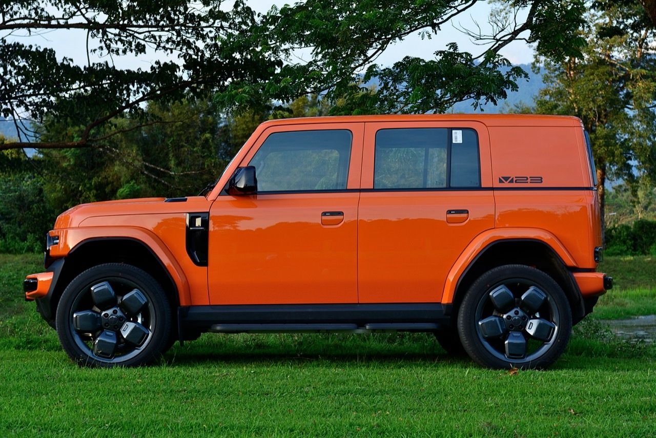 ทรงย้อนเวลาของ V23 มีไฟหน้า LED ทรงกลม ไฟ Daytime Running Light แบบ LED อยู่ภายในเป็นขีดเรืองแสงที่สว่างใช้ได้ในตอนกลางวัน V23 รุ่นท็อป มีระบบไฟหน้า เปิด-ปิด อัตโนมัติ ระบบไฟหน้า Follow-me-home ระบบปรับระดับไฟหน้า สูง-ต่ำ บั้นท้ายตันทึบสไตล์กล่องนม มีไฟท้าย LED ทรงเดียวกับ G-Class ซึ่งทำออกมาได้ดีแม้จะเป็นการลอกเลียนแบบก็ตาม ไฟเบรกดวงที่ 3 LED ปัดน้ำฝนหลังที่บานกระจกฝาท้ายไม่มีมาให้ ฝนตกคงเลอะน่าดูชม ฝาท้ายแน่นอนว่าย้อนเวลาไปจนถึง FJ Cruiser ด้วยฝาท้ายแบบอัตโนมือ เปิดออกด้านข้าง ไม่ต้องออกแรงยกแต่อย่างใดทั้งสิ้น แต่ค้ำโช้คฝาท้ายค่อนข้างแข็งต้องออกแรงเล็กน้อยเพื่อเปิดออก พื้นที่เก็บสัมภาระส่วนท้ายมีพอเพียง ถ้าพับเบาะหลังก็ยิ่งใส่ของชิ้นโตๆได้แต่ก็จะสูญเสียที่นั่งเบาะหลังไปทั้งหมด บั้นท้ายของ V23 ยังติดตั้งไฟตัดหมอกหลัง ส่วนด้านข้าง ขึ้นลงจากรถได้สะดวกด้วยบันไดข้าง มือจับที่เปิดประตูด้านนอก พร้อมไฟส่องสว่างออกแบบให้แนบติดกับตัวถังเพื่อลดแรงต้านทานของกระแสลม กระจกมองข้างทรงเหลี่ยมที่เข้ากับทรงของตัวถัง กระจกหน้าต่างไฟฟ้า 4 บาน แบบ One-Touch กระจกมองข้าง ปรับด้วยไฟฟ้า พับด้วยมือ กระจกมองข้าง พร้อมระบบไล่ฝ้า เรียกว่าให้มาสมควรกับราคาไม่ถึง 9 แสนบาท จะเอาดีกว่านี้ก็ต้องกระโดดไป Land Rover defender ซึ่งน่าจะซื้อ V23 ได้เกินครึ่งโหล!