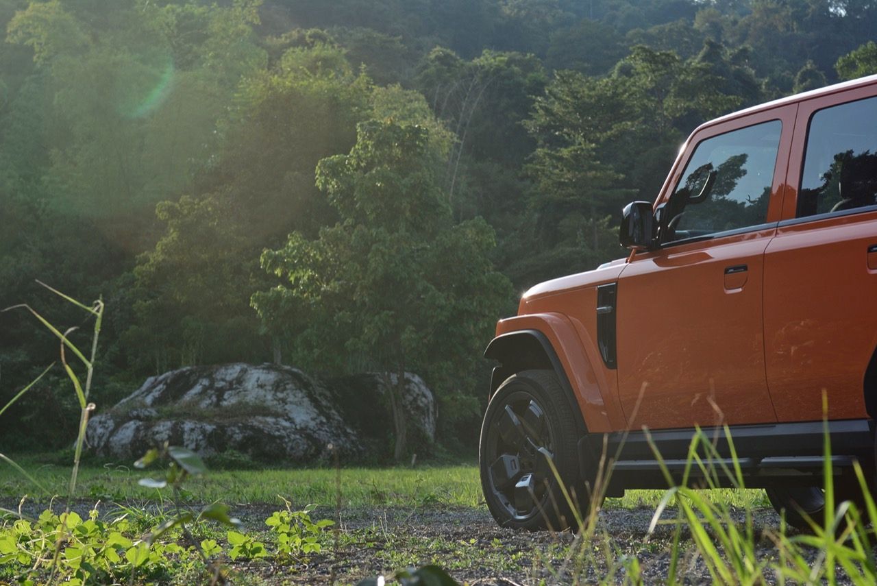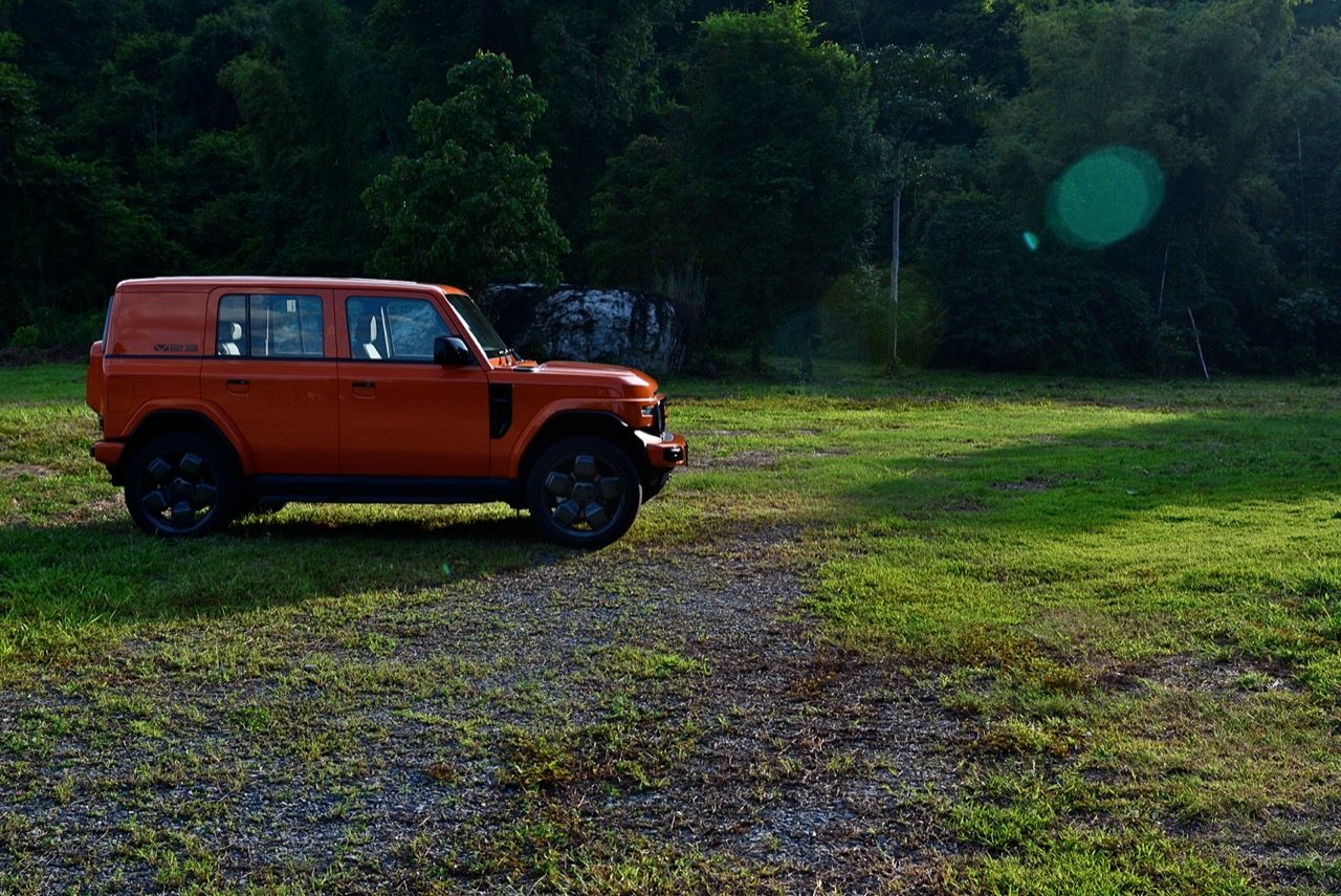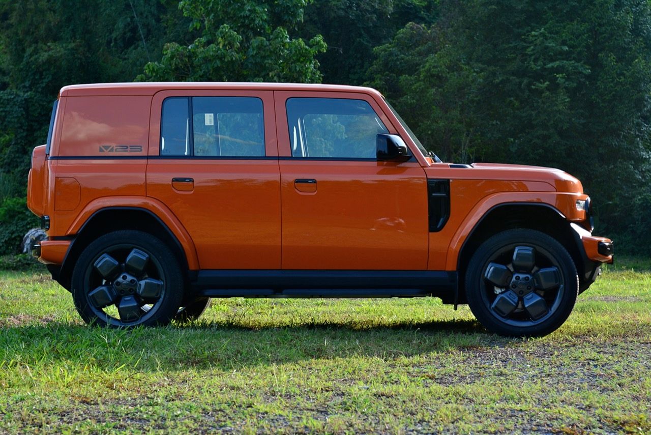 V23 มีพวงมาลัยในย่านความเร็วต่ำเบาไปนิด แต่เมื่อขับเร็วขึ้น พวงมาลัยไฟฟ้าของมันก็หน่วงน้ำหนักตามได้ดี การทรงตัว ยึดเกาะโค้ง กับยางจีนในล้อ 21 วิ่งนวลและเกาะถนนพอใช้ได้ ไม่ได้แน่นตึบเหมือน Land Rover ช่วงล่างออกแนวหนึบๆ ไมได้นุ่มจนย้วย มีกระเด้งบ้างเมื่อเจอกับคอสะพานดุๆ อาการโคลงผมมองว่าเป็นเรื่องปกติของรถทรงกล่องยกสูง ช่วงล่างทำหน้าที่บนทางเรียบได้ดี แต่เมื่อก้มลงดู ก็ไม่ควรจะเอาไปลุยหนัก ใช้ขับหล่อๆในเมืองจะเหมาะกว่า ช่วงล่างหลังมัลติลิ้งค์ให้การยึดเกาะส่วนท้ายที่สมดุลดีพอ ในโค้งก็มีอาการโคลงพองามเมื่อเจอกับผิวถนนไม่เรียบ ยาง 265/45 R21 ไม่เล็กไม่ใหญ่ เนื่องจากซุ้มล้อขนาดยักษ์ของ V23 การยัดล้อ 21 จึงดูเต็มสวยงามดี แต่ล้อขอบ 19 ของรุ่นขับเคลื่อนสองล้อนั่นดูสวยกว่าและมีขนาดยางที่น่าจะเหมาะสมกับการประหยัดพลังงาน ล้อ 19 ในรุ่นมอเตอร์เดี่ยว ลอกเลียนแบบกระทะล้อเหล็กในอดีต ต้องยอมรับหัวคิดของคนออกแบบล้อรุ่นนี้จริงๆ