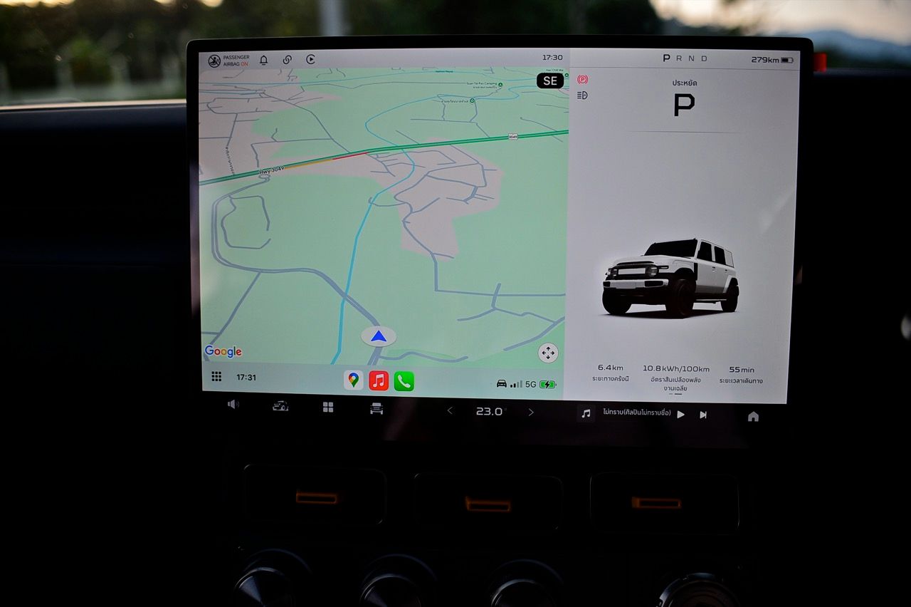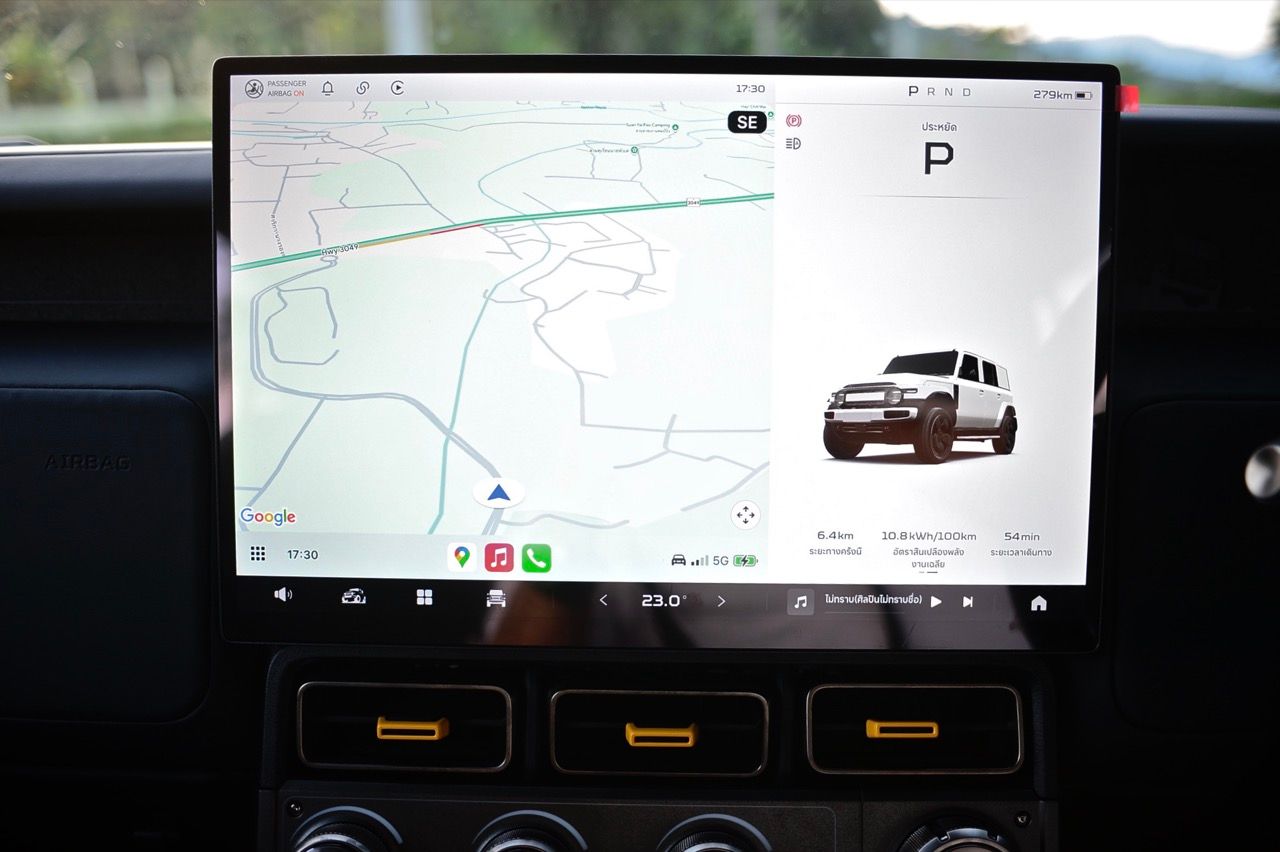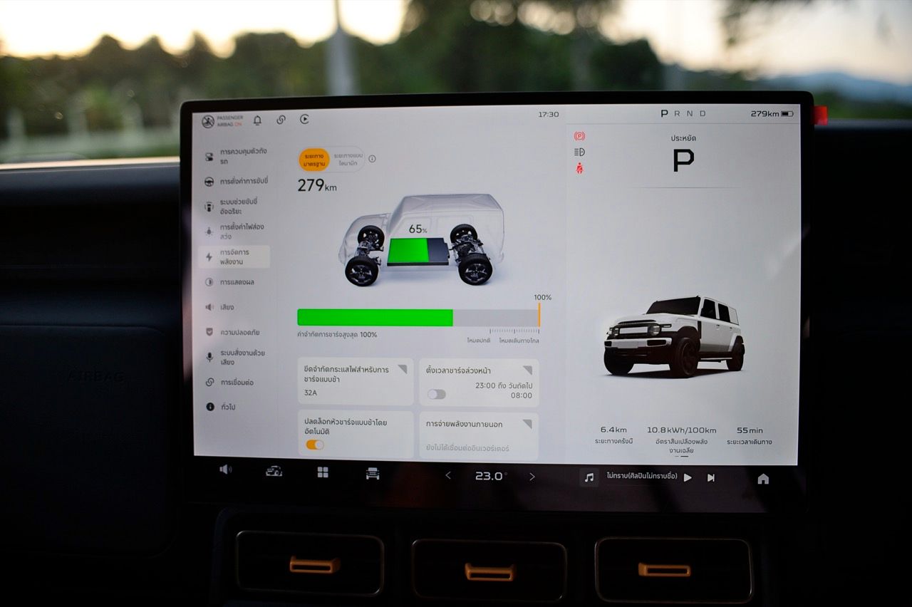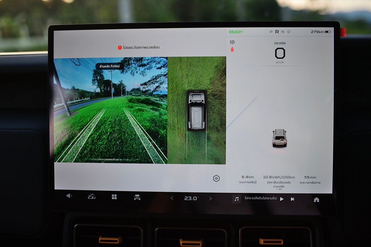 โหมดการขับขี่ 6 โหมด เพิ่มโหมด Off-Road เข้ามาให้แต่การขับทางไกลแบบไปเดี่ยวหัวเดียวกระเทียมลีบ หากไปลงหล่มขึ้นไม่ได้ก็จะสร้างปัญหาให้กับทั้งตัวเองและรถทดสอบ ผมขับออกทางไกลไปยังจังหวัดนครนายกต่อเนื่องไปจนถึงชายขอบของอุทยานเขาใหญ่ บนทางมอเตอร์เวย์ V23 ถูกใช้คันเร่งแบบค่อยเป็นค่อยไป รักษาความเร็ว 80 กิโลเมตรต่อชั่วโมงและอดใจเอาไว้เรื่องแซงรถช้า เพราะวันนี้ ตั้งใจจะมาลองขับแบบประหยัดไฟใน V23 เมื่อใช้ความเร็วต่ำ อัตรารับประทานไฟฟ้าของมอเตอร์อยู่ที่ 13.7kWh/100km อยู่ในเกณฑ์มาตรฐานทั่วไป ส่วนท่านที่เอาไปลอง ด้วยความที่เป็นมอเตอร์คู่ ซึ่งมักจะยั่วให้คนลองครั้งแรกกดคันเร่งแรงๆ ต่อเนื่อง เพื่อดูการตอบสนอง การทำแบบนั้นมันก็กินไฟตามปกติของรถไฟฟ้าที่มีสองมอเตอร์ละครับ แต่ถ้าใช้คันเร่งอย่างระมัดระวัง ระยะทาง จะอยู่ที่ 370 กิโลเมตร ต่อการชาร์จไฟมาเต็มแบตฯ ยอมรับว่าเวลากดนั้นดึงหนักใช้ได้และพวงมาลัยก็ปรับตัวให้สอดรับกับการเร่งความเร็วแบบฉับพลันทันทีได้ดี อัตราแดรกไฟเพิ่มเป็น 19.5 kWh/100 km จนต้องรีบยกคันเร่งกลับมาย่องเบาเอาไฟเหลือๆไว้ดีกว่า เพราะกะทดสอบแบบม้วนเดียวไป-กลับในระยะทาง 300 กิโลเมตรนิดๆ เผื่อเหลือ เผื่อขาด เพราะโทรศัพท์ไม่ได้ลงแอปชาร์จอะไรทั้งนั้น เรียกว่าถ้าไฟหมดกลางทางก็ต้องเรียกสไลส์ออนอย่างเดียว