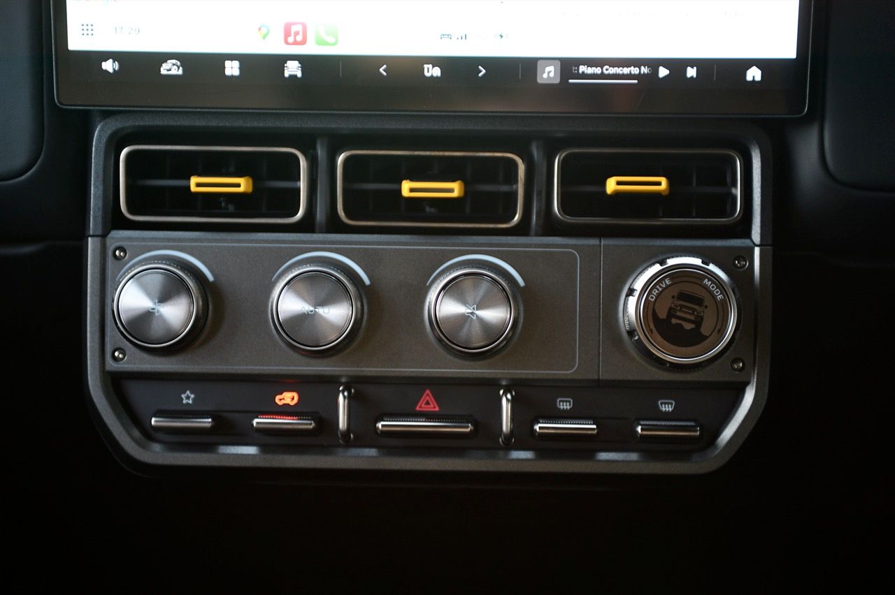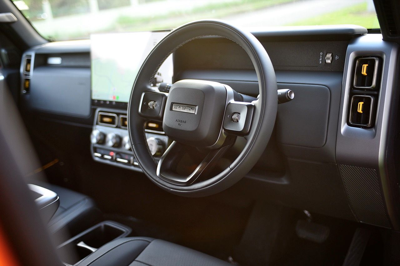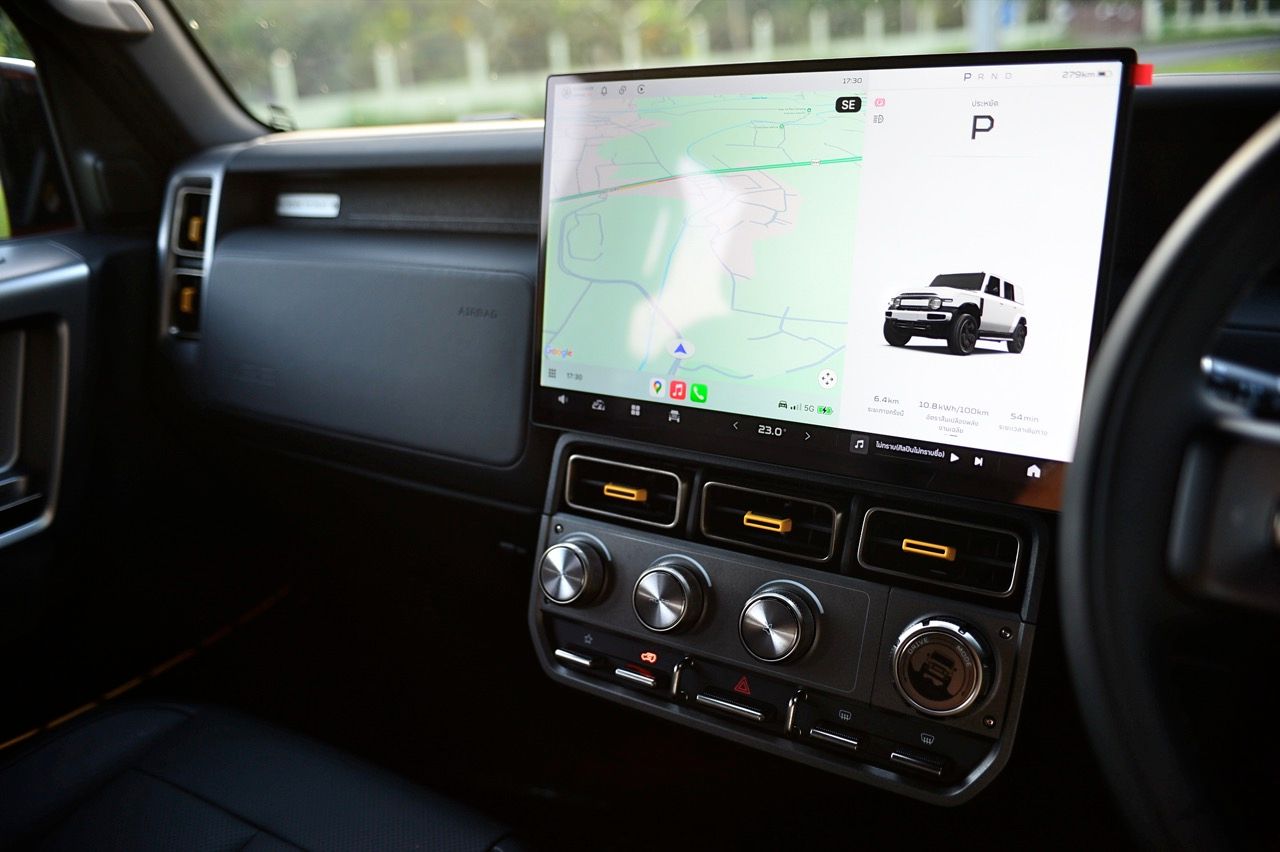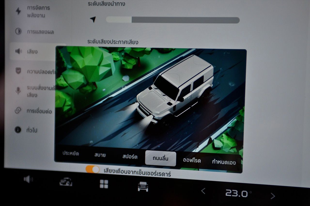 โหมดการขับขี่ 6 โหมด เพิ่มโหมด Off-Road เข้ามาให้แต่การขับทางไกลแบบไปเดี่ยวหัวเดียวกระเทียมลีบ หากไปลงหล่มขึ้นไม่ได้ก็จะสร้างปัญหาให้กับทั้งตัวเองและรถทดสอบ ผมขับออกทางไกลไปยังจังหวัดนครนายกต่อเนื่องไปจนถึงชายขอบของอุทยานเขาใหญ่ บนทางมอเตอร์เวย์ V23 ถูกใช้คันเร่งแบบค่อยเป็นค่อยไป รักษาความเร็ว 80 กิโลเมตรต่อชั่วโมงและอดใจเอาไว้เรื่องแซงรถช้า เพราะวันนี้ ตั้งใจจะมาลองขับแบบประหยัดไฟใน V23 เมื่อใช้ความเร็วต่ำ อัตรารับประทานไฟฟ้าของมอเตอร์อยู่ที่ 13.7kWh/100km อยู่ในเกณฑ์มาตรฐานทั่วไป ส่วนท่านที่เอาไปลอง ด้วยความที่เป็นมอเตอร์คู่ ซึ่งมักจะยั่วให้คนลองครั้งแรกกดคันเร่งแรงๆ ต่อเนื่อง เพื่อดูการตอบสนอง การทำแบบนั้นมันก็กินไฟตามปกติของรถไฟฟ้าที่มีสองมอเตอร์ละครับ แต่ถ้าใช้คันเร่งอย่างระมัดระวัง ระยะทาง จะอยู่ที่ 370 กิโลเมตร ต่อการชาร์จไฟมาเต็มแบตฯ ยอมรับว่าเวลากดนั้นดึงหนักใช้ได้และพวงมาลัยก็ปรับตัวให้สอดรับกับการเร่งความเร็วแบบฉับพลันทันทีได้ดี อัตราแดรกไฟเพิ่มเป็น 19.5 kWh/100 km จนต้องรีบยกคันเร่งกลับมาย่องเบาเอาไฟเหลือๆไว้ดีกว่า เพราะกะทดสอบแบบม้วนเดียวไป-กลับในระยะทาง 300 กิโลเมตรนิดๆ เผื่อเหลือ เผื่อขาด เพราะโทรศัพท์ไม่ได้ลงแอปชาร์จอะไรทั้งนั้น เรียกว่าถ้าไฟหมดกลางทางก็ต้องเรียกสไลส์ออนอย่างเดียว