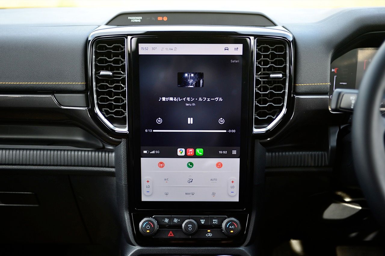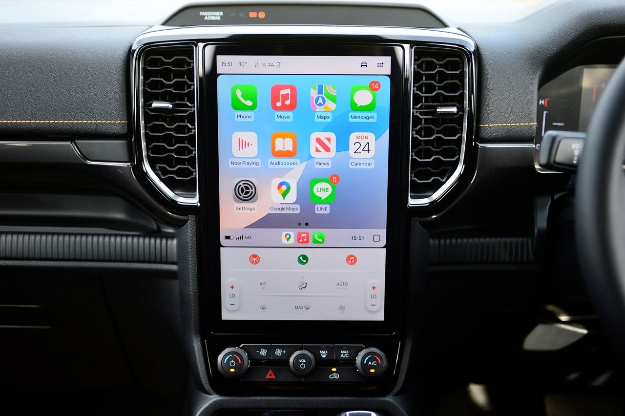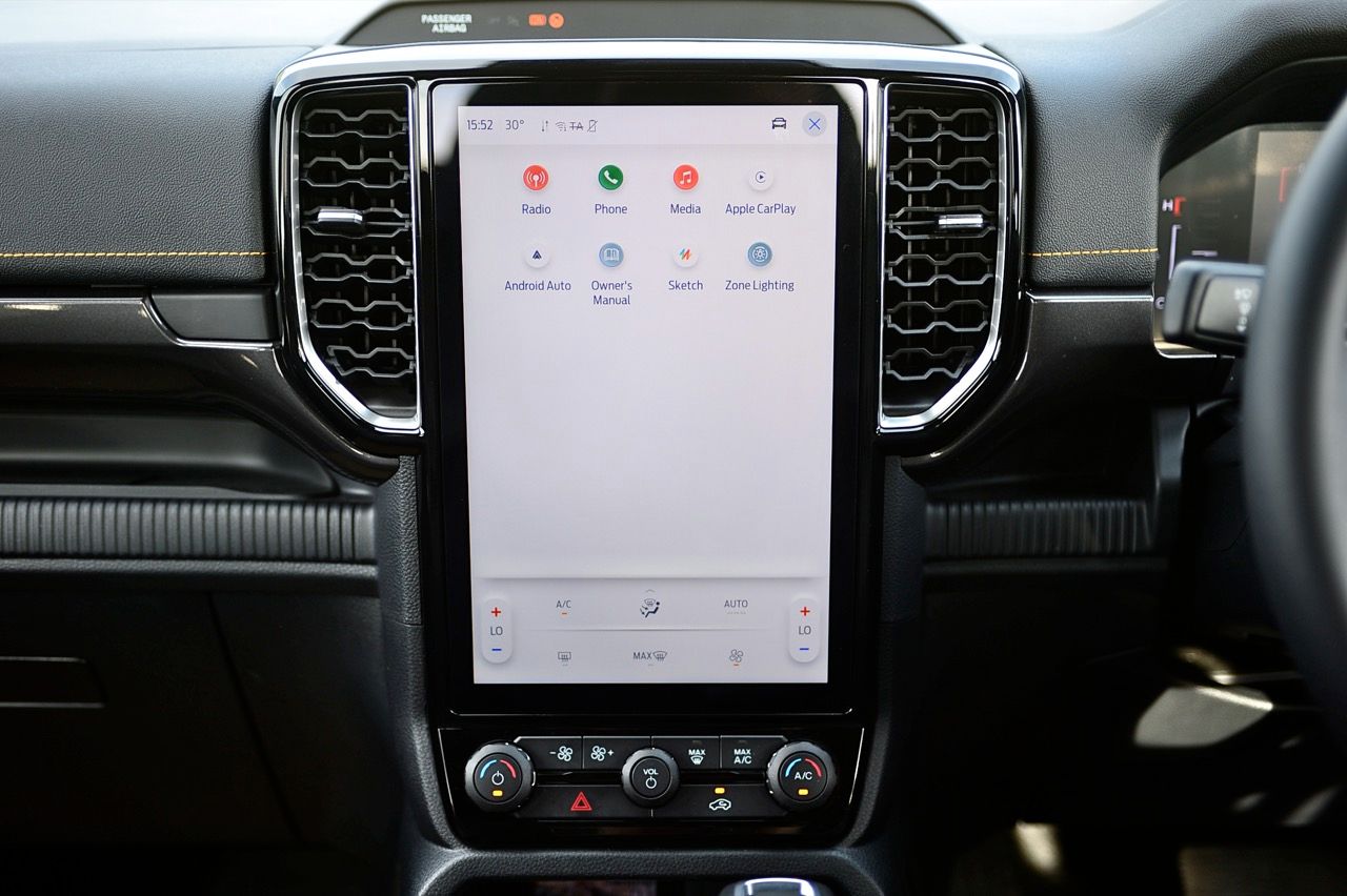 ระบบสั่งงานด้วยเสียง SYNC® 4A หัวใจสำคัญของเทคโนโลยีที่ติดตั้งใน New Ranger Wildtrak โดย SYNC® 4A เป็นระบบสื่อสารและความบันเทิงในรถ Ford ที่รองรับการเชื่อมต่อบน Apple CarPlay™ และ Android Auto™ มาพร้อมฟีเจอร์ใหม่ๆ เช่นการแสดงผลฟีเจอร์ที่ใช้งานล่าสุดก่อนเพื่อการใช้งานที่ง่ายขึ้น หน้าจอสัมผัส 12 นิ้ว เป็นจอที่ใหญ่ที่สุดในเซ็กเมนต์ เลือกการตั้งค่าหน้าจอแบบแยกส่วน ผ่านแป้นสั่งการที่อยู่ด้านล่างของหน้าจอ แสดงข้อมูลสำคัญ เช่น การเชื่อมต่อกับโทรศัพท์ และอุปกรณ์อื่นๆ การเลือกใช้หน้าจอแบบแท็บเล็ตขนาดใหญ่ เพื่อแสดงระบบแผนที่นำทางที่เชื่อมต่อกับแอปฯ ได้อย่างชัดเจน และยังเหลือพื้นที่ด้านล่างของจอสำหรับแสดงผลอื่นๆ เช่น ระบบปรับอากาศ และระบบควบคุมความบันเทิงอื่นๆ