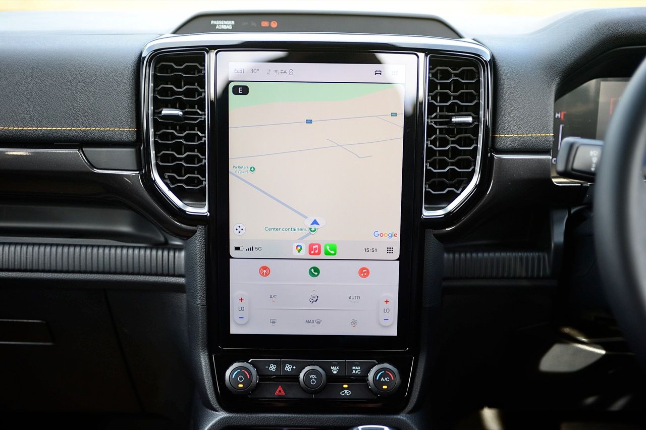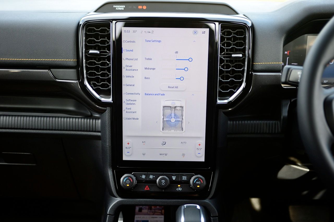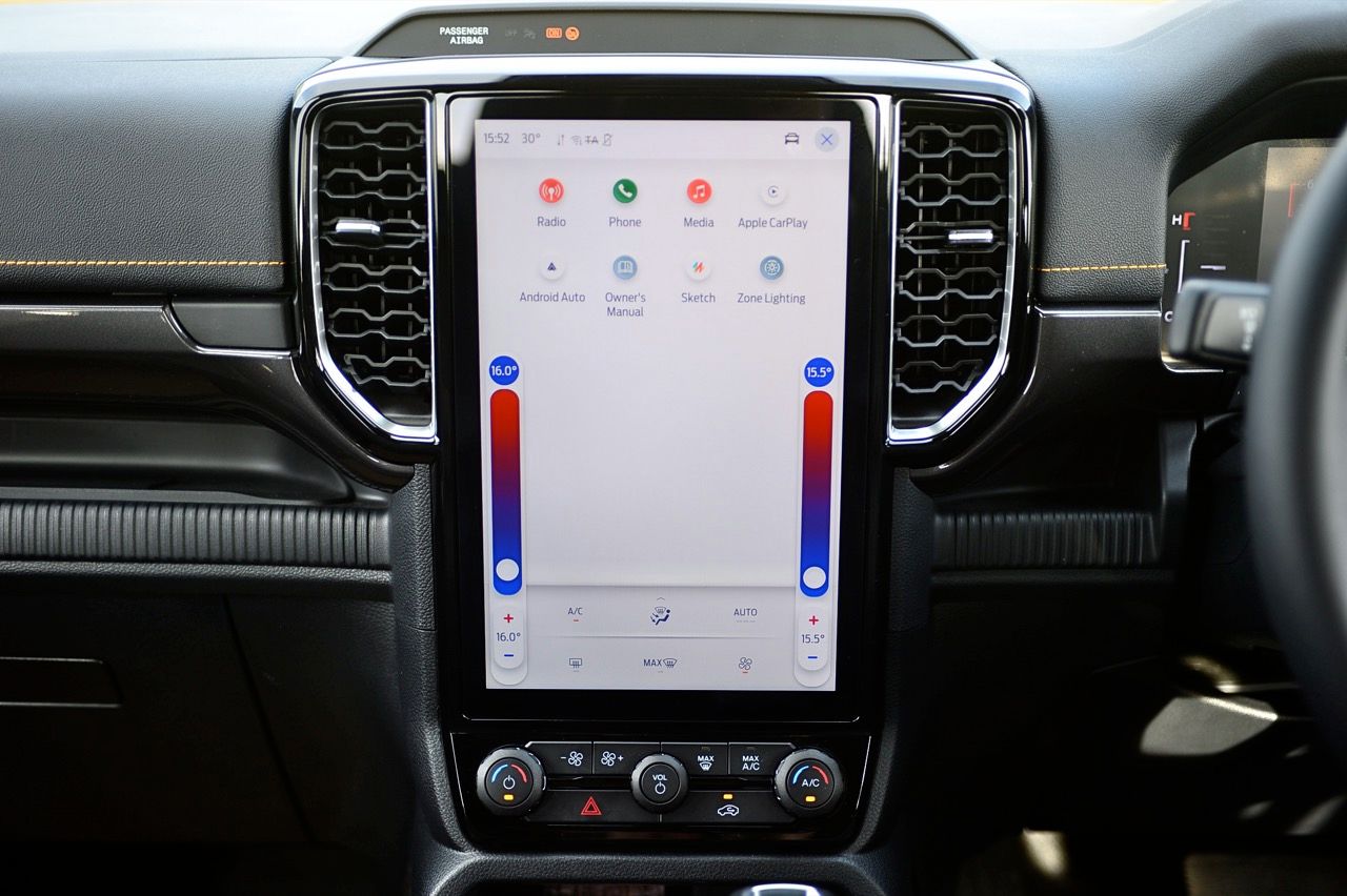 ระบบสั่งงานด้วยเสียง SYNC® 4A หัวใจสำคัญของเทคโนโลยีที่ติดตั้งใน New Ranger Wildtrak โดย SYNC® 4A เป็นระบบสื่อสารและความบันเทิงในรถ Ford ที่รองรับการเชื่อมต่อบน Apple CarPlay™ และ Android Auto™ มาพร้อมฟีเจอร์ใหม่ๆ เช่นการแสดงผลฟีเจอร์ที่ใช้งานล่าสุดก่อนเพื่อการใช้งานที่ง่ายขึ้น หน้าจอสัมผัส 12 นิ้ว เป็นจอที่ใหญ่ที่สุดในเซ็กเมนต์ เลือกการตั้งค่าหน้าจอแบบแยกส่วน ผ่านแป้นสั่งการที่อยู่ด้านล่างของหน้าจอ แสดงข้อมูลสำคัญ เช่น การเชื่อมต่อกับโทรศัพท์ และอุปกรณ์อื่นๆ การเลือกใช้หน้าจอแบบแท็บเล็ตขนาดใหญ่ เพื่อแสดงระบบแผนที่นำทางที่เชื่อมต่อกับแอปฯ ได้อย่างชัดเจน และยังเหลือพื้นที่ด้านล่างของจอสำหรับแสดงผลอื่นๆ เช่น ระบบปรับอากาศ และระบบควบคุมความบันเทิงอื่นๆ