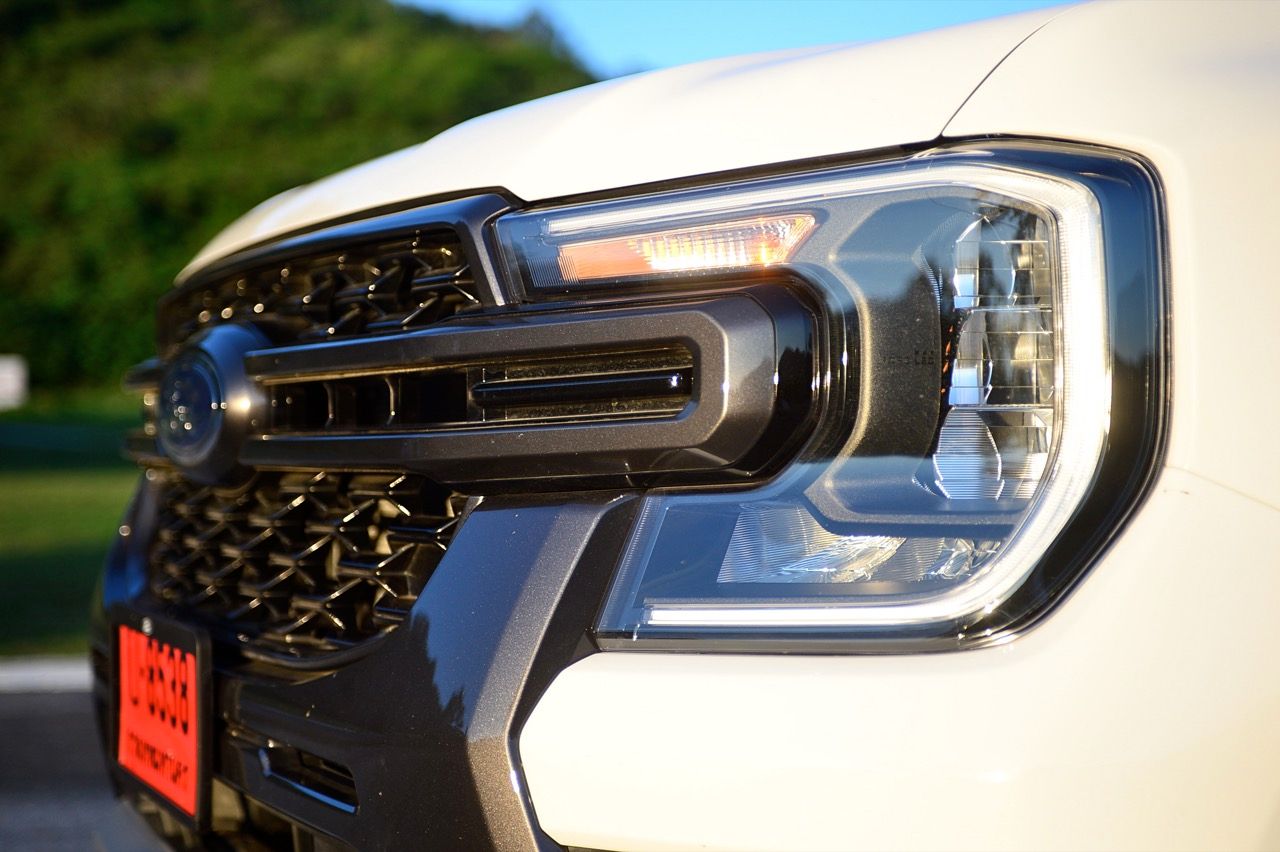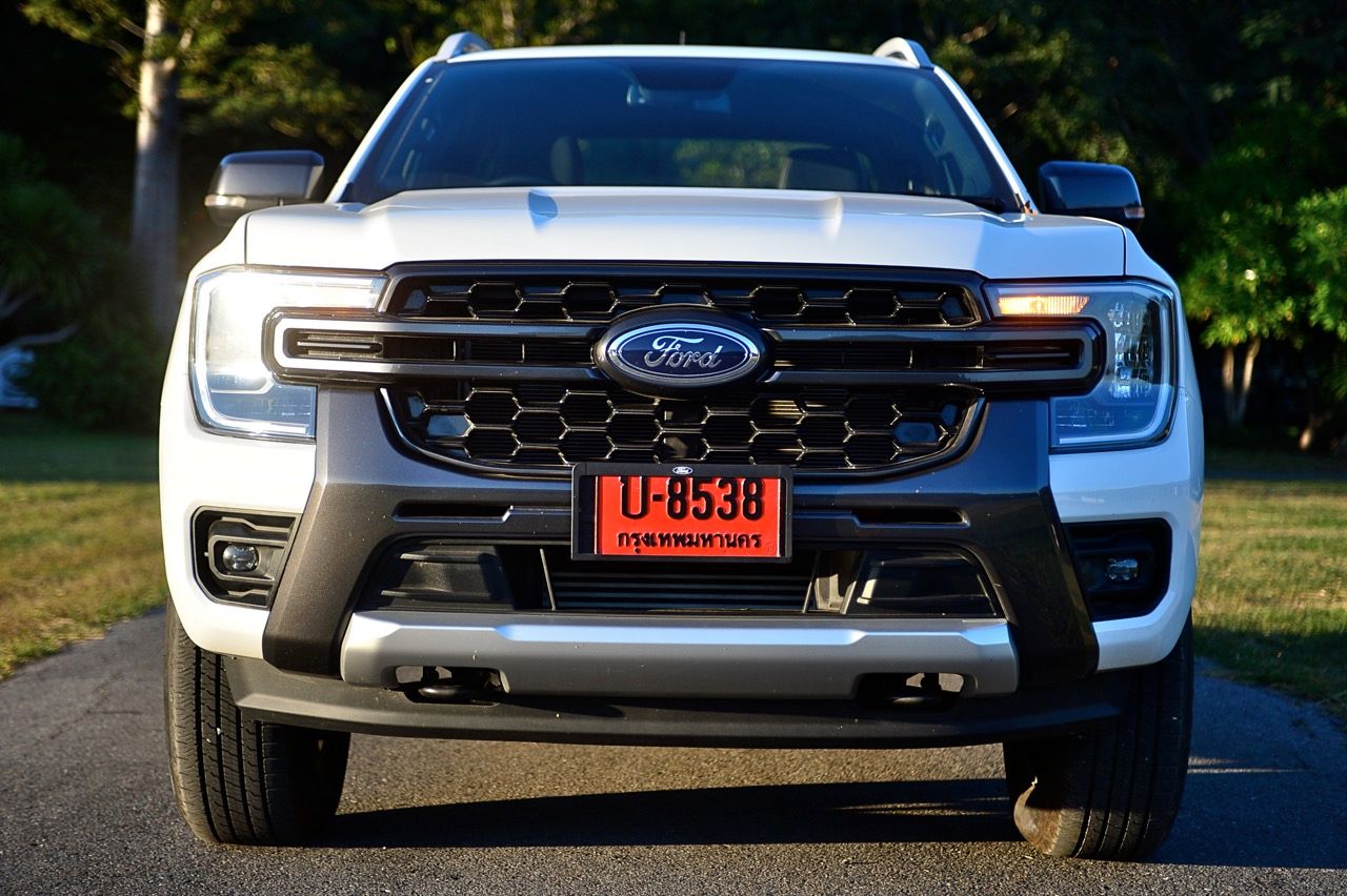Wildtrak (Extra Pack) Single Turbo 4x2 เน้นความเป็นกระบะอเมริกัน โดยมีการย่อส่วนใบหน้าที่ดุดันมาจาก Ford F150 กระบะมะกันคันโต เพื่อไม่ให้ Ranger ใหญ่มากจนเกินไปเมื่อถูกวางขายในอาเซียน ซึ่งจริงๆ แล้วมันก็ใหญ่กว่ารถกระบะทั่วไปอยู่พอสมควร เริ่มจากกระจังหน้าสีเทา-ดำทรงรังผึ้ง มีช่องรับอากาศเข้าไประบายความร้อนให้กับเครื่องยนต์ ช่องรับอากาศของระบบไอดีที่แยกออกมาอยู่ด้านบนฝั่งซ้ายของห้องเครื่องยนต์ ออกแบบให้สามารถลุยน้ำได้ลึก 80 เซนติเมตร ท่ออากาศของ New Ranger จึงถูกยกขึ้นสูงจนเกือบจะอยู่ในแนวเดียวกับฝากระโปรงหน้า กันชนหน้ารูปตัว X ที่ต้องใช้ความกล้าหาญและงานวัดขนาดในระดับมิลลิเมตร ในขั้นตอนของการออกแบบ ไฟตัดหมอก LED อยู่ในกรอบพลาสติกสีดำ พลาสติกตกแต่งใต้กันชนหน้าสีเงินที่ทำให้ด้านหน้าดูลงตัวมากยิ่งขึ้น รวมถึงไฟหน้ารูปตัว C ที่ทันสมัย มีไฟ LED พร้อมไฟหรี่กลางวัน LED Day Time Running Light ระบบเปิด-ปิดไฟหน้าอัตโนมัติ ฝากระโปรงหน้ายกสันนูนเพื่อเพิ่มมิติของแสงเงายามตกกระทบ ตราสัญลักษณ์ Ford อยู่ตรงกึ่งกลางกระจังหน้า กระจังหน้ามีช่องพลาสติกแนวนอนคาดกลาง