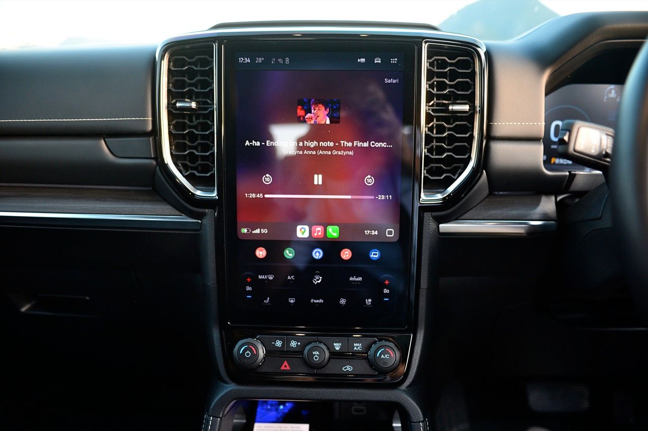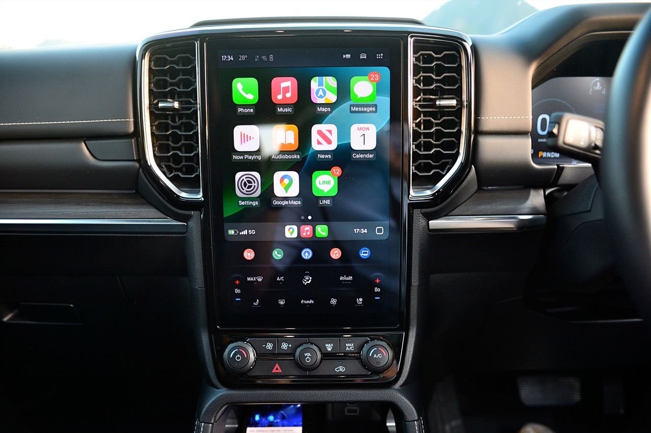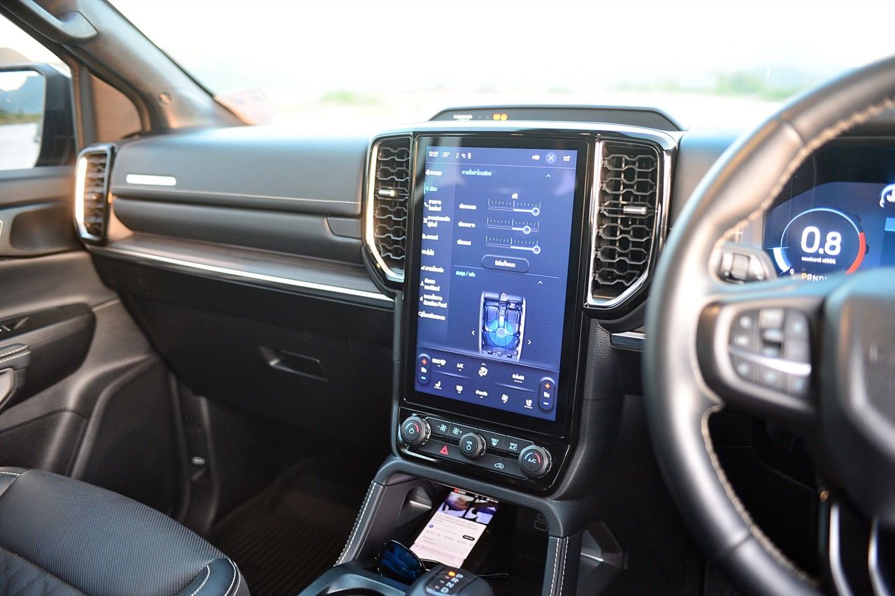 อุปกรณ์ภายในจัดเต็มตามราคาค่าตัวในกลุ่ม New Everest V6 กระจกหลังคาไฟฟ้า Panoramic Roof พร้อมม่านบังแดดไฟฟ้า แท่นชาร์จโทรศัพท์ไร้สาย หน้าจอภาพมาตรวัดบนหน้าปัดแบบสีขนาด 12.4 นิ้ว หน้าจอแสดงผลจอสีแบบสัมผัส Multi-Touch ขนาด 12 นิ้ว รองรับ Wireless Apple Carplay และ Android Auto SYNC® 4A ภาษาไทย พร้อมการเชื่อมต่อ Bluetooth ช่องต่อ USB 4 ตำแหน่ง ลำโพง B&O 12 ตำแหน่ง พร้อมซัฟวูฟเฟอร์ ระบบปรับอากาศดูอัลโซน กล้องมองภาพรอบคัน กล้องในโหมดออฟโรด ที่ทำออกมาให้สะดวกในการใช้งานก็คือ Wireless Apple Carplay หรือเชื่อมต่อผ่าน USB ที่มีมาให้ทั้ง Type A และ C