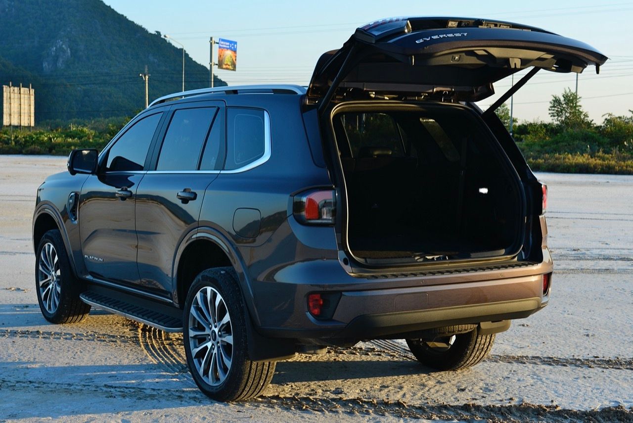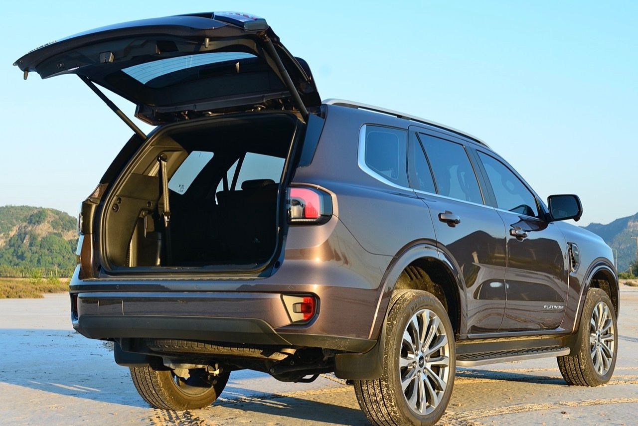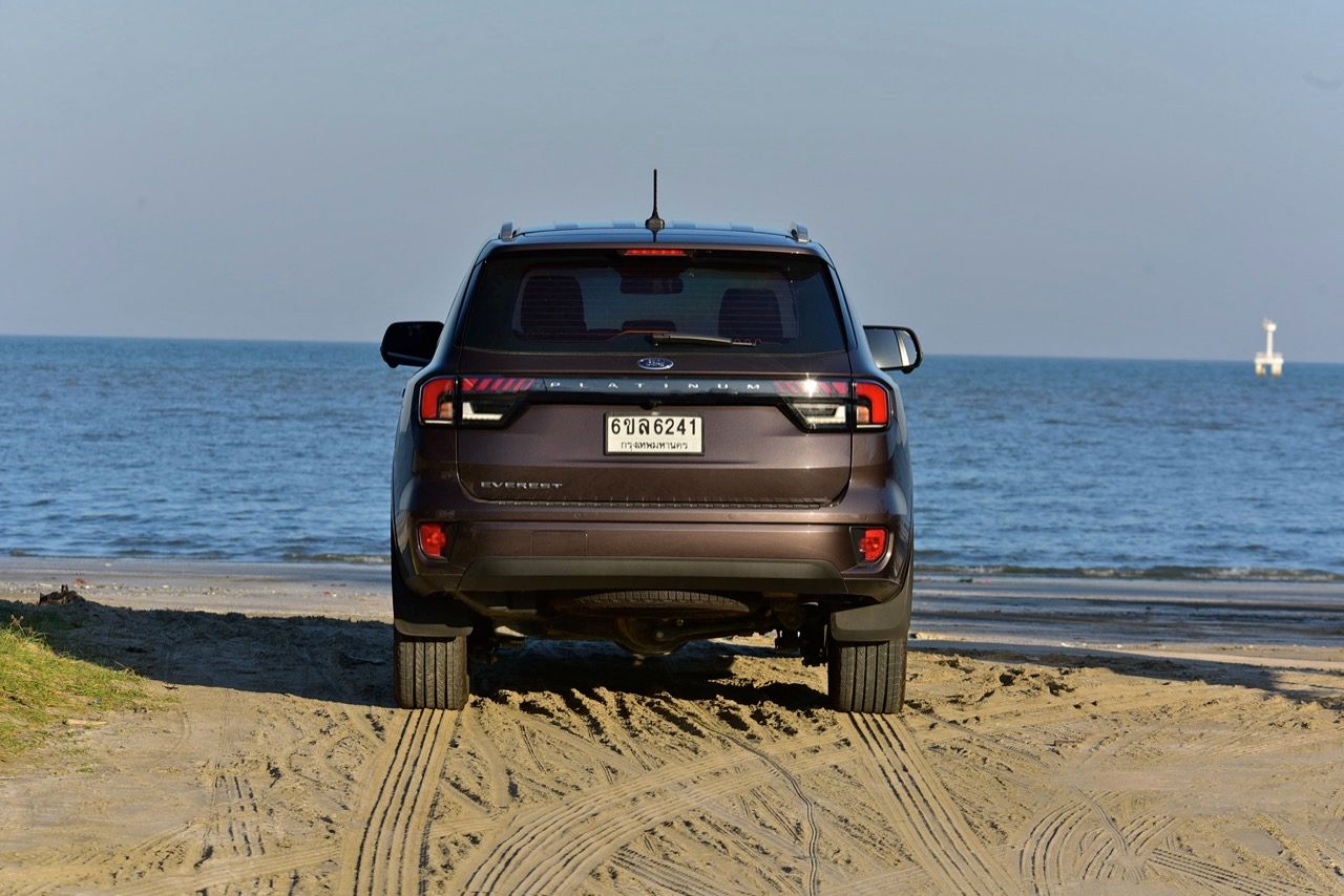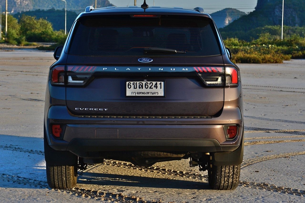 ฝาท้ายขนาดใหญ่ เปิดออกได้กว้างขวางพร้อมกลไกเปิด-ปิดฝาท้ายไฟฟ้า ไฟท้ายเชื่อมต่อกันทั้งซ้ายและขวาด้วยชิ้นงานพลาสติกสีดำกับตัวอักษร Platinum ไฟท้ายทรงยาวหลอด LED เข้ากับสัดส่วนบั้นท้ายจากการออกแบบ เชื่อมโยงมุมมองส่วนท้ายให้มีความลงตัว ไฟท้ายของ Everest Platinum V6 รุ่นใหม่ใช้หลอดไฟแบบผสม ซึ่งมีทั้งหลอดไฟท้ายแบบ LED และหลอดไฟแบบธรรมดาอยู่ภายใน ขอบด้านบนของกันชนหลัง มีพลาสติกกันกระแทกสีดำคอยป้องกันริ้วรอย เมื่อต้องยกสัมภาระเข้าออกจากห้องเก็บของส่วนท้าย กันชนหลังมีการดีไซน์แบบสองชิ้นเหมือนกันกับกันชนหน้า พร้อมพลาสติกกันกระแทกสีดำ และแผ่นพลาสติกสะท้อนแสงมัลติรีเฟกเตอร์สำหรับความปลอดภัยเมื่อจอดรถในที่มืด กล้องมองหลังติดมาให้พร้อมติดตั้งเซนเซอร์ถอยหลังแจ้งเตือนด้วยสัญญาณเสียงเมื่อถอยเข้าไปใกล้กับวัตถุกีดขวาง ด้านบนของฝาท้ายบริเวณกึ่งกลางกระจกบานฝาท้ายเป็นที่อยู่ของไฟเบรกดวงที่ 3 ซึ่งติดตั้งเอาไว้ในตำแหน่งที่สูง เพื่อทำให้รถคันหลังมองเห็นไฟเบรกอย่างชัดเจน