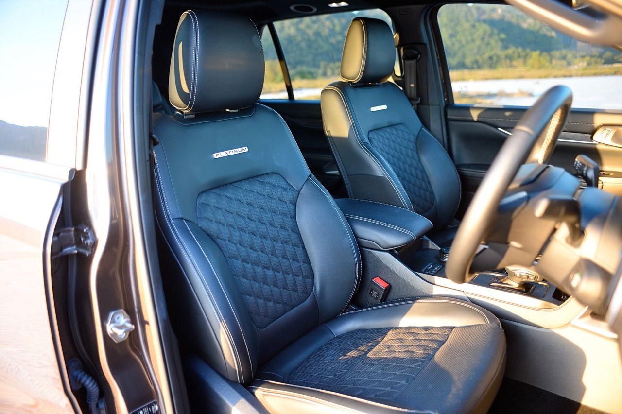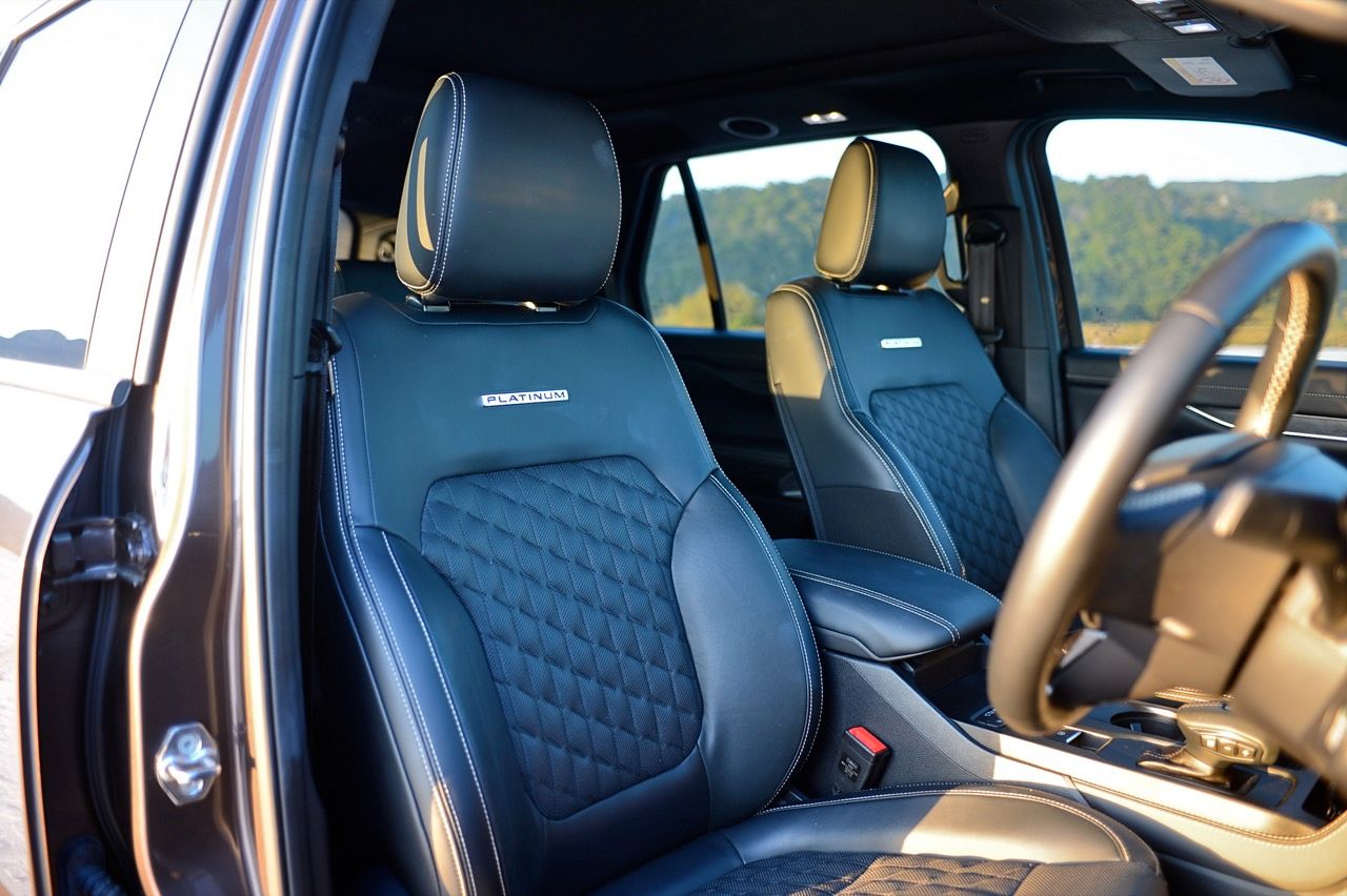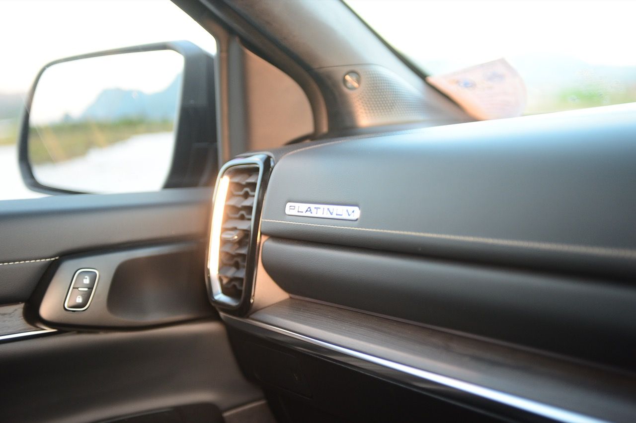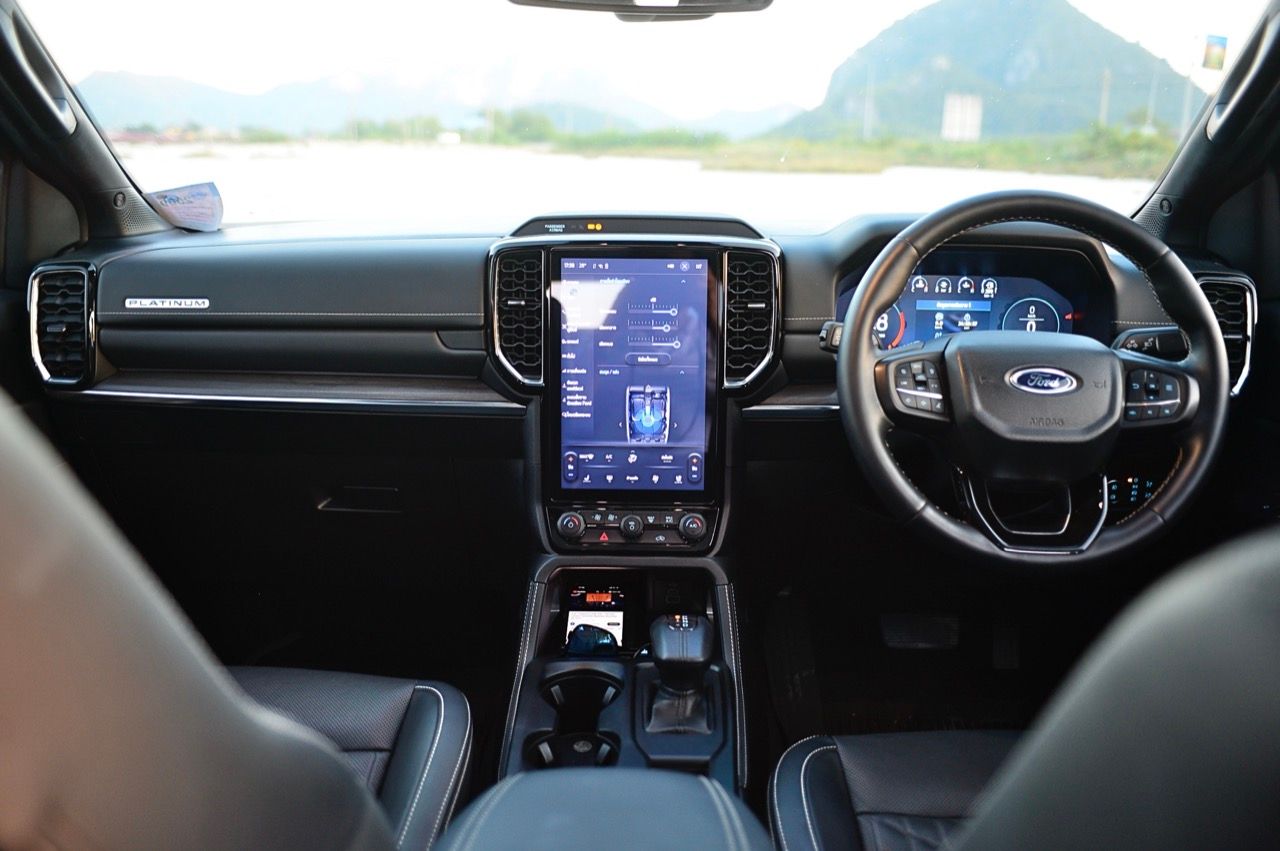 ห้องโดยสารของ Ford Everest Platinum V6 รุ่นเกือบจะท็อปสุดของ Ford มีการประดังความหรูหรา ใส่อุปกรณ์ตกแต่ง Platinum เพื่อความเรียบหรูเน้นการใช้งานจริง ลดสีสันไม่ให้ฉูดฉาดและไปเหมือนกับ Everest Wildtrak ด้วยการตัดเย็บที่ใช้ด้ายสีขาวตัดกับเบาะสังเคราะห์โทนสีดำ เบาะ พวงมาลัย แผงประตู เย็บเดินตะเข็บด้วยด้ายสีขาวตัดกับไวนิลสีเทาหรือหนังสังเคราะห์สีดำ ภายในแบบ 7 ที่นั่งมีมิติที่กว้างขวาง โดยเฉพาะโซนของเบาะคู่หน้าและเบาะแถวกลาง ส่วนเบาะแถวที่สามปรับพับด้วยไฟฟ้าให้ความสะดวกโดยที่ไม่ต้องออกแรง แต่พื้นที่เบาะแถวสามเหมาะกับเด็กมากกว่าจะให้คนตัวสูงลงไปนั่ง พลาสติกตกแต่งภายในมีผิวสัมผัสและรายละเอียดของชิ้นงานแตกต่างกันออกไป ตามแนวทางของงานตกแต่งห้องโดยสารยุคใหม่ของ Ford ห้องโดยสารเน้นสีดำเย็บตะเข็บด้วยด้ายสีขาวตามเอกลักษณ์ของ Everest รุ่น Platinum ที่เน้นความเคร่งขรึม โลโก้ซิกเนเจอร์ Platinum ที่พนักพิงหลังของเบาะคู่หน้า