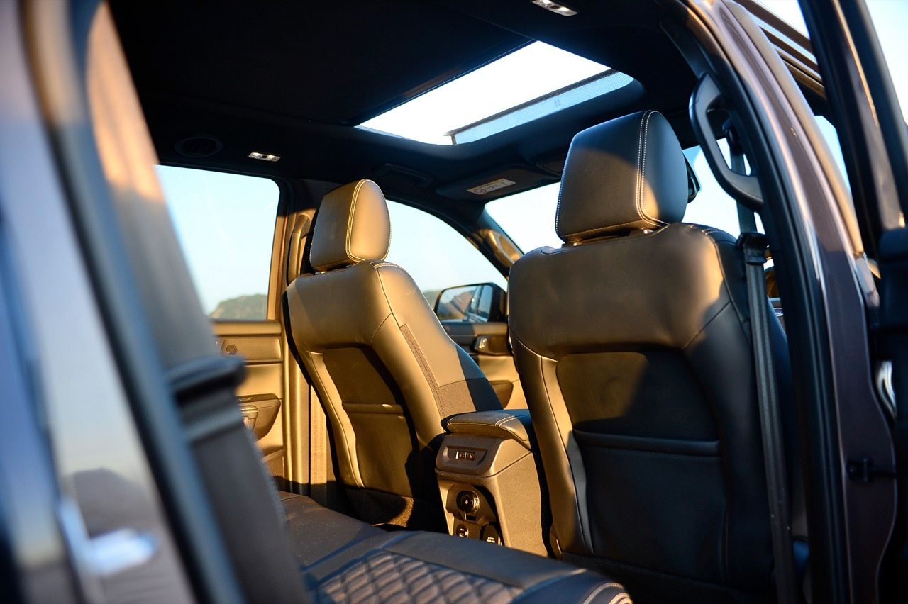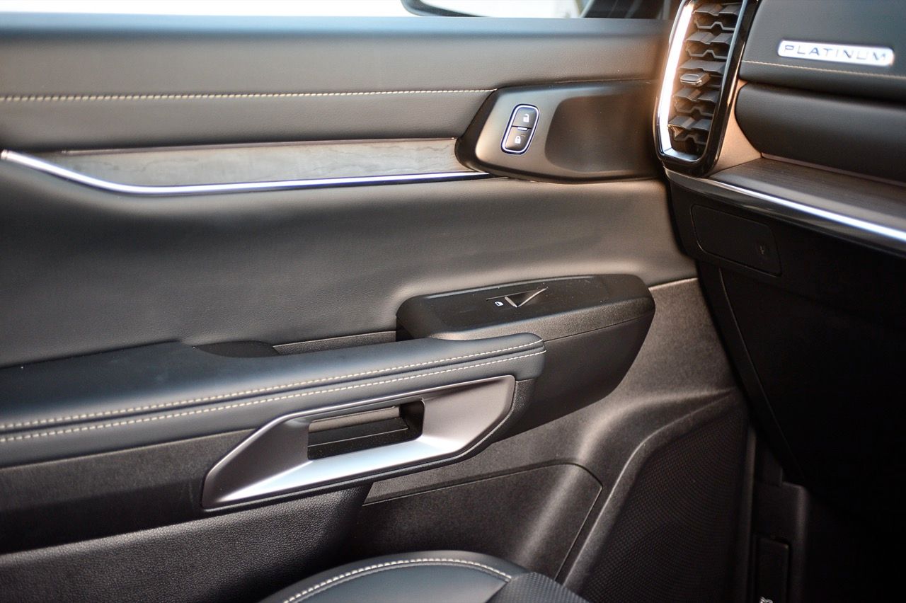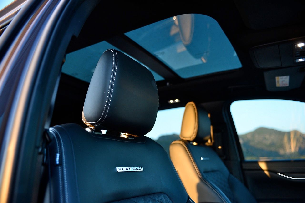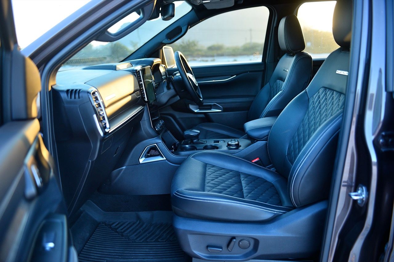ห้องโดยสารของ Ford Everest Platinum V6 รุ่นเกือบจะท็อปสุดของ Ford มีการประดังความหรูหรา ใส่อุปกรณ์ตกแต่ง Platinum เพื่อความเรียบหรูเน้นการใช้งานจริง ลดสีสันไม่ให้ฉูดฉาดและไปเหมือนกับ Everest Wildtrak ด้วยการตัดเย็บที่ใช้ด้ายสีขาวตัดกับเบาะสังเคราะห์โทนสีดำ เบาะ พวงมาลัย แผงประตู เย็บเดินตะเข็บด้วยด้ายสีขาวตัดกับไวนิลสีเทาหรือหนังสังเคราะห์สีดำ ภายในแบบ 7 ที่นั่งมีมิติที่กว้างขวาง โดยเฉพาะโซนของเบาะคู่หน้าและเบาะแถวกลาง ส่วนเบาะแถวที่สามปรับพับด้วยไฟฟ้าให้ความสะดวกโดยที่ไม่ต้องออกแรง แต่พื้นที่เบาะแถวสามเหมาะกับเด็กมากกว่าจะให้คนตัวสูงลงไปนั่ง พลาสติกตกแต่งภายในมีผิวสัมผัสและรายละเอียดของชิ้นงานแตกต่างกันออกไป ตามแนวทางของงานตกแต่งห้องโดยสารยุคใหม่ของ Ford ห้องโดยสารเน้นสีดำเย็บตะเข็บด้วยด้ายสีขาวตามเอกลักษณ์ของ Everest รุ่น Platinum ที่เน้นความเคร่งขรึม โลโก้ซิกเนเจอร์ Platinum ที่พนักพิงหลังของเบาะคู่หน้า