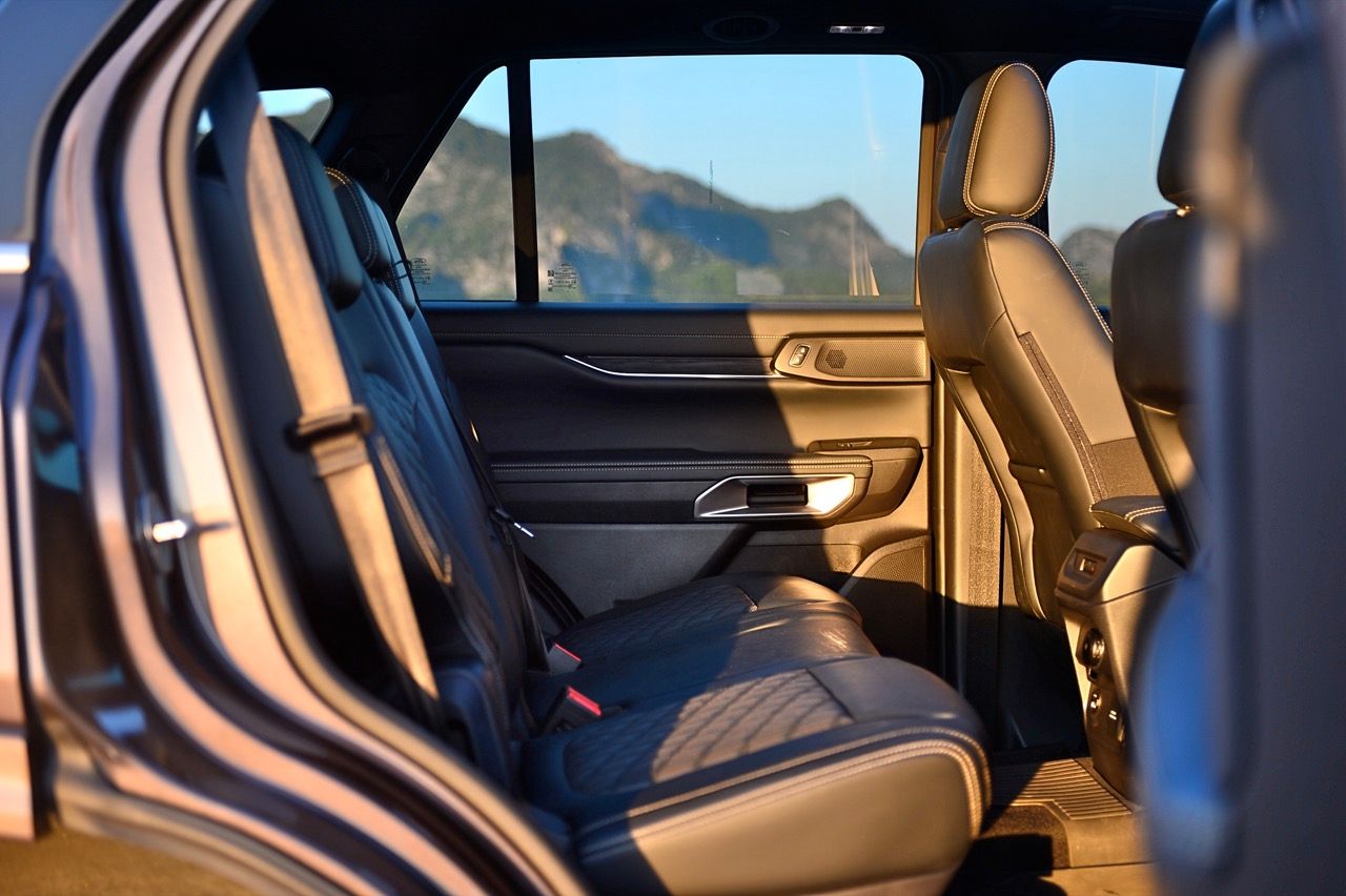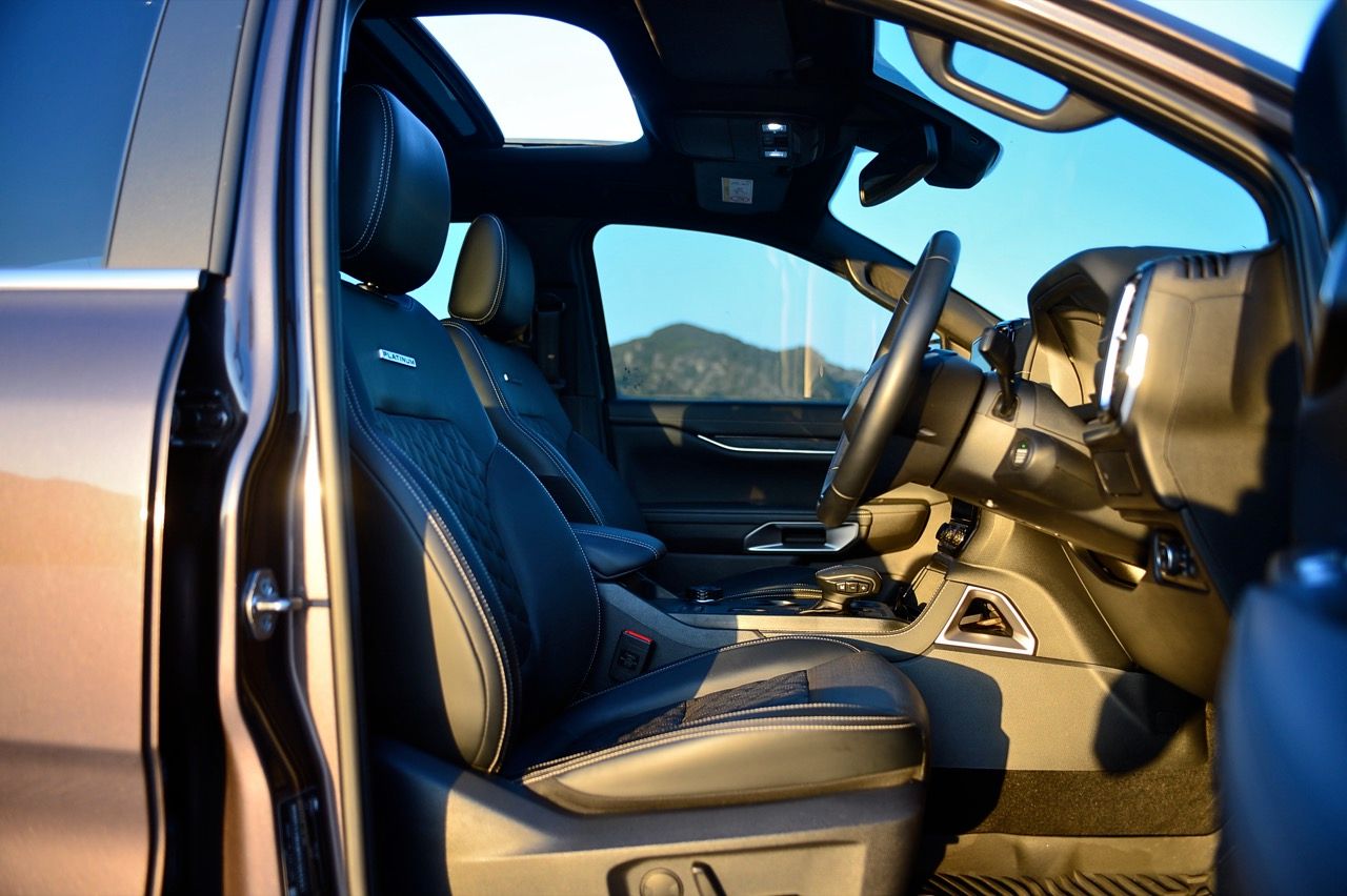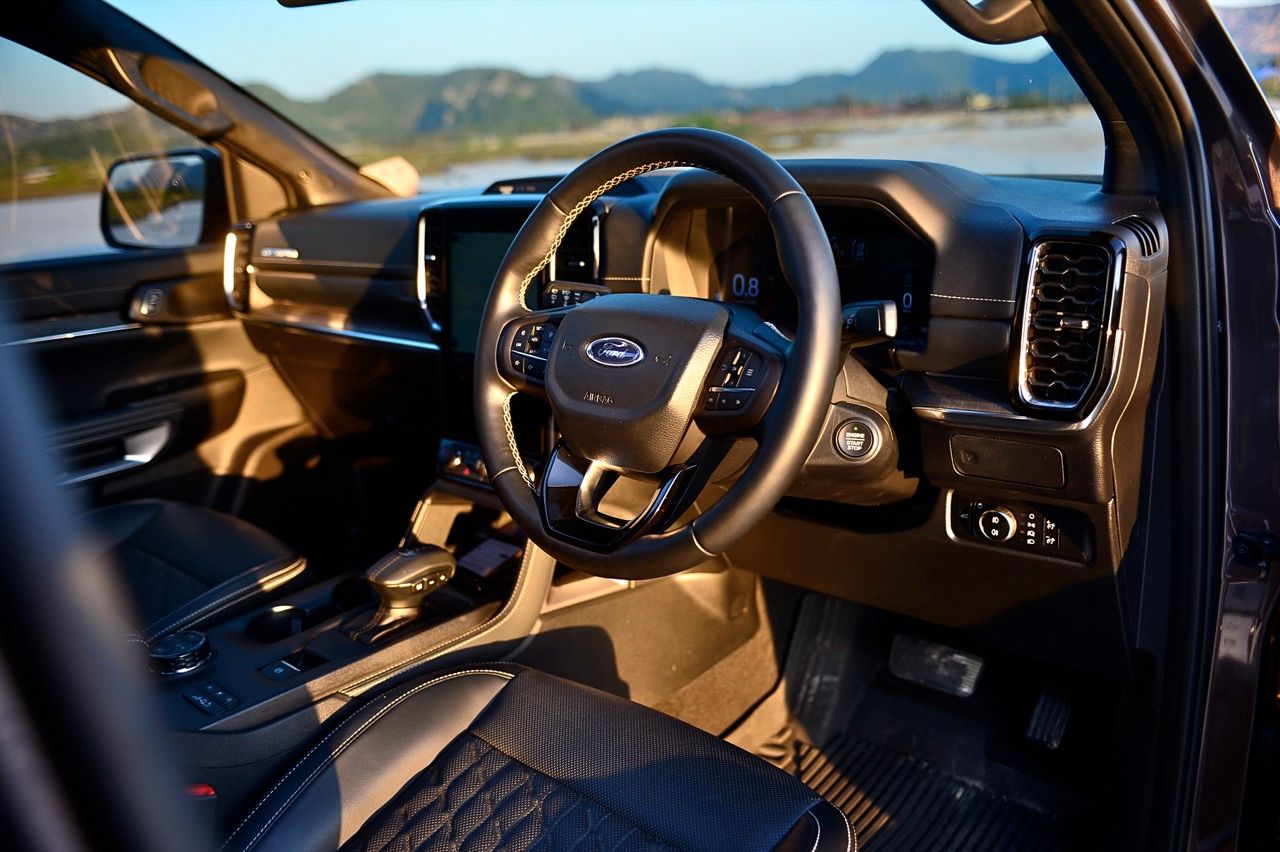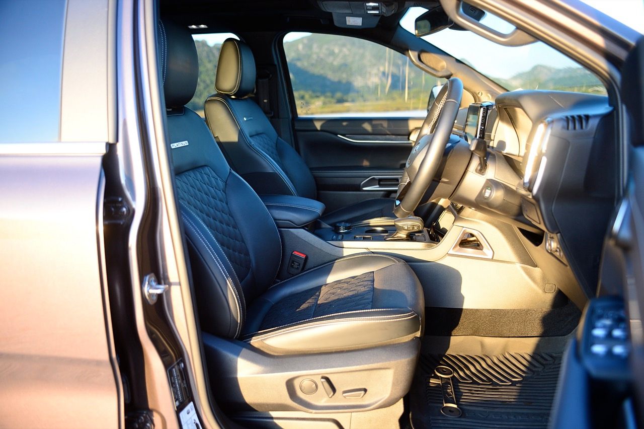 ห้องโดยสารของ Ford Everest Platinum V6 รุ่นเกือบจะท็อปสุดของ Ford มีการประดังความหรูหรา ใส่อุปกรณ์ตกแต่ง Platinum เพื่อความเรียบหรูเน้นการใช้งานจริง ลดสีสันไม่ให้ฉูดฉาดและไปเหมือนกับ Everest Wildtrak ด้วยการตัดเย็บที่ใช้ด้ายสีขาวตัดกับเบาะสังเคราะห์โทนสีดำ เบาะ พวงมาลัย แผงประตู เย็บเดินตะเข็บด้วยด้ายสีขาวตัดกับไวนิลสีเทาหรือหนังสังเคราะห์สีดำ ภายในแบบ 7 ที่นั่งมีมิติที่กว้างขวาง โดยเฉพาะโซนของเบาะคู่หน้าและเบาะแถวกลาง ส่วนเบาะแถวที่สามปรับพับด้วยไฟฟ้าให้ความสะดวกโดยที่ไม่ต้องออกแรง แต่พื้นที่เบาะแถวสามเหมาะกับเด็กมากกว่าจะให้คนตัวสูงลงไปนั่ง พลาสติกตกแต่งภายในมีผิวสัมผัสและรายละเอียดของชิ้นงานแตกต่างกันออกไป ตามแนวทางของงานตกแต่งห้องโดยสารยุคใหม่ของ Ford ห้องโดยสารเน้นสีดำเย็บตะเข็บด้วยด้ายสีขาวตามเอกลักษณ์ของ Everest รุ่น Platinum ที่เน้นความเคร่งขรึม โลโก้ซิกเนเจอร์ Platinum ที่พนักพิงหลังของเบาะคู่หน้า