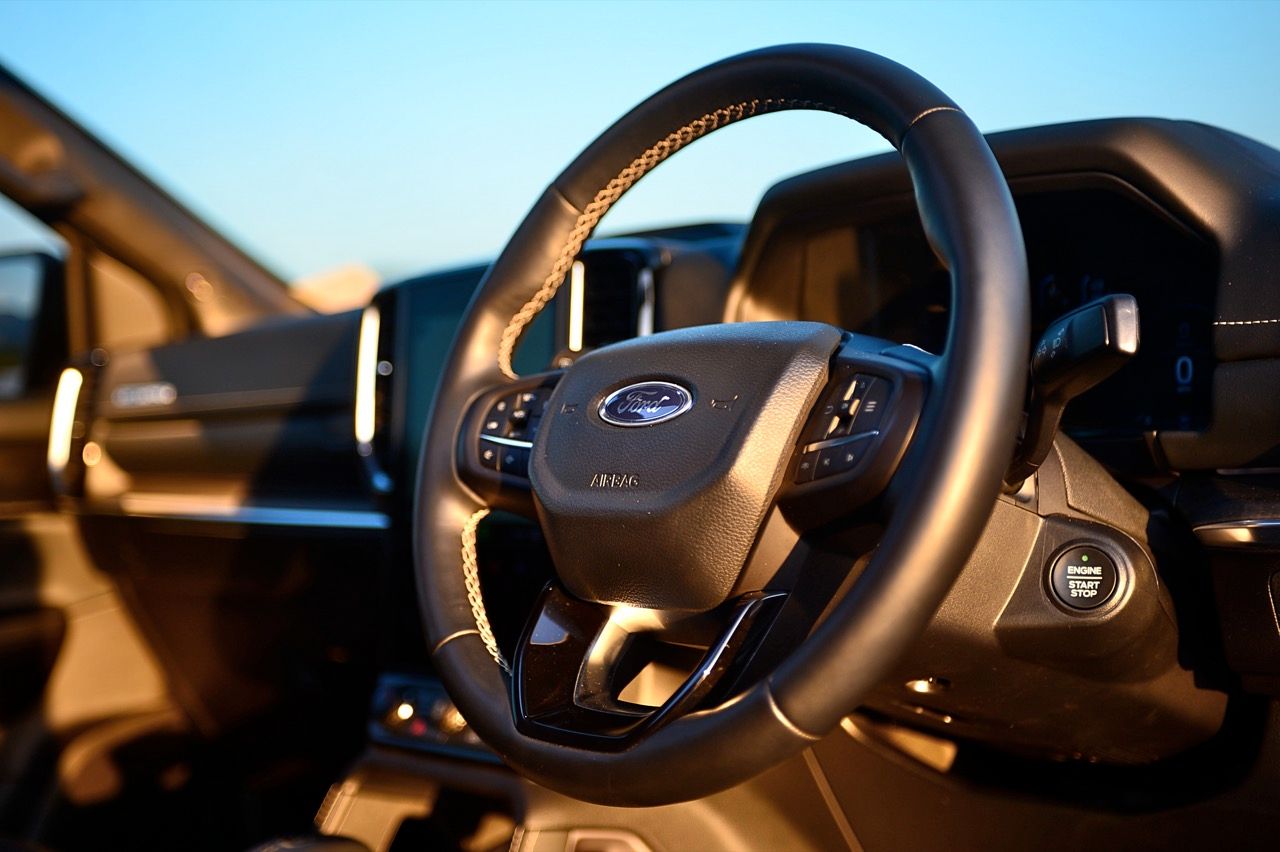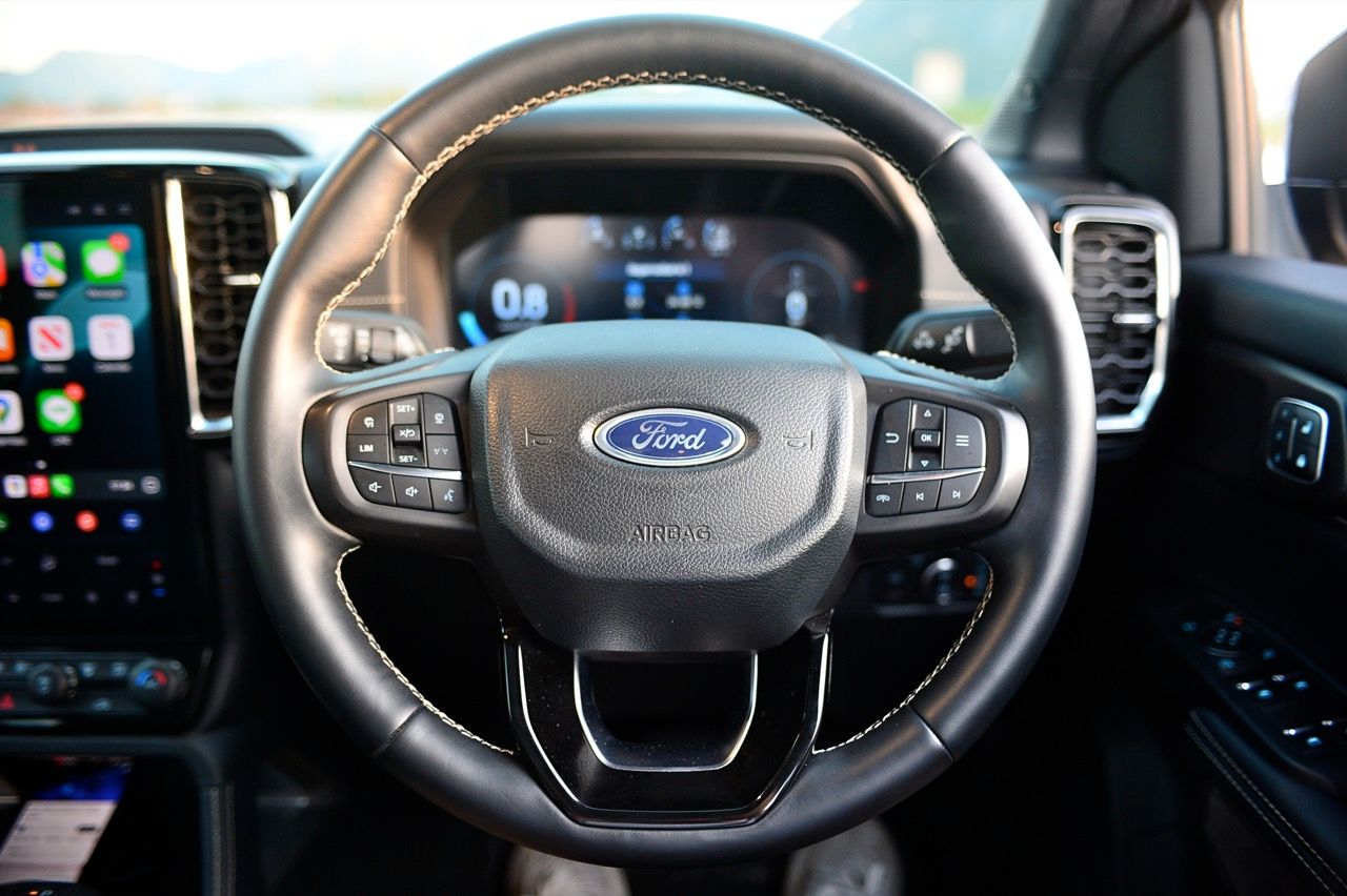 พวงมาลัยไฟฟ้า ให้ความรู้สึกที่เบาสบายมือ พอทะยานขึ้นทางด่วนแล้วใช้ความเร็วต่อเนื่อง พวงมาลัยไฟฟ้าให้ความมั่นใจได้ดีเหมือนกับ Everest รุ่นใหม่ทุกเวอร์ชัน แม่นยำและเปลี่ยนทิศทางได้อย่างธรรมชาติ Ford เป็นแบรนด์ที่ติดตั้งพวงมาลัยไฟฟ้าในรถ Ranger และ Everest ล่าสุด Mitsubishi Triton รุ่นท็อปสุดก็มีการเปลี่ยนชุดบังคับเลี้ยวให้เป็นแบบไฟฟ้าด้วยเหมือนกัน! การเซตค่าความหน่วงของพวงมาลัยใน Everest V6 เมื่อขับเร็วก็เป็นไปในแบบคล่องตัว น้ำหนักเบาและให้ระยะการหมุนที่แม่นยำ ขับในเมืองช่วยทำให้การเลี้ยวเปลี่ยนช่องทางหรือกลับลำยูเทิร์นมีความคล่องตัว ห้องโดยสารไม่มีเสียงแปลกปลอมเสียดสีกันของชิ้นงานที่ใช้ตกแต่ง เก็บเสียงได้ดี มีแค่เสียงยาง 21 นิ้วเท่านั้นที่ได้ยินเบาๆ เมื่อความเร็วเกิน 100 กิโลเมตรต่อชั่วโมง การเดินเบาของเครื่อง V6 3.0 ลิตร เทอร์โบ ทำได้ดีเท่ากับแบรนด์ยุโรปเลยทีเดียว แรงสั่นสะเทือนจากการทำงานของเครื่องยนต์ไม่มาก เป็นอีกจุดที่ทำออกมาได้ดี