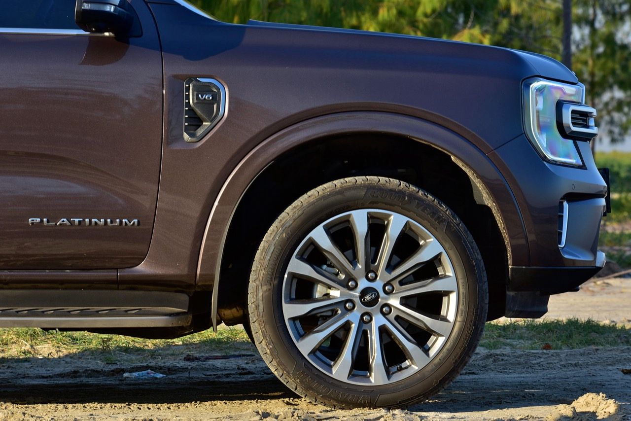 Ford Everest รุ่น Platinum V6 3.0 Turbo 10A/T 4WD มีการปรับแต่งระบบรองรับและจุดยึดยางแท่นเครื่องแท่นเกียร์ใหม่ คอม้าอัลลอยพร้อมข้อต่ออะลูมิเนียม ช่วงล่างด้านหน้าแบบปีกนกคู่ดับเบิลวิชโบน ส่วนช่วงล่างด้านหลังยังเป็นแบบคอยล์สปริง พร้อมกลไกวัตต์ลิงก์หรือเหล็กยึดค้ำที่ติดตั้งอยู่กับกระปุกของเฟืองท้าย