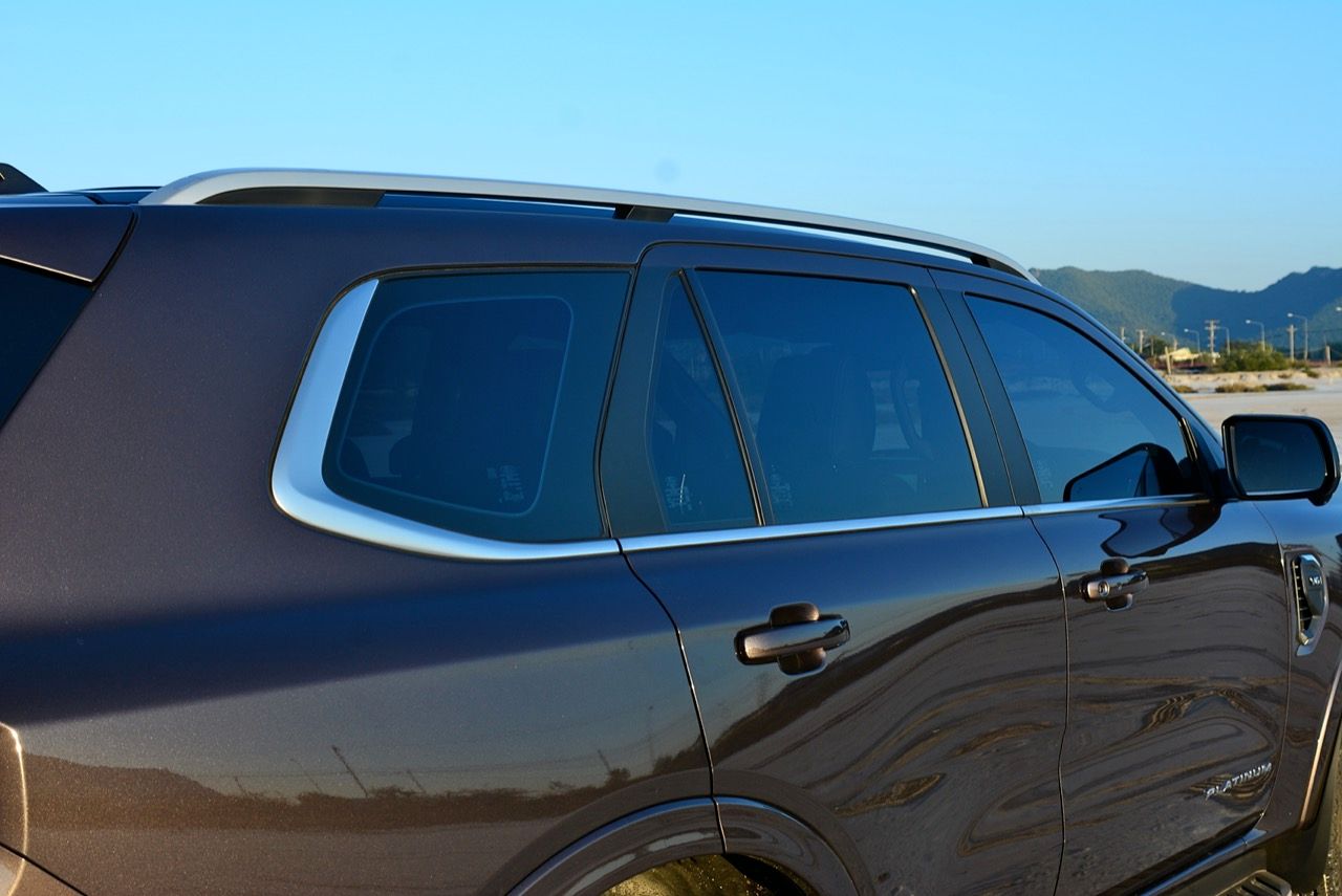 ด้านข้างตัวถังมีความยาว 4,914 มิลลิเมตร สูง 1,842 มิลลิเมตร การเข้าออกจากห้องโดยสารต้องยกตัวเองขึ้นไปโดยเหยียบไปที่กาบบันไดด้านข้าง ใช้มือจับที่ด้านในของเสาเอ เสาหน้ามีองศาของความเอนลาดที่ลงตัว เสาท้ายที่สอดรับกับผืนหลังคา แรคหลังคาที่ติดตั้งมาให้เพื่อความสะดวกในการขนสัมภาระ กระจกบังลมบานหน้าและบานข้างมีขนาดใหญ่ กรอบกระจกมองข้างติดตั้งเลนส์ไฟเลี้ยว เพื่อเพิ่มความปลอดภัย มุมด้านบนของแก้มข้างติดตั้งแถบพลาสติกสีดำ สัญลักษณ์ V6 ซุ้มล้อทั้งหน้าและหลังมีขอบซุ้มล้อสีเดียวกับตัวถัง ทำให้ต้องระวังหากจะเอาไปลุยหนักๆ บานประตูทั้งสี่ใหญ่โตทำให้การเข้าออกจากห้องโดยสารมีความสะดวกใช้ได้ กาบบันไดข้างติดตั้งที่เหยียบเพื่อก้าวเข้าไปในห้องโดยสารทำจากพลาสติก จุดที่ทำให้รถ PPV SUV เครื่อง V6 คันนี้ดูดีก็คือล้ออัลลอยลายใหม่ สีเงินสลับสีดำ เป็นล้อขอบ 21 นิ้วที่เข้ามาแทนล้อ 20 นิ้ว ผลิตขึ้นรูปจากอะลูมิเนียมอัลลอย ล้อขนาดเส้นผ่าศูนย์กลาง 21 นิ้ว ห่อรัดด้วยยางกึ่งออฟโรดของ Goodyear รุ่น Wrangler Territory HT ไซส์ 275/45R21 110Y