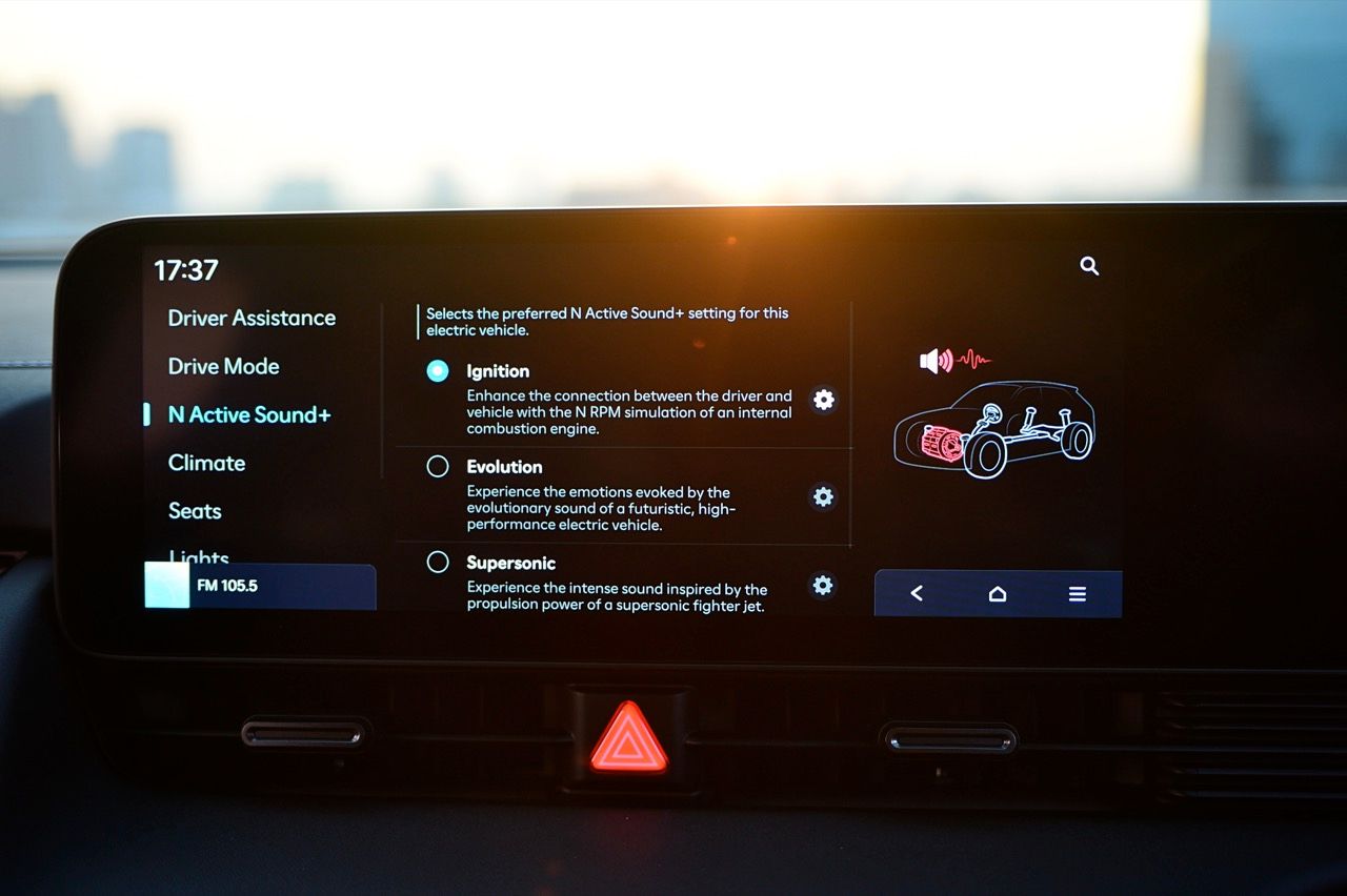 มีเสียงจำลอง ที่แตกต่างกันสามแบบให้เลือก เริ่มจาก Engine Sound อันนี้คือดีสุด ใกล้เคียงรถสันดาปมากสุด / ส่วน Evolution และ Supersonic จะออกแนวอวกาศ ส่วนตัวไม่ชอบเสียงสังเคราะห์แนวนี้อยู่แล้ว สำหรับเสียงเครื่องยนต์สังเคราะห์ในโหมด Engine Sound นั้นดีที่สุด สมจริงและสร้างความเร้าใจได้ดี ส่วน Evolution เป็นเสียงหอนหวีดหวิวของมอเตอร์ไฟฟ้า ผมลองเปลี่ยน Ioniq 5 N เป็นโหมด N และเลือกเสียงการจุดระเบิด Engine Sound จากนั้นเมื่อกระแทกคันเร่ง คุณจะได้ยินเสียงระเบิดปังๆ จากท่อระบายท้ายของรถแข่ง เมื่อจอดนิ่งๆในโหมด Engine Sound วิศวกรของ Hyundai ปรับเสียงสังเคราะห์ให้เหมือนการเดินเบาของรถแข่ง ด้วยรอบเครื่องที่ไม่นิ่ง! ทุกครั้งที่ยกคันเร่งจะได้ยินเสียงพรึบดังสนั่นออกมาจากลำโพงในห้องโดยสาร ที่ติดตั้งอยู่ทางด้านหลัง เสียงในโหมด Supersonic เหมือนเสียงเครื่องยนต์ไอพ่นที่ไม่เกี่ยวข้องกับรถยนต์ แต่มีเสียงโซนิกบูมดังเข้ามาในห้องโดยสารทุกครั้งที่เปลี่ยนเกียร์ นั่นก็แปลกประหลาดเกินไป และโหมดเสียง Supersonic Sound ที่ได้ยินก็ได้รับแรงบันดาลใจโดยตรงจากหนัง Top Gun Maverick
