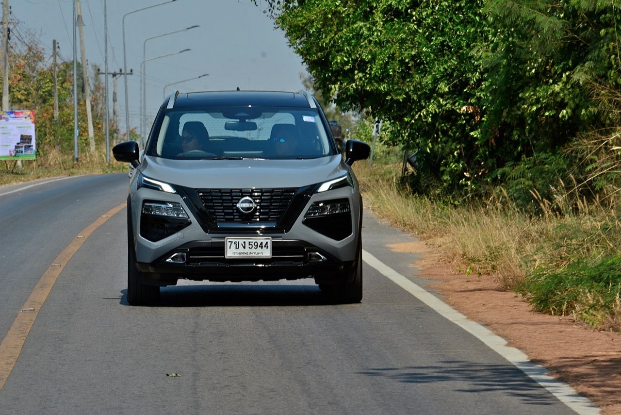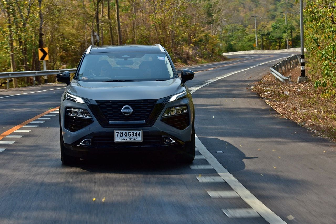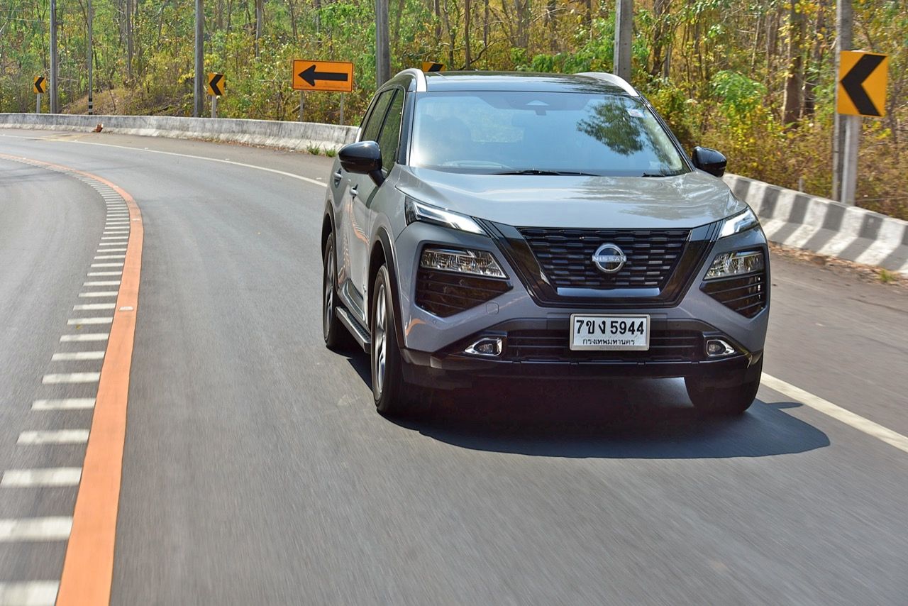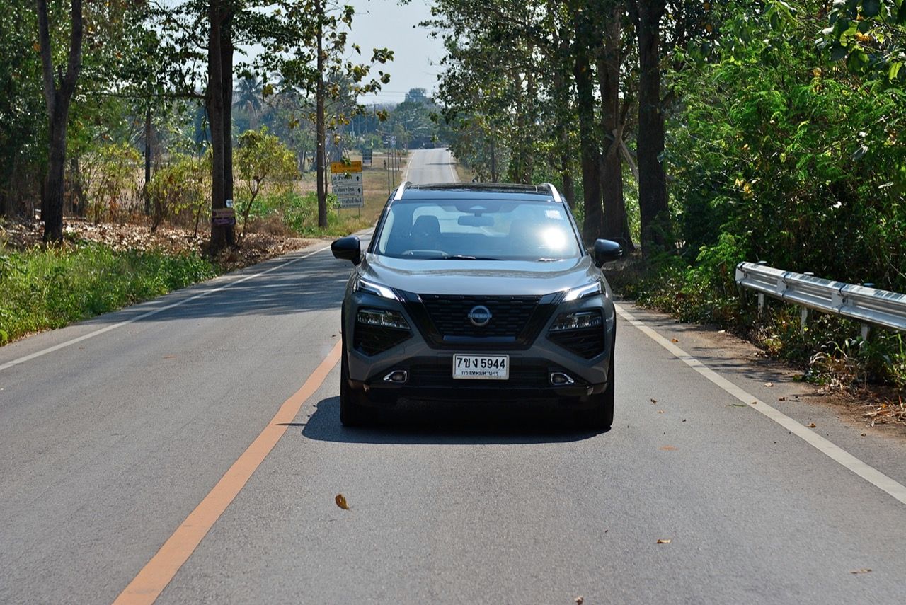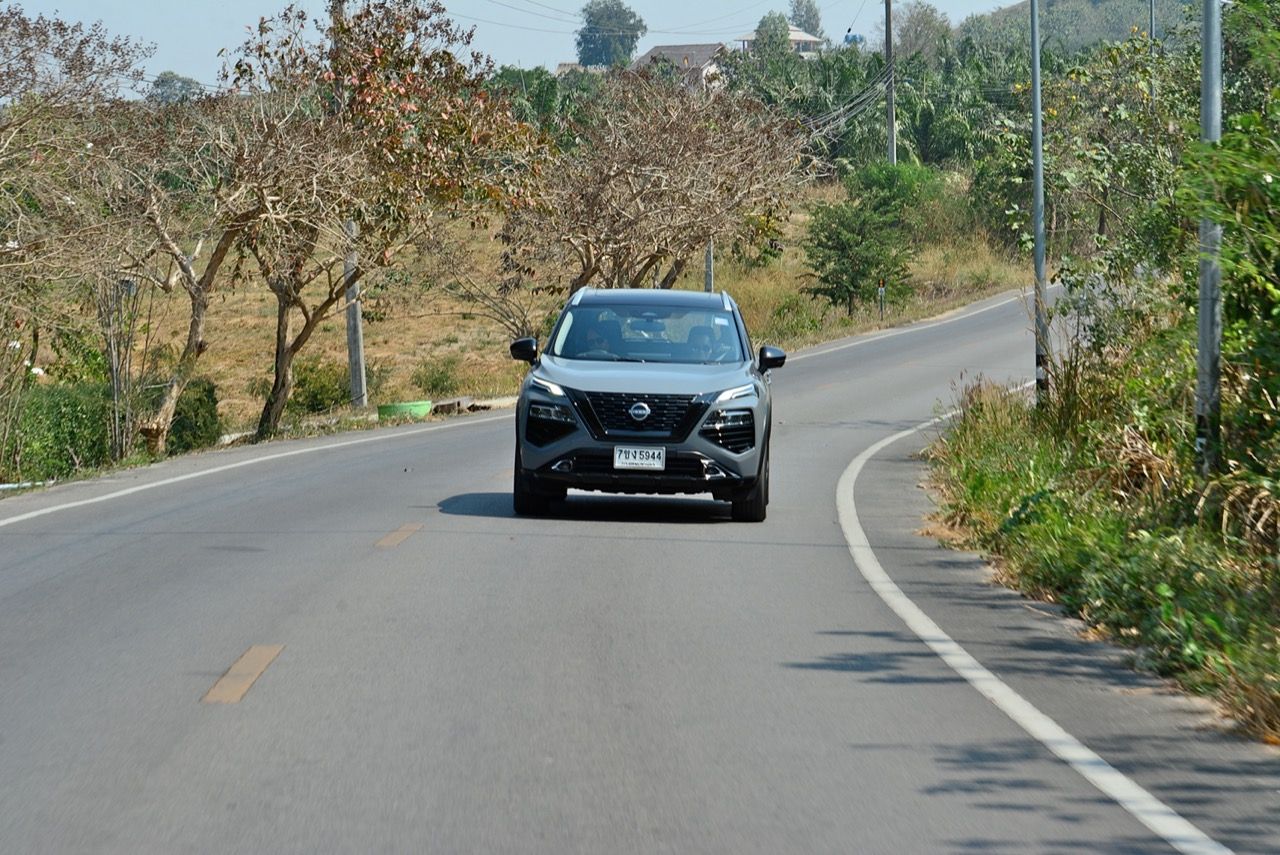 ระบบ e-4orce ขับทางไกลบนเส้นทางภูเขาแถบตะวันตกของราชบุรี มันเงียบและนุ่มนวลในย่านความเร็วต่ำ วิ่งด้วยมอเตอร์เพียวๆ ได้สองหรือสามกิโลเมตร หรือมากกว่านั้นนิดหน่อย ในย่านความเร็วต่ำ มอเตอร์ไฟฟ้าก็ไม่ได้ต้องการพลังไฟเพื่อป้อนให้กับมอเตอร์ขับเคลื่อน เครื่องยนต์สันดาปภายในจึงไม่จำเป็นต้องเร่งรอบสูงต่อเนื่อง X-Trail ใหม่ ยังติดตั้งระบบ ANC (ระบบตัดเสียงรบกวนแบบแอคทีฟ) ทำให้เสียงเครื่องยนต์สันดาปภายในเงียบกว่าปกติ และแทบจะไม่ได้ยินเสียงการทำงานของเครื่องยนต์เมื่อไม่ได้เร่งรอบ แต่.....การออกตัวจากจุดหยุดนิ่ง ไม่ได้อยู่ในระดับเดียวกับรถยนต์ไฟฟ้ามอเตอร์คู่ ทั้งแรงดึงหนักๆ และการตอบสนองที่ว่องไวของรถยนต์ไฟฟ้ามอเตอร์คู่ เนื่องจากเครื่องยนต์สันดาปภายใน ต้องใช้เวลาในการเร่งรอบจนถึงระดับที่สร้างพลังงานสูงสุดได้ ระบบ e-Power ตอบสนองได้เร็วขึ้นเมื่อขับด้วยความเร็วปานกลางถึงสูง เหยียบคันเร่งจนสุด ทำให้ระดับเสียงจากห้องเครื่องยนต์ดังขึ้นกว่าเดิมไม่มากนัก เทคโนโลยี e-4orce ดูเหมือนจะมีประสิทธิภาพในการควบคุมเรือนร่างขณะขับเคลื่อน เพราะ X-Trail ไม่กดหัวรถลงเมื่อเบรกอย่างรุนแรง และไม่ย้วยเมื่อเร่งความเร็วอย่างต่อเนื่องในโค้งสลับซ้าย-ขวา