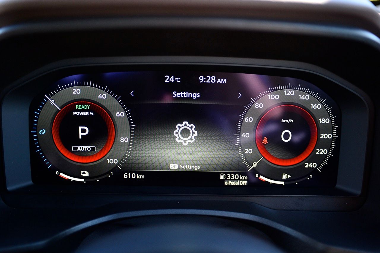 Regenerative Braking สามารถเลือกระดับการตอบสนองของระบบเบรกแบบสะสมพลังงาน ในโหมด D จะเบา แต่เพิ่มการ Regenerative ได้โดยการขยับคันเกียร์สั้นกุดไปด้านหลังเพื่อเข้าสู่โหมด B X-Trail ยังมีปุ่มสำหรับเลือกโหมด e-Pedal คล้ายกับ Nissan Leaf แต่มีการสร้างพลังงานกลับคืน Regenerative แรงกว่า ทำให้แทบจะไม่ต้องใช้เบรกแต่ผู้โดยสารอาจไม่สบายตัวหากคนขับยกคันเร่งเร็ว แรงหน่วงกลับก็จะทำให้รู้สึกว่าถูกโน้มไปข้างหน้านิดๆ แต่ถ้าปรับการทำงานของระบบเบรกสะสมพลังงานให้อยู่ในระดับกลาง การตอบสนองจะเหมาะสมกับการใช้งานจริงมากกว่า สำหรับโหมด Eco บนแป้นหมุน ปิดการสร้างพลังงานกลับคืน เหมาะกับการขับไปเรื่อยๆ ช่วยเพิ่มประสิทธิภาพการใช้พลังงานของรถในด้านความประหยัด