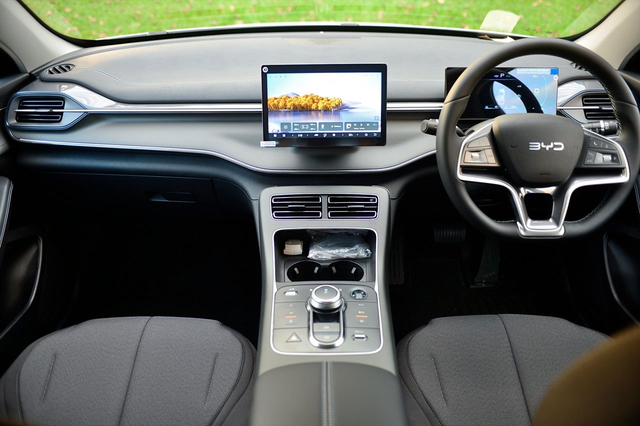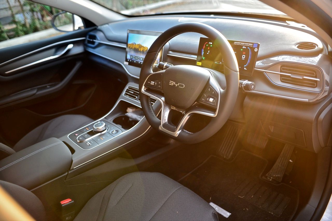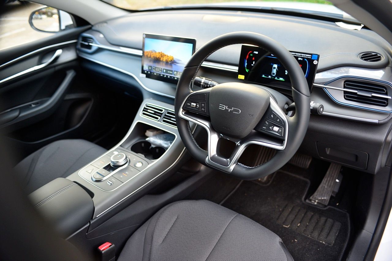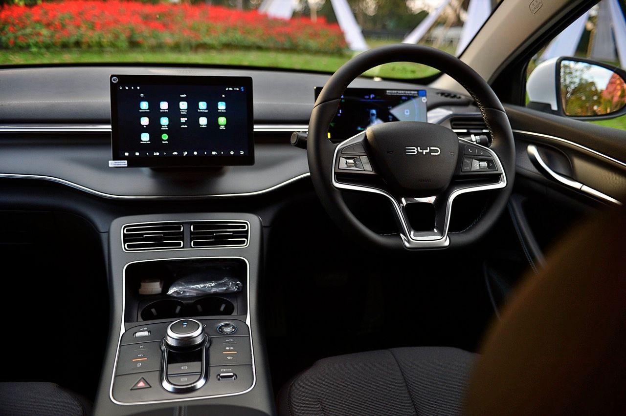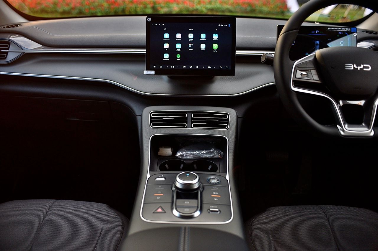 เบาะปรับมือของฝั่งคนขับปรับ 6 ทิศทาง ส่วนเบาะคนนั่งหน้าปรับมือเช่นเดียวกันแต่เป็นแบบสี่ทิศทางยกสูงไม่ได้ แดชบอร์ด คอนโซล ดูแล้ว BYD ใช้วัสดุที่เหนือกว่ารถคู่แข่งในบางจุด จอภาพ 10 นิ้วระบบสัมผัส เชื่อมต่อมือถือเร็ว เชื่อมแล้ว ตลอดเส้นทางการทดสอบ 2 วัน จากเชียงราย มายังกรุงเทพมหานคร ไม่มีปัญหาหลุดต้องเชื่อมต่อใหม่ หรือหน่วงจนชักช้าน่ารำคาญ เมื่อขึ้นรถ ระบบอินโฟรเทนเมนท์หลังการสตาร์ทจะใช้เวลาในการเชื่อมกับโทรศัพท์มือถือที่ต่อเอาไว้แล้วประมาณ 30 วินาที หรือนานกว่านั้นเล็กน้อย จอภาพระบบสัมผัส มีระบบควบคุมอุณหภูมิในห้องโดยสารอยู่ในนั้น รวมถึงการตั้งค่าต่างๆสำหรับการใช้งาน ทั้งหมด ออกแบบฟังก์ชันและเมนูให้ง่ายต่อการหา เข้าและออกได้อย่างรวดเร็วแทบจะไม่มีอาการหน่วงของจอภาพ