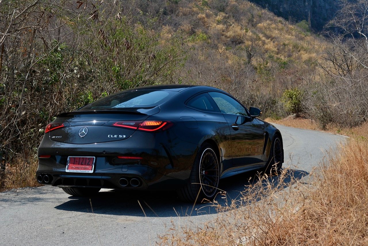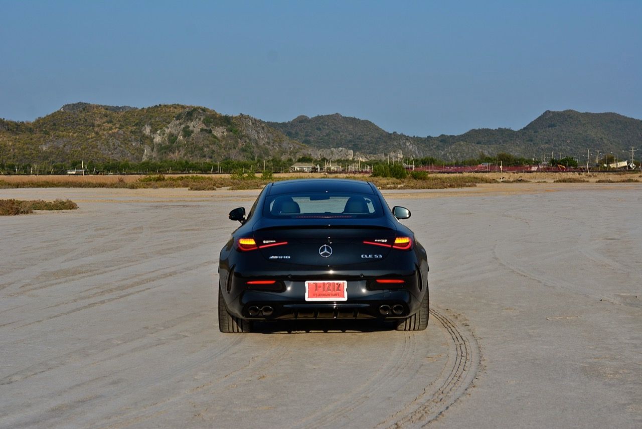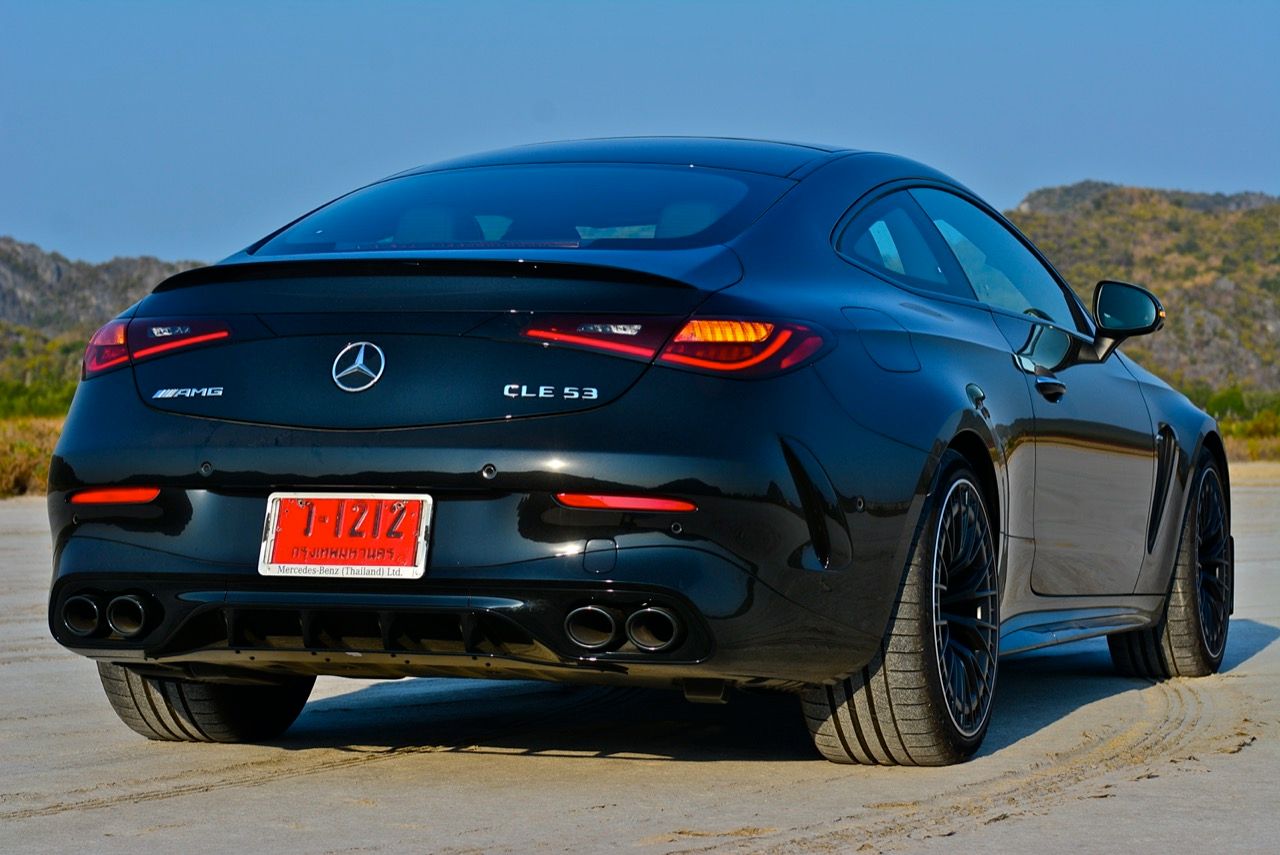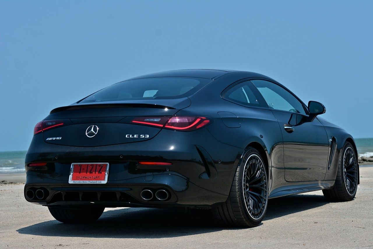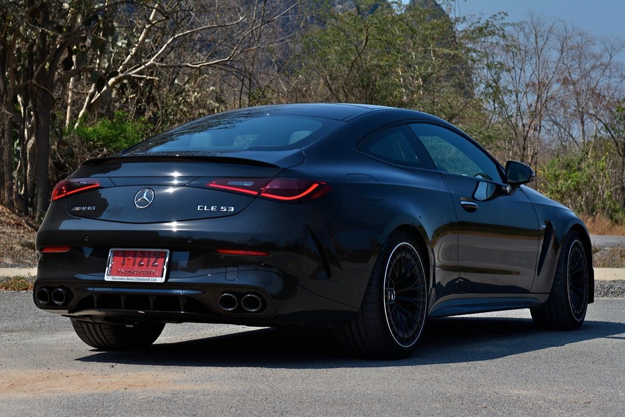 การเอาตรา AMG มาติด บ่งบอกถึงพละกำลัง Mercedes-AMG CLE 53 ตามทฤษฎีแล้วควรจะเป็นรถที่อยู่ตรงกลางระหว่างรุ่น 63 และ 43 ต้องให้ความรู้สึกสปอร์ต แต่ไม่ดุดันเท่า C 63 เป็นรถหรูสำหรับใช้งานทั่วไปที่เน้นความหล่อและพลังการทำความเร็ว แต่ตัวมันหนักกว่า CLE 300 ทำให้การขับในเมือง เครื่องสี่สูบ 2.0 ลิตร ของ CLE 300 ดูจะคล่องแคล่วมากกว่าเครื่องหกสูบ 3.0 ลิตร ของ AMG CLE 53 ซึ่งมาพร้อมกับของหนักๆอย่าง Mild Hybrid 48V เมื่อมองอย่างตั้งใจ แค่รูปลักษณ์ภายนอกก็บอกสายตาและสมองของคุณแล้วว่า นี่คือ CLE 53 ใหม่ที่เข้ามาแทน E53 กับ CLS53 มันนำเอาพื้นฐานของ CLE Coupe รถสองประตูสุดหรูที่ Mercedes ทำออกมาได้ดี มาเพิ่มความดุดัน ขยับฐานล้อให้กว้างขึ้น (ด้านหน้าเพิ่มขึ้น 58 มม. ด้านหลัง 75 มม.) ยางหลังขนาด 295 ในล้อ 21 ทำให้ซุ้มล้อดูใหญ่ราวกับรถแข่ง ท่าทางโดยรวมของ CLE 53 แทบจะไม่ต่างจาก C63 AMG Coupe รุ่นเก่า นี่คือรถที่ดูเร้าใจ โดยเฉพาะตัวถังสีดำ