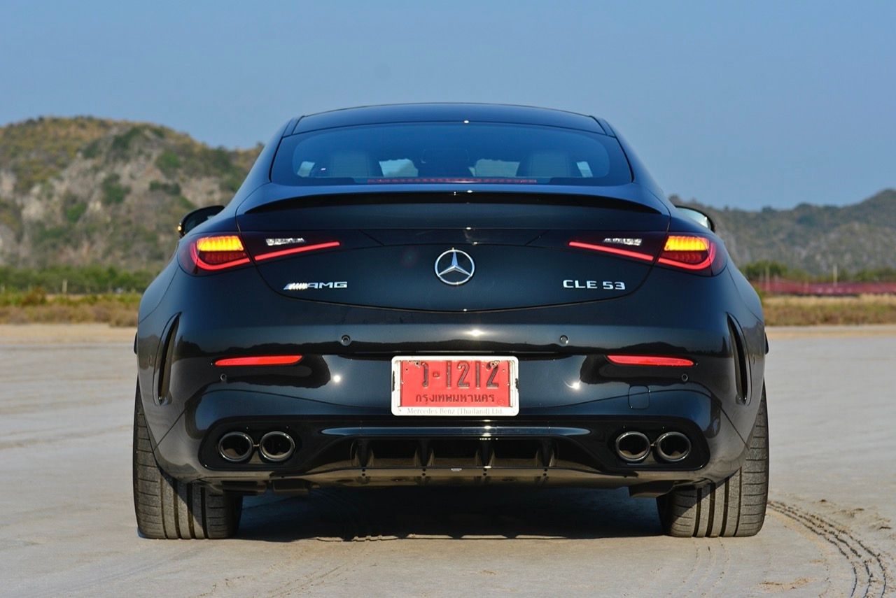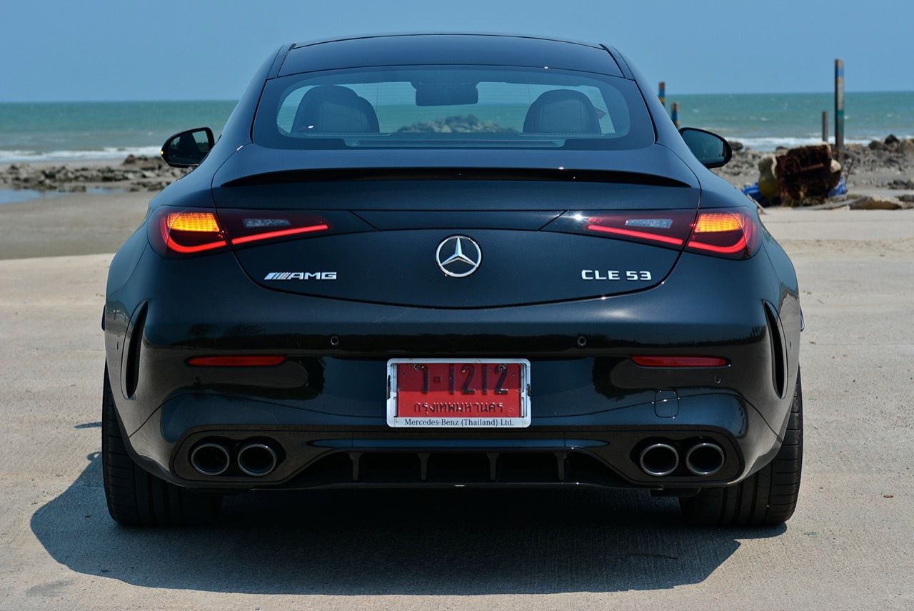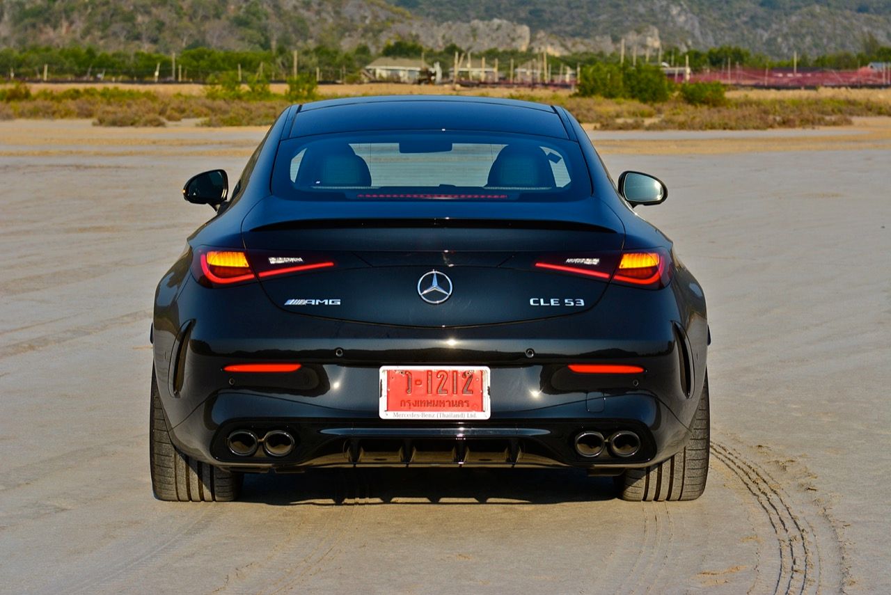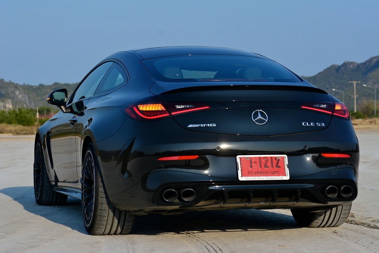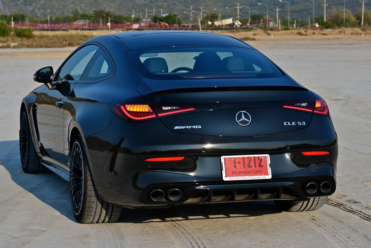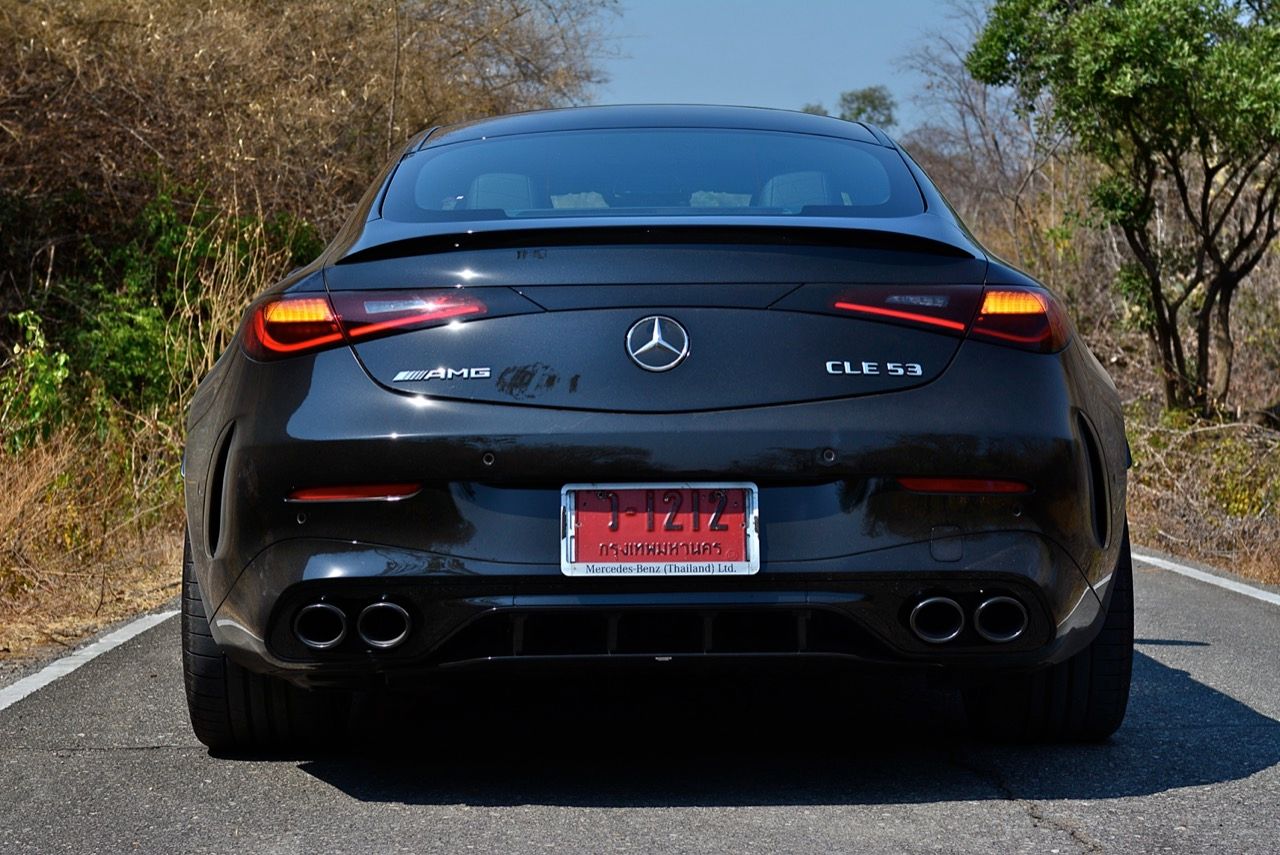 การเอาตรา AMG มาติด บ่งบอกถึงพละกำลัง Mercedes-AMG CLE 53 ตามทฤษฎีแล้วควรจะเป็นรถที่อยู่ตรงกลางระหว่างรุ่น 63 และ 43 ต้องให้ความรู้สึกสปอร์ต แต่ไม่ดุดันเท่า C 63 เป็นรถหรูสำหรับใช้งานทั่วไปที่เน้นความหล่อและพลังการทำความเร็ว แต่ตัวมันหนักกว่า CLE 300 ทำให้การขับในเมือง เครื่องสี่สูบ 2.0 ลิตร ของ CLE 300 ดูจะคล่องแคล่วมากกว่าเครื่องหกสูบ 3.0 ลิตร ของ AMG CLE 53 ซึ่งมาพร้อมกับของหนักๆอย่าง Mild Hybrid 48V เมื่อมองอย่างตั้งใจ แค่รูปลักษณ์ภายนอกก็บอกสายตาและสมองของคุณแล้วว่า นี่คือ CLE 53 ใหม่ที่เข้ามาแทน E53 กับ CLS53 มันนำเอาพื้นฐานของ CLE Coupe รถสองประตูสุดหรูที่ Mercedes ทำออกมาได้ดี มาเพิ่มความดุดัน ขยับฐานล้อให้กว้างขึ้น (ด้านหน้าเพิ่มขึ้น 58 มม. ด้านหลัง 75 มม.) ยางหลังขนาด 295 ในล้อ 21 ทำให้ซุ้มล้อดูใหญ่ราวกับรถแข่ง ท่าทางโดยรวมของ CLE 53 แทบจะไม่ต่างจาก C63 AMG Coupe รุ่นเก่า นี่คือรถที่ดูเร้าใจ โดยเฉพาะตัวถังสีดำ