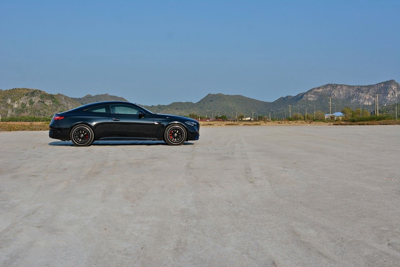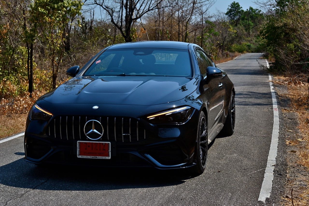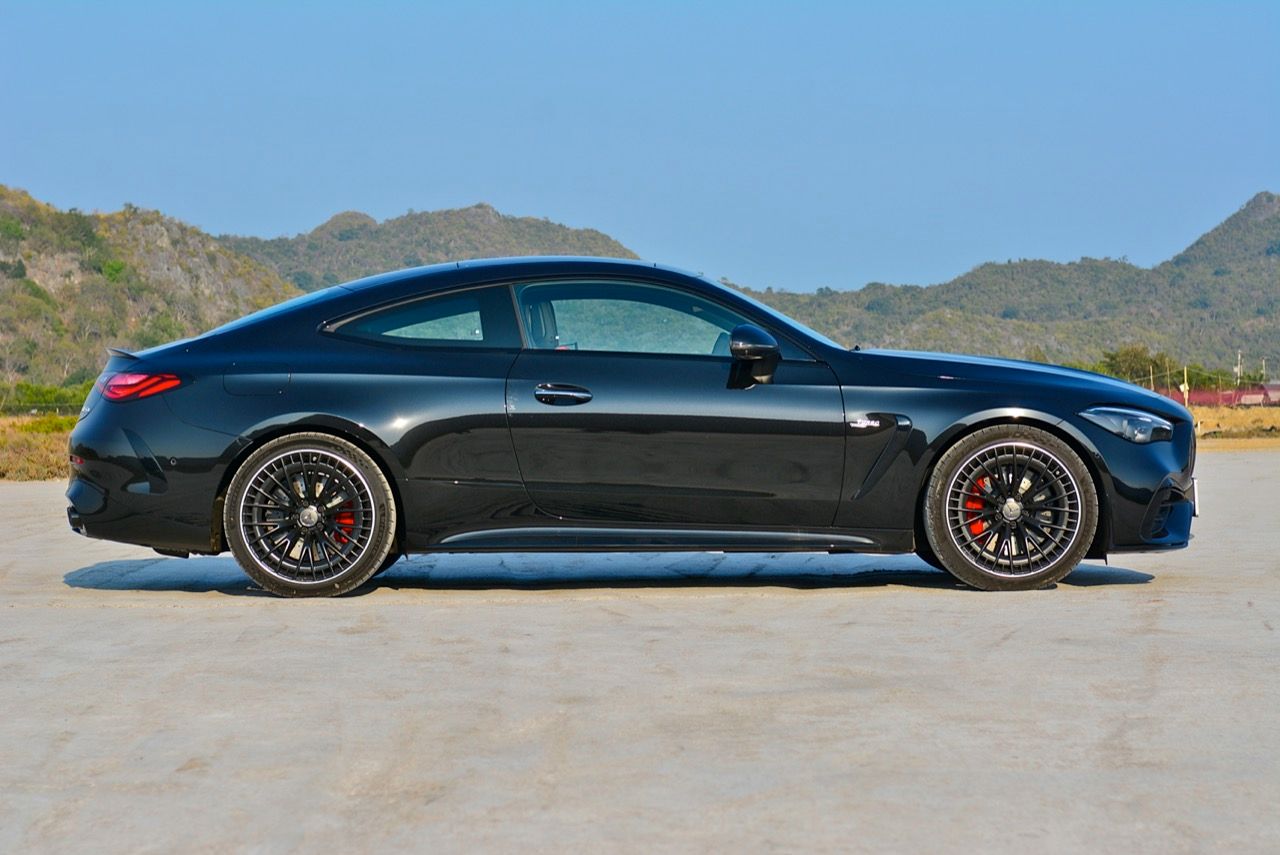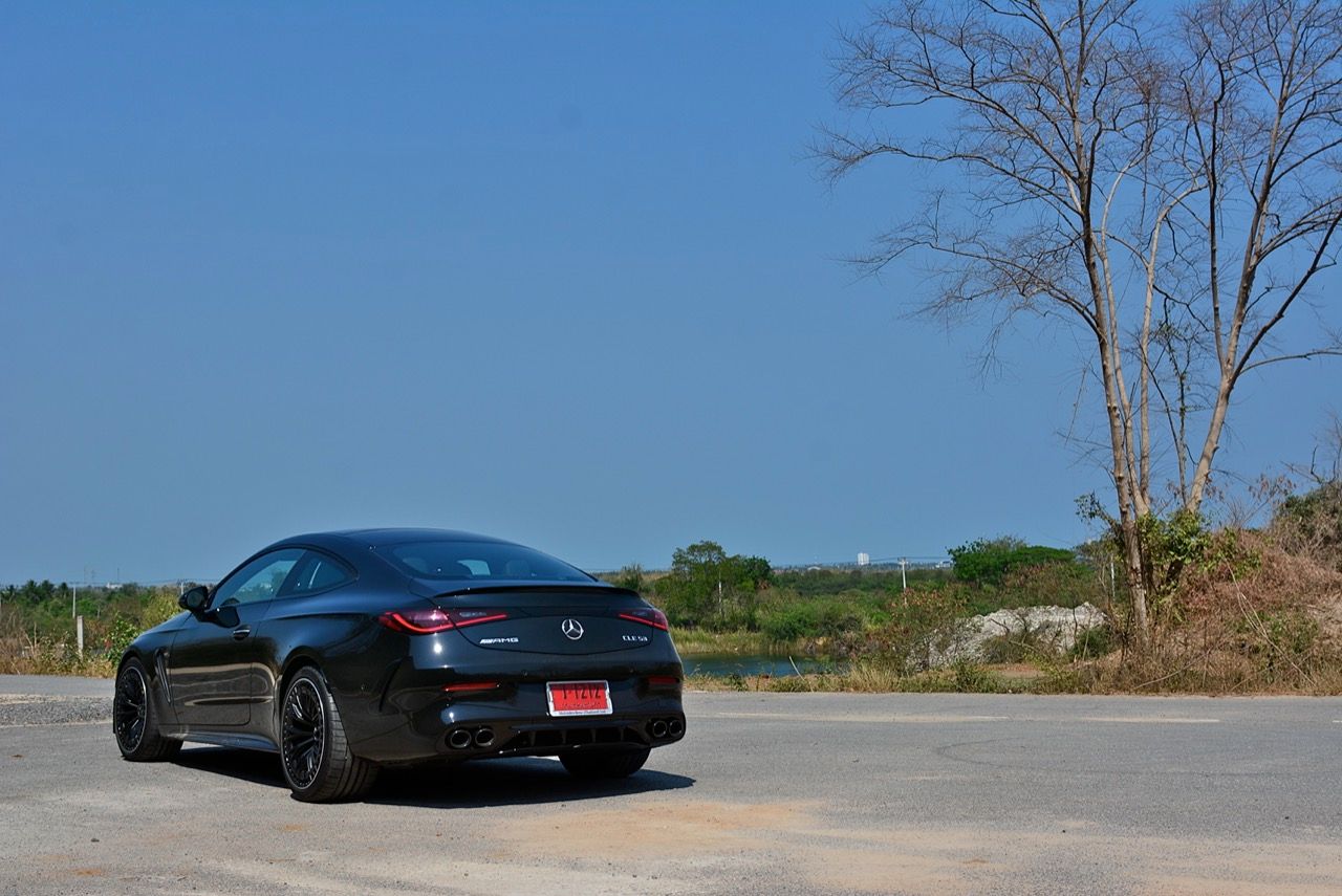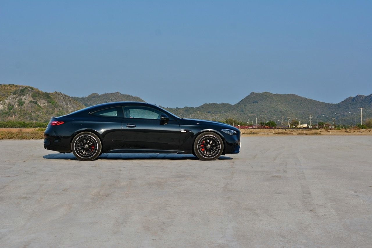 การเอาตรา AMG มาติด บ่งบอกถึงพละกำลัง Mercedes-AMG CLE 53 ตามทฤษฎีแล้วควรจะเป็นรถที่อยู่ตรงกลางระหว่างรุ่น 63 และ 43 ต้องให้ความรู้สึกสปอร์ต แต่ไม่ดุดันเท่า C 63 เป็นรถหรูสำหรับใช้งานทั่วไปที่เน้นความหล่อและพลังการทำความเร็ว แต่ตัวมันหนักกว่า CLE 300 ทำให้การขับในเมือง เครื่องสี่สูบ 2.0 ลิตร ของ CLE 300 ดูจะคล่องแคล่วมากกว่าเครื่องหกสูบ 3.0 ลิตร ของ AMG CLE 53 ซึ่งมาพร้อมกับของหนักๆอย่าง Mild Hybrid 48V เมื่อมองอย่างตั้งใจ แค่รูปลักษณ์ภายนอกก็บอกสายตาและสมองของคุณแล้วว่า นี่คือ CLE 53 ใหม่ที่เข้ามาแทน E53 กับ CLS53 มันนำเอาพื้นฐานของ CLE Coupe รถสองประตูสุดหรูที่ Mercedes ทำออกมาได้ดี มาเพิ่มความดุดัน ขยับฐานล้อให้กว้างขึ้น (ด้านหน้าเพิ่มขึ้น 58 มม. ด้านหลัง 75 มม.) ยางหลังขนาด 295 ในล้อ 21 ทำให้ซุ้มล้อดูใหญ่ราวกับรถแข่ง ท่าทางโดยรวมของ CLE 53 แทบจะไม่ต่างจาก C63 AMG Coupe รุ่นเก่า นี่คือรถที่ดูเร้าใจ โดยเฉพาะตัวถังสีดำ