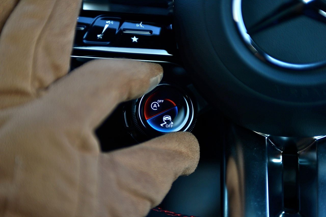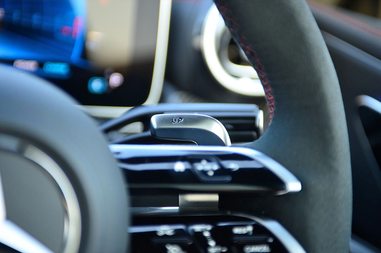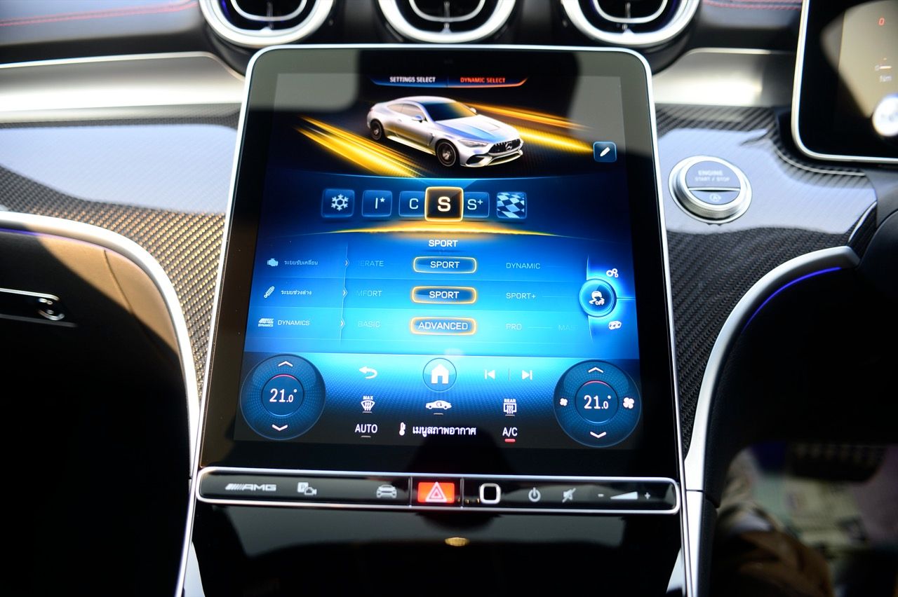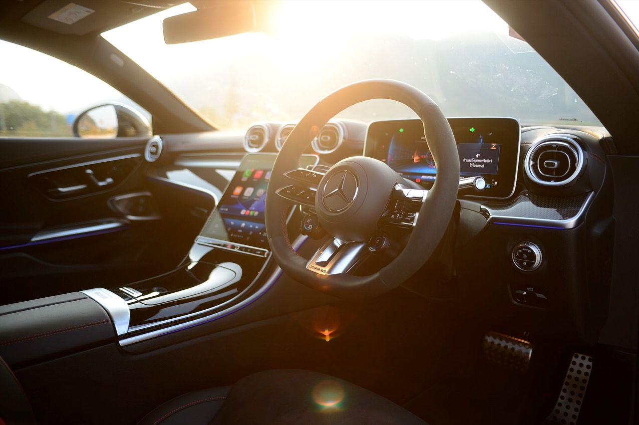 พวงมาลัยและชุดแป้นเหยียบ (The Command Center) พวงมาลัย AMG Performance ดีไซน์ฐานตัด (Flat-bottom) หุ้มด้วยหนัง Nappa หรือหนัง Microcut (ขึ้นอยู่กับแพ็กเกจ) ก้านพวงมาลัยคู่ และปุ่ม AMG Drive Unit วงกลม 2 ปุ่มที่ด้านล่างสำหรับปรับโหมดขับขี่และวาล์วท่อไอเสียโดยไม่ต้องละมือจากพวงมาลัย แป้นเบรกและคันเร่ง ทำจากวัสดุ Stainless Steel แบบปัดเงา พร้อมปุ่มยางกันลื่น (Rubber Studs) ให้ความรู้สึกสปอร์ตและมั่นใจในการเหยียบ