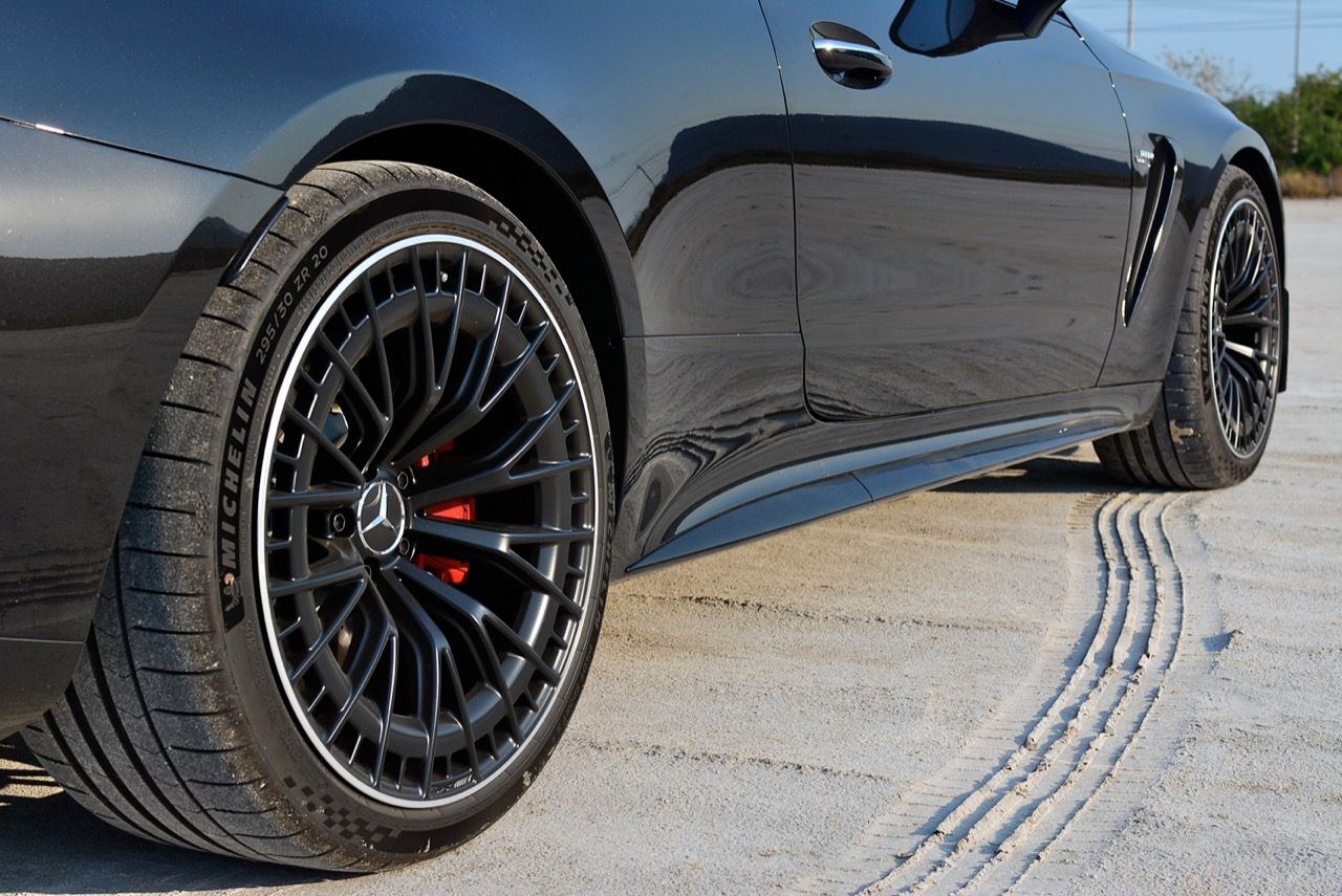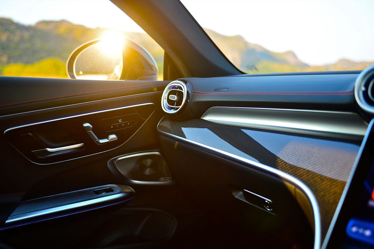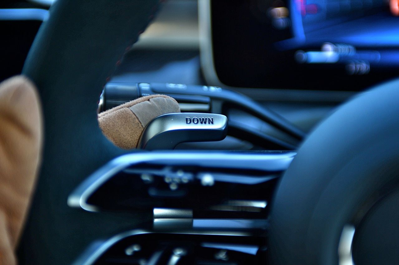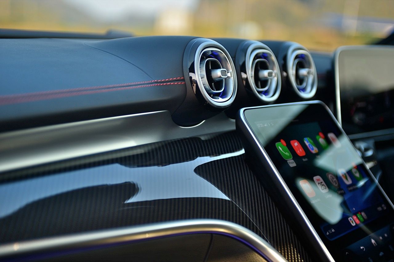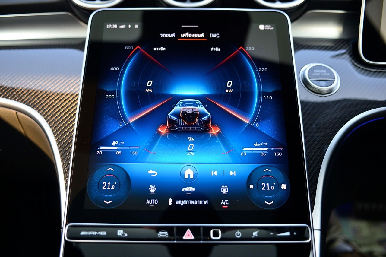 พวงมาลัยและชุดแป้นเหยียบ (The Command Center) พวงมาลัย AMG Performance ดีไซน์ฐานตัด (Flat-bottom) หุ้มด้วยหนัง Nappa หรือหนัง Microcut (ขึ้นอยู่กับแพ็กเกจ) ก้านพวงมาลัยคู่ และปุ่ม AMG Drive Unit วงกลม 2 ปุ่มที่ด้านล่างสำหรับปรับโหมดขับขี่และวาล์วท่อไอเสียโดยไม่ต้องละมือจากพวงมาลัย แป้นเบรกและคันเร่ง ทำจากวัสดุ Stainless Steel แบบปัดเงา พร้อมปุ่มยางกันลื่น (Rubber Studs) ให้ความรู้สึกสปอร์ตและมั่นใจในการเหยียบ